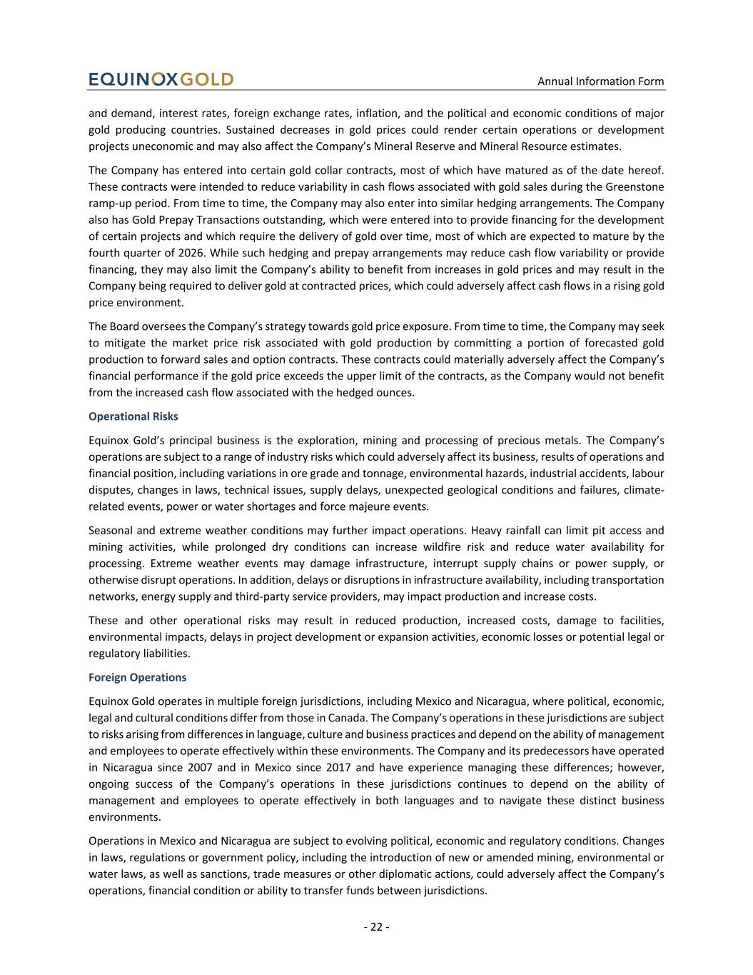 Annual Information Form - 22 - and demand, interest rates, foreign exchange rates, inflation, and the political and economic conditions of major gold producing countries. Sustained decreases in gold prices could render certain operations or development projects uneconomic and may also affect the Company’s Mineral Reserve and Mineral Resource estimates. The Company has entered into certain gold collar contracts, most of which have matured as of the date hereof. These contracts were intended to reduce variability in cash flows associated with gold sales during the Greenstone ramp-up period. From time to time, the Company may also enter into similar hedging arrangements. The Company also has Gold Prepay Transactions outstanding, which were entered into to provide financing for the development of certain projects and which require the delivery of gold over time, most of which are expected to mature by the fourth quarter of 2026. While such hedging and prepay arrangements may reduce cash flow variability or provide financing, they may also limit the Company’s ability to benefit from increases in gold prices and may result in the Company being required to deliver gold at contracted prices, which could adversely affect cash flows in a rising gold price environment. The Board oversees the Company’s strategy towards gold price exposure. From time to time, the Company may seek to mitigate the market price risk associated with gold production by committing a portion of forecasted gold production to forward sales and option contracts. These contracts could materially adversely affect the Company’s financial performance if the gold price exceeds the upper limit of the contracts, as the Company would not benefit from the increased cash flow associated with the hedged ounces. Operational Risks Equinox Gold’s principal business is the exploration, mining and processing of precious metals. The Company’s operations are subject to a range of industry risks which could adversely affect its business, results of operations and financial position, including variations in ore grade and tonnage, environmental hazards, industrial accidents, labour disputes, changes in laws, technical issues, supply delays, unexpected geological conditions and failures, climate- related events, power or water shortages and force majeure events. Seasonal and extreme weather conditions may further impact operations. Heavy rainfall can limit pit access and mining activities, while prolonged dry conditions can increase wildfire risk and reduce water availability for processing. Extreme weather events may damage infrastructure, interrupt supply chains or power supply, or otherwise disrupt operations. In addition, delays or disruptions in infrastructure availability, including transportation networks, energy supply and third-party service providers, may impact production and increase costs. These and other operational risks may result in reduced production, increased costs, damage to facilities, environmental impacts, delays in project development or expansion activities, economic losses or potential legal or regulatory liabilities. Foreign Operations Equinox Gold operates in multiple foreign jurisdictions, including Mexico and Nicaragua, where political, economic, legal and cultural conditions differ from those in Canada. The Company’s operations in these jurisdictions are subject to risks arising from differences in language, culture and business practices and depend on the ability of management and employees to operate effectively within these environments. The Company and its predecessors have operated in Nicaragua since 2007 and in Mexico since 2017 and have experience managing these differences; however, ongoing success of the Company’s operations in these jurisdictions continues to depend on the ability of management and employees to operate effectively in both languages and to navigate these distinct business environments. Operations in Mexico and Nicaragua are subject to evolving political, economic and regulatory conditions. Changes in laws, regulations or government policy, including the introduction of new or amended mining, environmental or water laws, as well as sanctions, trade measures or other diplomatic actions, could adversely affect the Company’s operations, financial condition or ability to transfer funds between jurisdictions.