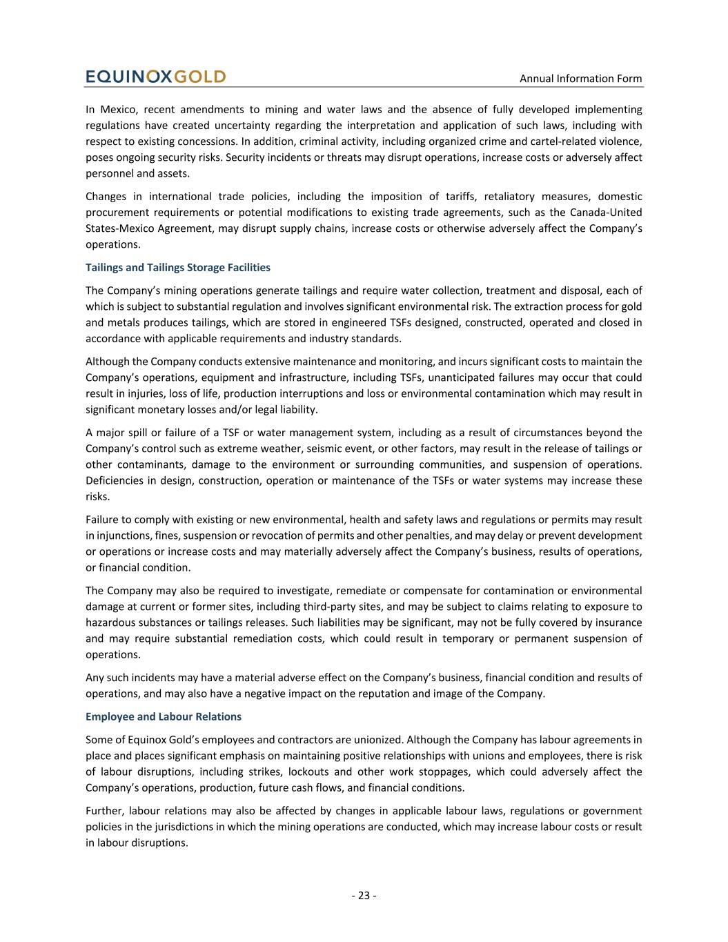 Annual Information Form - 23 - In Mexico, recent amendments to mining and water laws and the absence of fully developed implementing regulations have created uncertainty regarding the interpretation and application of such laws, including with respect to existing concessions. In addition, criminal activity, including organized crime and cartel-related violence, poses ongoing security risks. Security incidents or threats may disrupt operations, increase costs or adversely affect personnel and assets. Changes in international trade policies, including the imposition of tariffs, retaliatory measures, domestic procurement requirements or potential modifications to existing trade agreements, such as the Canada-United States-Mexico Agreement, may disrupt supply chains, increase costs or otherwise adversely affect the Company’s operations. Tailings and Tailings Storage Facilities The Company’s mining operations generate tailings and require water collection, treatment and disposal, each of which is subject to substantial regulation and involves significant environmental risk. The extraction process for gold and metals produces tailings, which are stored in engineered TSFs designed, constructed, operated and closed in accordance with applicable requirements and industry standards. Although the Company conducts extensive maintenance and monitoring, and incurs significant costs to maintain the Company’s operations, equipment and infrastructure, including TSFs, unanticipated failures may occur that could result in injuries, loss of life, production interruptions and loss or environmental contamination which may result in significant monetary losses and/or legal liability. A major spill or failure of a TSF or water management system, including as a result of circumstances beyond the Company’s control such as extreme weather, seismic event, or other factors, may result in the release of tailings or other contaminants, damage to the environment or surrounding communities, and suspension of operations. Deficiencies in design, construction, operation or maintenance of the TSFs or water systems may increase these risks. Failure to comply with existing or new environmental, health and safety laws and regulations or permits may result in injunctions, fines, suspension or revocation of permits and other penalties, and may delay or prevent development or operations or increase costs and may materially adversely affect the Company’s business, results of operations, or financial condition. The Company may also be required to investigate, remediate or compensate for contamination or environmental damage at current or former sites, including third-party sites, and may be subject to claims relating to exposure to hazardous substances or tailings releases. Such liabilities may be significant, may not be fully covered by insurance and may require substantial remediation costs, which could result in temporary or permanent suspension of operations. Any such incidents may have a material adverse effect on the Company’s business, financial condition and results of operations, and may also have a negative impact on the reputation and image of the Company. Employee and Labour Relations Some of Equinox Gold’s employees and contractors are unionized. Although the Company has labour agreements in place and places significant emphasis on maintaining positive relationships with unions and employees, there is risk of labour disruptions, including strikes, lockouts and other work stoppages, which could adversely affect the Company’s operations, production, future cash flows, and financial conditions. Further, labour relations may also be affected by changes in applicable labour laws, regulations or government policies in the jurisdictions in which the mining operations are conducted, which may increase labour costs or result in labour disruptions.