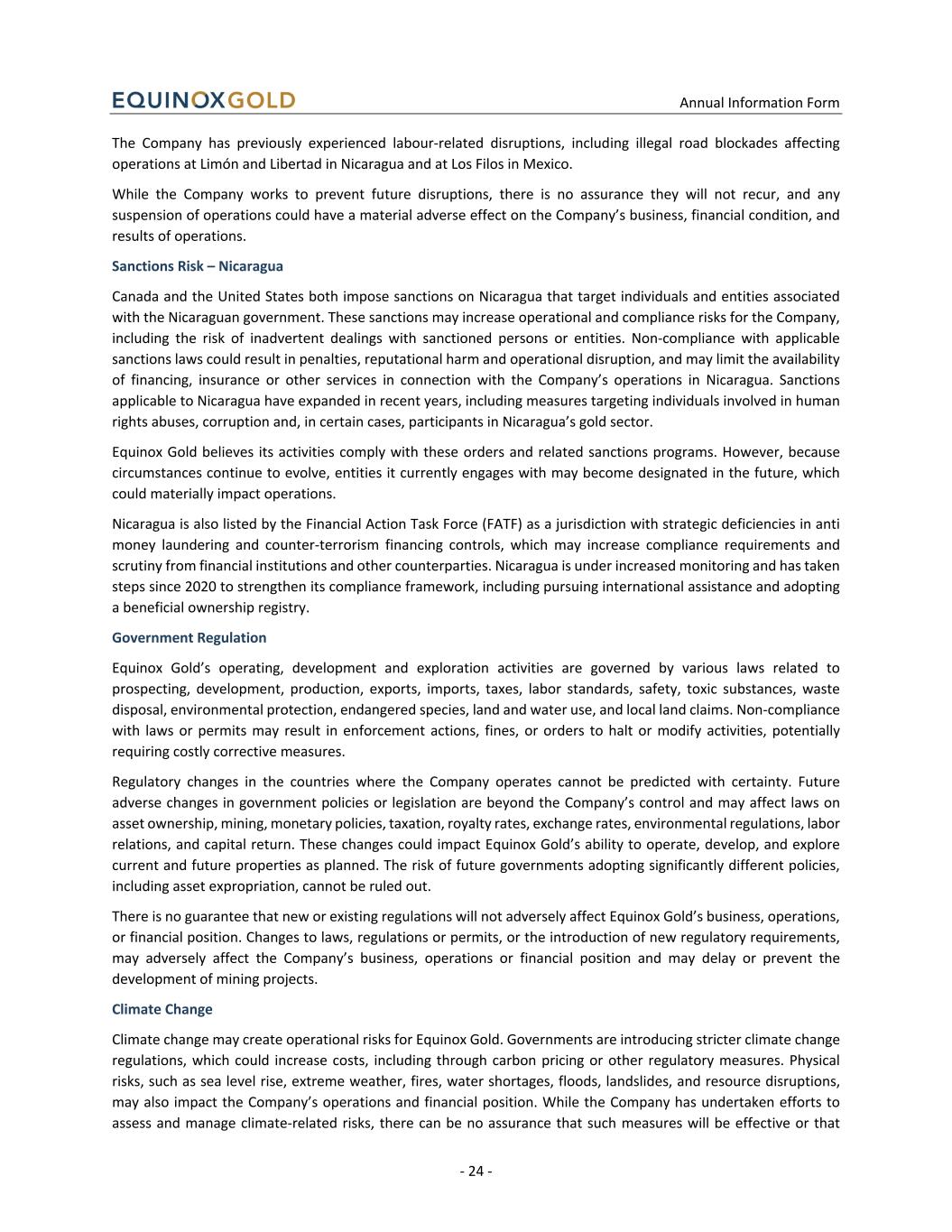 Annual Information Form - 24 - The Company has previously experienced labour-related disruptions, including illegal road blockades affecting operations at Limón and Libertad in Nicaragua and at Los Filos in Mexico. While the Company works to prevent future disruptions, there is no assurance they will not recur, and any suspension of operations could have a material adverse effect on the Company’s business, financial condition, and results of operations. Sanctions Risk – Nicaragua Canada and the United States both impose sanctions on Nicaragua that target individuals and entities associated with the Nicaraguan government. These sanctions may increase operational and compliance risks for the Company, including the risk of inadvertent dealings with sanctioned persons or entities. Non-compliance with applicable sanctions laws could result in penalties, reputational harm and operational disruption, and may limit the availability of financing, insurance or other services in connection with the Company’s operations in Nicaragua. Sanctions applicable to Nicaragua have expanded in recent years, including measures targeting individuals involved in human rights abuses, corruption and, in certain cases, participants in Nicaragua’s gold sector. Equinox Gold believes its activities comply with these orders and related sanctions programs. However, because circumstances continue to evolve, entities it currently engages with may become designated in the future, which could materially impact operations. Nicaragua is also listed by the Financial Action Task Force (FATF) as a jurisdiction with strategic deficiencies in anti money laundering and counter-terrorism financing controls, which may increase compliance requirements and scrutiny from financial institutions and other counterparties. Nicaragua is under increased monitoring and has taken steps since 2020 to strengthen its compliance framework, including pursuing international assistance and adopting a beneficial ownership registry. Government Regulation Equinox Gold’s operating, development and exploration activities are governed by various laws related to prospecting, development, production, exports, imports, taxes, labor standards, safety, toxic substances, waste disposal, environmental protection, endangered species, land and water use, and local land claims. Non-compliance with laws or permits may result in enforcement actions, fines, or orders to halt or modify activities, potentially requiring costly corrective measures. Regulatory changes in the countries where the Company operates cannot be predicted with certainty. Future adverse changes in government policies or legislation are beyond the Company’s control and may affect laws on asset ownership, mining, monetary policies, taxation, royalty rates, exchange rates, environmental regulations, labor relations, and capital return. These changes could impact Equinox Gold’s ability to operate, develop, and explore current and future properties as planned. The risk of future governments adopting significantly different policies, including asset expropriation, cannot be ruled out. There is no guarantee that new or existing regulations will not adversely affect Equinox Gold’s business, operations, or financial position. Changes to laws, regulations or permits, or the introduction of new regulatory requirements, may adversely affect the Company’s business, operations or financial position and may delay or prevent the development of mining projects. Climate Change Climate change may create operational risks for Equinox Gold. Governments are introducing stricter climate change regulations, which could increase costs, including through carbon pricing or other regulatory measures. Physical risks, such as sea level rise, extreme weather, fires, water shortages, floods, landslides, and resource disruptions, may also impact the Company’s operations and financial position. While the Company has undertaken efforts to assess and manage climate-related risks, there can be no assurance that such measures will be effective or that