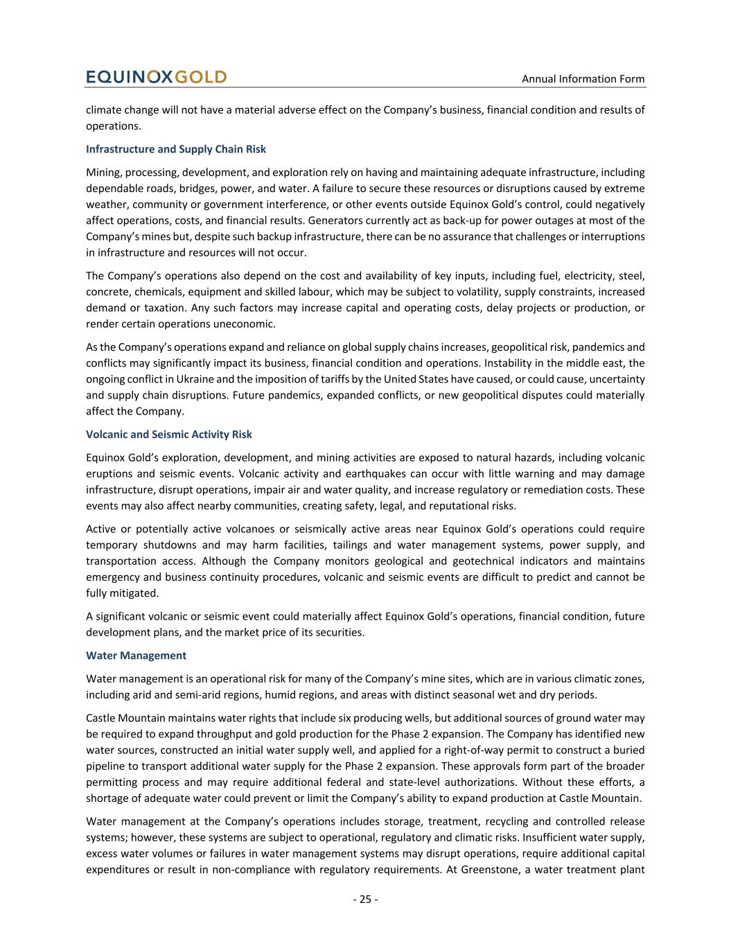 Annual Information Form - 25 - climate change will not have a material adverse effect on the Company’s business, financial condition and results of operations. Infrastructure and Supply Chain Risk Mining, processing, development, and exploration rely on having and maintaining adequate infrastructure, including dependable roads, bridges, power, and water. A failure to secure these resources or disruptions caused by extreme weather, community or government interference, or other events outside Equinox Gold’s control, could negatively affect operations, costs, and financial results. Generators currently act as back-up for power outages at most of the Company’s mines but, despite such backup infrastructure, there can be no assurance that challenges or interruptions in infrastructure and resources will not occur. The Company’s operations also depend on the cost and availability of key inputs, including fuel, electricity, steel, concrete, chemicals, equipment and skilled labour, which may be subject to volatility, supply constraints, increased demand or taxation. Any such factors may increase capital and operating costs, delay projects or production, or render certain operations uneconomic. As the Company’s operations expand and reliance on global supply chains increases, geopolitical risk, pandemics and conflicts may significantly impact its business, financial condition and operations. Instability in the middle east, the ongoing conflict in Ukraine and the imposition of tariffs by the United States have caused, or could cause, uncertainty and supply chain disruptions. Future pandemics, expanded conflicts, or new geopolitical disputes could materially affect the Company. Volcanic and Seismic Activity Risk Equinox Gold’s exploration, development, and mining activities are exposed to natural hazards, including volcanic eruptions and seismic events. Volcanic activity and earthquakes can occur with little warning and may damage infrastructure, disrupt operations, impair air and water quality, and increase regulatory or remediation costs. These events may also affect nearby communities, creating safety, legal, and reputational risks. Active or potentially active volcanoes or seismically active areas near Equinox Gold’s operations could require temporary shutdowns and may harm facilities, tailings and water management systems, power supply, and transportation access. Although the Company monitors geological and geotechnical indicators and maintains emergency and business continuity procedures, volcanic and seismic events are difficult to predict and cannot be fully mitigated. A significant volcanic or seismic event could materially affect Equinox Gold’s operations, financial condition, future development plans, and the market price of its securities. Water Management Water management is an operational risk for many of the Company’s mine sites, which are in various climatic zones, including arid and semi-arid regions, humid regions, and areas with distinct seasonal wet and dry periods. Castle Mountain maintains water rights that include six producing wells, but additional sources of ground water may be required to expand throughput and gold production for the Phase 2 expansion. The Company has identified new water sources, constructed an initial water supply well, and applied for a right-of-way permit to construct a buried pipeline to transport additional water supply for the Phase 2 expansion. These approvals form part of the broader permitting process and may require additional federal and state-level authorizations. Without these efforts, a shortage of adequate water could prevent or limit the Company’s ability to expand production at Castle Mountain. Water management at the Company’s operations includes storage, treatment, recycling and controlled release systems; however, these systems are subject to operational, regulatory and climatic risks. Insufficient water supply, excess water volumes or failures in water management systems may disrupt operations, require additional capital expenditures or result in non-compliance with regulatory requirements. At Greenstone, a water treatment plant