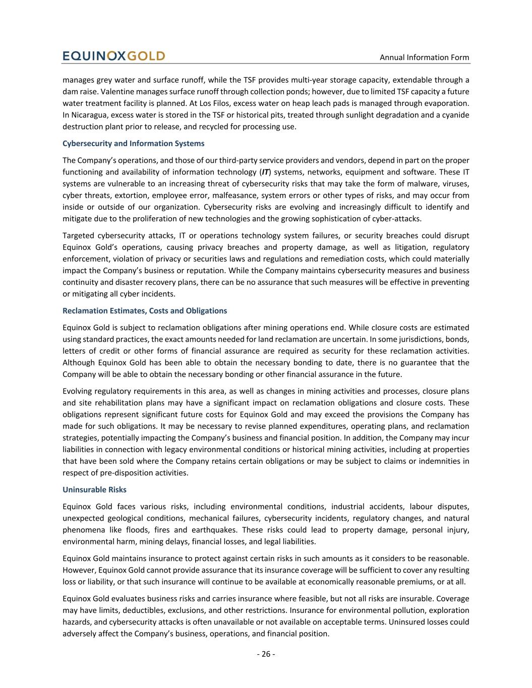 Annual Information Form - 26 - manages grey water and surface runoff, while the TSF provides multi-year storage capacity, extendable through a dam raise. Valentine manages surface runoff through collection ponds; however, due to limited TSF capacity a future water treatment facility is planned. At Los Filos, excess water on heap leach pads is managed through evaporation. In Nicaragua, excess water is stored in the TSF or historical pits, treated through sunlight degradation and a cyanide destruction plant prior to release, and recycled for processing use. Cybersecurity and Information Systems The Company’s operations, and those of our third-party service providers and vendors, depend in part on the proper functioning and availability of information technology (IT) systems, networks, equipment and software. These IT systems are vulnerable to an increasing threat of cybersecurity risks that may take the form of malware, viruses, cyber threats, extortion, employee error, malfeasance, system errors or other types of risks, and may occur from inside or outside of our organization. Cybersecurity risks are evolving and increasingly difficult to identify and mitigate due to the proliferation of new technologies and the growing sophistication of cyber-attacks. Targeted cybersecurity attacks, IT or operations technology system failures, or security breaches could disrupt Equinox Gold’s operations, causing privacy breaches and property damage, as well as litigation, regulatory enforcement, violation of privacy or securities laws and regulations and remediation costs, which could materially impact the Company’s business or reputation. While the Company maintains cybersecurity measures and business continuity and disaster recovery plans, there can be no assurance that such measures will be effective in preventing or mitigating all cyber incidents. Reclamation Estimates, Costs and Obligations Equinox Gold is subject to reclamation obligations after mining operations end. While closure costs are estimated using standard practices, the exact amounts needed for land reclamation are uncertain. In some jurisdictions, bonds, letters of credit or other forms of financial assurance are required as security for these reclamation activities. Although Equinox Gold has been able to obtain the necessary bonding to date, there is no guarantee that the Company will be able to obtain the necessary bonding or other financial assurance in the future. Evolving regulatory requirements in this area, as well as changes in mining activities and processes, closure plans and site rehabilitation plans may have a significant impact on reclamation obligations and closure costs. These obligations represent significant future costs for Equinox Gold and may exceed the provisions the Company has made for such obligations. It may be necessary to revise planned expenditures, operating plans, and reclamation strategies, potentially impacting the Company’s business and financial position. In addition, the Company may incur liabilities in connection with legacy environmental conditions or historical mining activities, including at properties that have been sold where the Company retains certain obligations or may be subject to claims or indemnities in respect of pre-disposition activities. Uninsurable Risks Equinox Gold faces various risks, including environmental conditions, industrial accidents, labour disputes, unexpected geological conditions, mechanical failures, cybersecurity incidents, regulatory changes, and natural phenomena like floods, fires and earthquakes. These risks could lead to property damage, personal injury, environmental harm, mining delays, financial losses, and legal liabilities. Equinox Gold maintains insurance to protect against certain risks in such amounts as it considers to be reasonable. However, Equinox Gold cannot provide assurance that its insurance coverage will be sufficient to cover any resulting loss or liability, or that such insurance will continue to be available at economically reasonable premiums, or at all. Equinox Gold evaluates business risks and carries insurance where feasible, but not all risks are insurable. Coverage may have limits, deductibles, exclusions, and other restrictions. Insurance for environmental pollution, exploration hazards, and cybersecurity attacks is often unavailable or not available on acceptable terms. Uninsured losses could adversely affect the Company’s business, operations, and financial position.