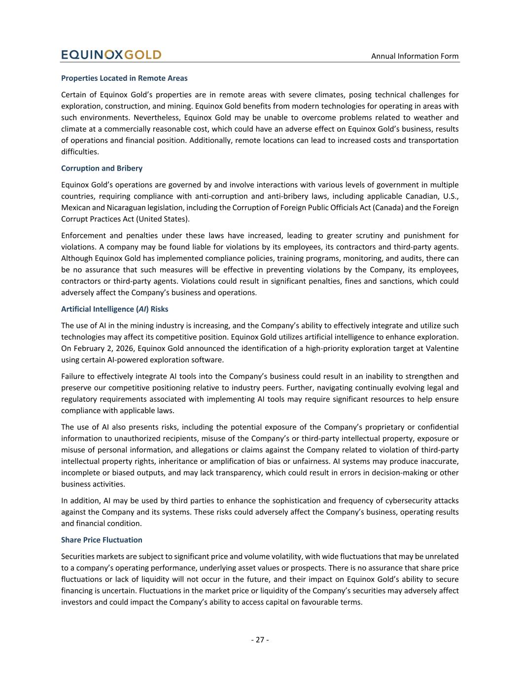 Annual Information Form - 27 - Properties Located in Remote Areas Certain of Equinox Gold’s properties are in remote areas with severe climates, posing technical challenges for exploration, construction, and mining. Equinox Gold benefits from modern technologies for operating in areas with such environments. Nevertheless, Equinox Gold may be unable to overcome problems related to weather and climate at a commercially reasonable cost, which could have an adverse effect on Equinox Gold’s business, results of operations and financial position. Additionally, remote locations can lead to increased costs and transportation difficulties. Corruption and Bribery Equinox Gold’s operations are governed by and involve interactions with various levels of government in multiple countries, requiring compliance with anti-corruption and anti-bribery laws, including applicable Canadian, U.S., Mexican and Nicaraguan legislation, including the Corruption of Foreign Public Officials Act (Canada) and the Foreign Corrupt Practices Act (United States). Enforcement and penalties under these laws have increased, leading to greater scrutiny and punishment for violations. A company may be found liable for violations by its employees, its contractors and third-party agents. Although Equinox Gold has implemented compliance policies, training programs, monitoring, and audits, there can be no assurance that such measures will be effective in preventing violations by the Company, its employees, contractors or third-party agents. Violations could result in significant penalties, fines and sanctions, which could adversely affect the Company’s business and operations. Artificial Intelligence (AI) Risks The use of AI in the mining industry is increasing, and the Company’s ability to effectively integrate and utilize such technologies may affect its competitive position. Equinox Gold utilizes artificial intelligence to enhance exploration. On February 2, 2026, Equinox Gold announced the identification of a high-priority exploration target at Valentine using certain AI-powered exploration software. Failure to effectively integrate AI tools into the Company’s business could result in an inability to strengthen and preserve our competitive positioning relative to industry peers. Further, navigating continually evolving legal and regulatory requirements associated with implementing AI tools may require significant resources to help ensure compliance with applicable laws. The use of AI also presents risks, including the potential exposure of the Company’s proprietary or confidential information to unauthorized recipients, misuse of the Company’s or third-party intellectual property, exposure or misuse of personal information, and allegations or claims against the Company related to violation of third-party intellectual property rights, inheritance or amplification of bias or unfairness. AI systems may produce inaccurate, incomplete or biased outputs, and may lack transparency, which could result in errors in decision-making or other business activities. In addition, AI may be used by third parties to enhance the sophistication and frequency of cybersecurity attacks against the Company and its systems. These risks could adversely affect the Company’s business, operating results and financial condition. Share Price Fluctuation Securities markets are subject to significant price and volume volatility, with wide fluctuations that may be unrelated to a company’s operating performance, underlying asset values or prospects. There is no assurance that share price fluctuations or lack of liquidity will not occur in the future, and their impact on Equinox Gold’s ability to secure financing is uncertain. Fluctuations in the market price or liquidity of the Company’s securities may adversely affect investors and could impact the Company’s ability to access capital on favourable terms.