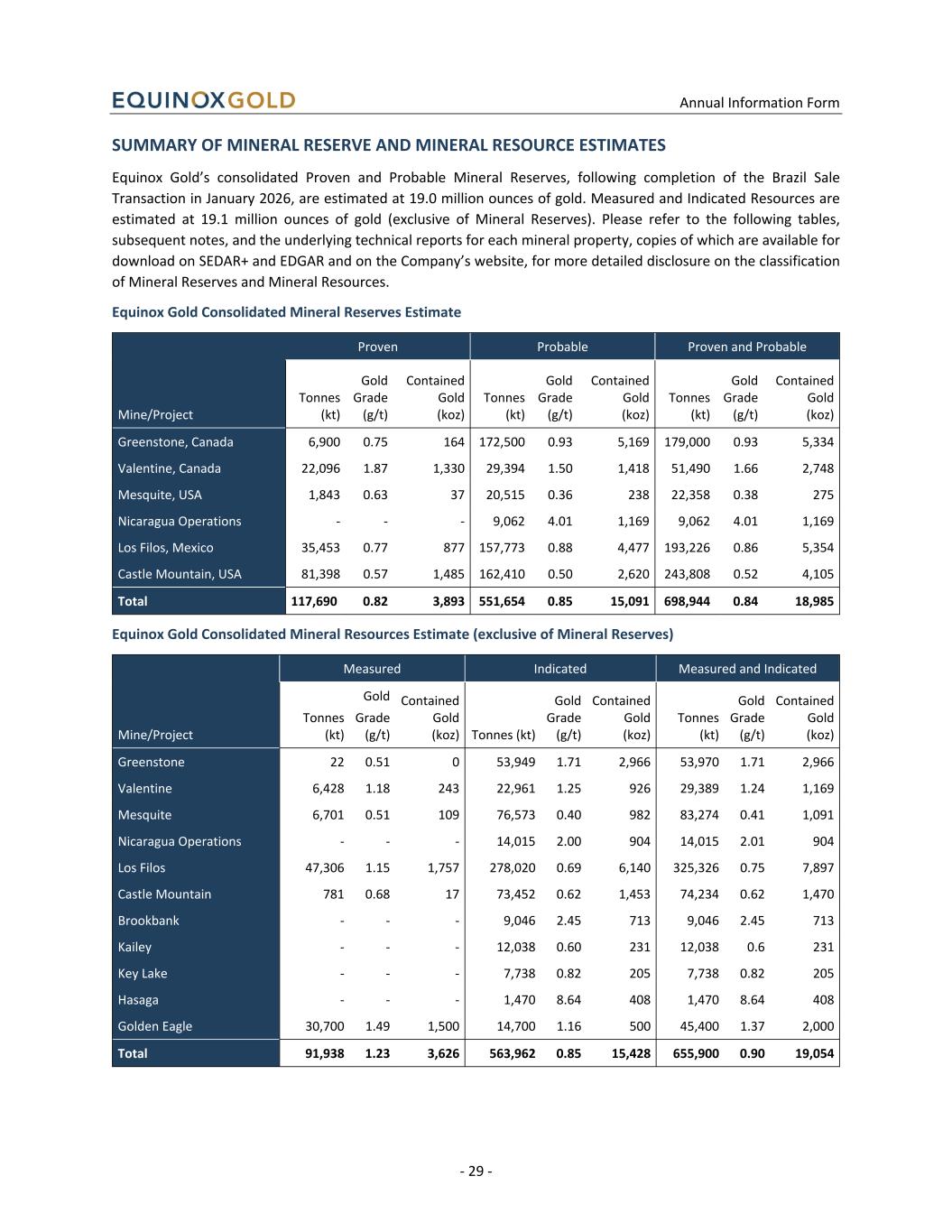 Annual Information Form - 29 - SUMMARY OF MINERAL RESERVE AND MINERAL RESOURCE ESTIMATES Equinox Gold’s consolidated Proven and Probable Mineral Reserves, following completion of the Brazil Sale Transaction in January 2026, are estimated at 19.0 million ounces of gold. Measured and Indicated Resources are estimated at 19.1 million ounces of gold (exclusive of Mineral Reserves). Please refer to the following tables, subsequent notes, and the underlying technical reports for each mineral property, copies of which are available for download on SEDAR+ and EDGAR and on the Company’s website, for more detailed disclosure on the classification of Mineral Reserves and Mineral Resources. Equinox Gold Consolidated Mineral Reserves Estimate Mine/Project Proven Probable Proven and Probable Tonnes (kt) Gold Grade (g/t) Contained Gold (koz) Tonnes (kt) Gold Grade (g/t) Contained Gold (koz) Tonnes (kt) Gold Grade (g/t) Contained Gold (koz) Greenstone, Canada 6,900 0.75 164 172,500 0.93 5,169 179,000 0.93 5,334 Valentine, Canada 22,096 1.87 1,330 29,394 1.50 1,418 51,490 1.66 2,748 Mesquite, USA 1,843 0.63 37 20,515 0.36 238 22,358 0.38 275 Nicaragua Operations - - - 9,062 4.01 1,169 9,062 4.01 1,169 Los Filos, Mexico 35,453 0.77 877 157,773 0.88 4,477 193,226 0.86 5,354 Castle Mountain, USA 81,398 0.57 1,485 162,410 0.50 2,620 243,808 0.52 4,105 Total 117,690 0.82 3,893 551,654 0.85 15,091 698,944 0.84 18,985 Equinox Gold Consolidated Mineral Resources Estimate (exclusive of Mineral Reserves) Mine/Project Measured Indicated Measured and Indicated Tonnes (kt) Gold Grade (g/t) Contained Gold (koz) Tonnes (kt) Gold Grade (g/t) Contained Gold (koz) Tonnes (kt) Gold Grade (g/t) Contained Gold (koz) Greenstone 22 0.51 0 53,949 1.71 2,966 53,970 1.71 2,966 Valentine 6,428 1.18 243 22,961 1.25 926 29,389 1.24 1,169 Mesquite 6,701 0.51 109 76,573 0.40 982 83,274 0.41 1,091 Nicaragua Operations - - - 14,015 2.00 904 14,015 2.01 904 Los Filos 47,306 1.15 1,757 278,020 0.69 6,140 325,326 0.75 7,897 Castle Mountain 781 0.68 17 73,452 0.62 1,453 74,234 0.62 1,470 Brookbank - - - 9,046 2.45 713 9,046 2.45 713 Kailey - - - 12,038 0.60 231 12,038 0.6 231 Key Lake - - - 7,738 0.82 205 7,738 0.82 205 Hasaga - - - 1,470 8.64 408 1,470 8.64 408 Golden Eagle 30,700 1.49 1,500 14,700 1.16 500 45,400 1.37 2,000 Total 91,938 1.23 3,626 563,962 0.85 15,428 655,900 0.90 19,054