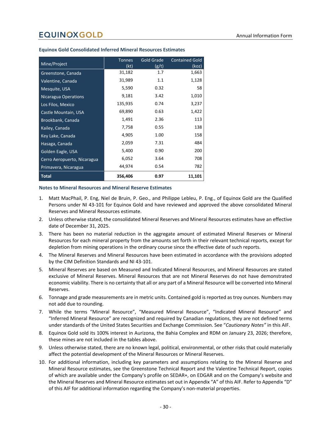 Annual Information Form - 30 - Equinox Gold Consolidated Inferred Mineral Resources Estimates Mine/Project Tonnes (kt) Gold Grade (g/t) Contained Gold (koz) Greenstone, Canada 31,182 1.7 1,663 Valentine, Canada 31,989 1.1 1,128 Mesquite, USA 5,590 0.32 58 Nicaragua Operations 9,181 3.42 1,010 Los Filos, Mexico 135,935 0.74 3,237 Castle Mountain, USA 69,890 0.63 1,422 Brookbank, Canada 1,491 2.36 113 Kailey, Canada 7,758 0.55 138 Key Lake, Canada 4,905 1.00 158 Hasaga, Canada 2,059 7.31 484 Golden Eagle, USA 5,400 0.90 200 Cerro Aeropuerto, Nicaragua 6,052 3.64 708 Primavera, Nicaragua 44,974 0.54 782 Total 356,406 0.97 11,101 Notes to Mineral Resources and Mineral Reserve Estimates 1. Matt MacPhail, P. Eng, Niel de Bruin, P. Geo., and Philippe Lebleu, P. Eng., of Equinox Gold are the Qualified Persons under NI 43-101 for Equinox Gold and have reviewed and approved the above consolidated Mineral Reserves and Mineral Resources estimate. 2. Unless otherwise stated, the consolidated Mineral Reserves and Mineral Resources estimates have an effective date of December 31, 2025. 3. There has been no material reduction in the aggregate amount of estimated Mineral Reserves or Mineral Resources for each mineral property from the amounts set forth in their relevant technical reports, except for depletion from mining operations in the ordinary course since the effective date of such reports. 4. The Mineral Reserves and Mineral Resources have been estimated in accordance with the provisions adopted by the CIM Definition Standards and NI 43-101. 5. Mineral Reserves are based on Measured and Indicated Mineral Resources, and Mineral Resources are stated exclusive of Mineral Reserves. Mineral Resources that are not Mineral Reserves do not have demonstrated economic viability. There is no certainty that all or any part of a Mineral Resource will be converted into Mineral Reserves. 6. Tonnage and grade measurements are in metric units. Contained gold is reported as troy ounces. Numbers may not add due to rounding. 7. While the terms “Mineral Resource”, “Measured Mineral Resource”, “Indicated Mineral Resource” and “Inferred Mineral Resource” are recognized and required by Canadian regulations, they are not defined terms under standards of the United States Securities and Exchange Commission. See “Cautionary Notes” in this AIF. 8. Equinox Gold sold its 100% interest in Aurizona, the Bahia Complex and RDM on January 23, 2026; therefore, these mines are not included in the tables above. 9. Unless otherwise stated, there are no known legal, political, environmental, or other risks that could materially affect the potential development of the Mineral Resources or Mineral Reserves. 10. For additional information, including key parameters and assumptions relating to the Mineral Reserve and Mineral Resource estimates, see the Greenstone Technical Report and the Valentine Technical Report, copies of which are available under the Company’s profile on SEDAR+, on EDGAR and on the Company’s website and the Mineral Reserves and Mineral Resource estimates set out in Appendix “A” of this AIF. Refer to Appendix “D” of this AIF for additional information regarding the Company’s non-material properties.