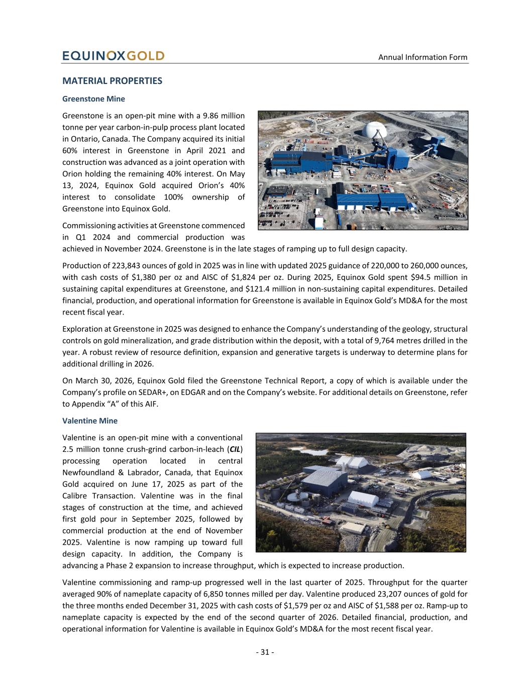 Annual Information Form - 31 - MATERIAL PROPERTIES Greenstone Mine Greenstone is an open-pit mine with a 9.86 million tonne per year carbon-in-pulp process plant located in Ontario, Canada. The Company acquired its initial 60% interest in Greenstone in April 2021 and construction was advanced as a joint operation with Orion holding the remaining 40% interest. On May 13, 2024, Equinox Gold acquired Orion’s 40% interest to consolidate 100% ownership of Greenstone into Equinox Gold. Commissioning activities at Greenstone commenced in Q1 2024 and commercial production was achieved in November 2024. Greenstone is in the late stages of ramping up to full design capacity. Production of 223,843 ounces of gold in 2025 was in line with updated 2025 guidance of 220,000 to 260,000 ounces, with cash costs of $1,380 per oz and AISC of $1,824 per oz. During 2025, Equinox Gold spent $94.5 million in sustaining capital expenditures at Greenstone, and $121.4 million in non-sustaining capital expenditures. Detailed financial, production, and operational information for Greenstone is available in Equinox Gold’s MD&A for the most recent fiscal year. Exploration at Greenstone in 2025 was designed to enhance the Company’s understanding of the geology, structural controls on gold mineralization, and grade distribution within the deposit, with a total of 9,764 metres drilled in the year. A robust review of resource definition, expansion and generative targets is underway to determine plans for additional drilling in 2026. On March 30, 2026, Equinox Gold filed the Greenstone Technical Report, a copy of which is available under the Company’s profile on SEDAR+, on EDGAR and on the Company’s website. For additional details on Greenstone, refer to Appendix “A” of this AIF. Valentine Mine Valentine is an open-pit mine with a conventional 2.5 million tonne crush-grind carbon-in-leach (CIL) processing operation located in central Newfoundland & Labrador, Canada, that Equinox Gold acquired on June 17, 2025 as part of the Calibre Transaction. Valentine was in the final stages of construction at the time, and achieved first gold pour in September 2025, followed by commercial production at the end of November 2025. Valentine is now ramping up toward full design capacity. In addition, the Company is advancing a Phase 2 expansion to increase throughput, which is expected to increase production. Valentine commissioning and ramp-up progressed well in the last quarter of 2025. Throughput for the quarter averaged 90% of nameplate capacity of 6,850 tonnes milled per day. Valentine produced 23,207 ounces of gold for the three months ended December 31, 2025 with cash costs of $1,579 per oz and AISC of $1,588 per oz. Ramp-up to nameplate capacity is expected by the end of the second quarter of 2026. Detailed financial, production, and operational information for Valentine is available in Equinox Gold’s MD&A for the most recent fiscal year.