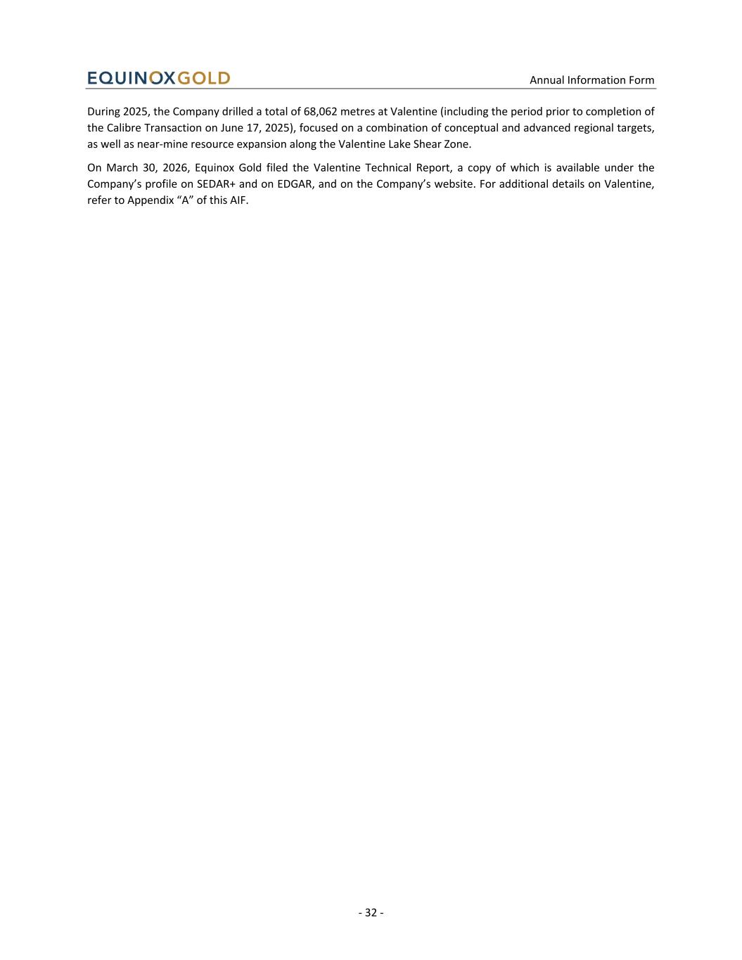 Annual Information Form - 32 - During 2025, the Company drilled a total of 68,062 metres at Valentine (including the period prior to completion of the Calibre Transaction on June 17, 2025), focused on a combination of conceptual and advanced regional targets, as well as near-mine resource expansion along the Valentine Lake Shear Zone. On March 30, 2026, Equinox Gold filed the Valentine Technical Report, a copy of which is available under the Company’s profile on SEDAR+ and on EDGAR, and on the Company’s website. For additional details on Valentine, refer to Appendix “A” of this AIF.