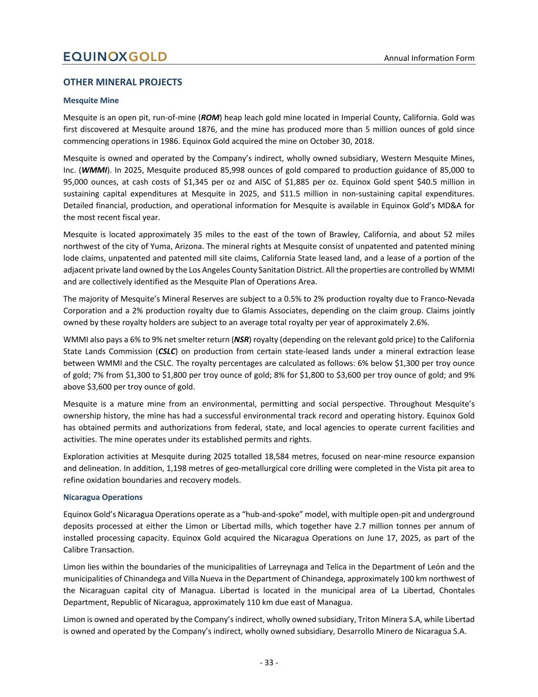 Annual Information Form - 33 - OTHER MINERAL PROJECTS Mesquite Mine Mesquite is an open pit, run-of-mine (ROM) heap leach gold mine located in Imperial County, California. Gold was first discovered at Mesquite around 1876, and the mine has produced more than 5 million ounces of gold since commencing operations in 1986. Equinox Gold acquired the mine on October 30, 2018. Mesquite is owned and operated by the Company’s indirect, wholly owned subsidiary, Western Mesquite Mines, Inc. (WMMI). In 2025, Mesquite produced 85,998 ounces of gold compared to production guidance of 85,000 to 95,000 ounces, at cash costs of $1,345 per oz and AISC of $1,885 per oz. Equinox Gold spent $40.5 million in sustaining capital expenditures at Mesquite in 2025, and $11.5 million in non-sustaining capital expenditures. Detailed financial, production, and operational information for Mesquite is available in Equinox Gold’s MD&A for the most recent fiscal year. Mesquite is located approximately 35 miles to the east of the town of Brawley, California, and about 52 miles northwest of the city of Yuma, Arizona. The mineral rights at Mesquite consist of unpatented and patented mining lode claims, unpatented and patented mill site claims, California State leased land, and a lease of a portion of the adjacent private land owned by the Los Angeles County Sanitation District. All the properties are controlled by WMMI and are collectively identified as the Mesquite Plan of Operations Area. The majority of Mesquite’s Mineral Reserves are subject to a 0.5% to 2% production royalty due to Franco-Nevada Corporation and a 2% production royalty due to Glamis Associates, depending on the claim group. Claims jointly owned by these royalty holders are subject to an average total royalty per year of approximately 2.6%. WMMI also pays a 6% to 9% net smelter return (NSR) royalty (depending on the relevant gold price) to the California State Lands Commission (CSLC) on production from certain state-leased lands under a mineral extraction lease between WMMI and the CSLC. The royalty percentages are calculated as follows: 6% below $1,300 per troy ounce of gold; 7% from $1,300 to $1,800 per troy ounce of gold; 8% for $1,800 to $3,600 per troy ounce of gold; and 9% above $3,600 per troy ounce of gold. Mesquite is a mature mine from an environmental, permitting and social perspective. Throughout Mesquite’s ownership history, the mine has had a successful environmental track record and operating history. Equinox Gold has obtained permits and authorizations from federal, state, and local agencies to operate current facilities and activities. The mine operates under its established permits and rights. Exploration activities at Mesquite during 2025 totalled 18,584 metres, focused on near-mine resource expansion and delineation. In addition, 1,198 metres of geo-metallurgical core drilling were completed in the Vista pit area to refine oxidation boundaries and recovery models. Nicaragua Operations Equinox Gold’s Nicaragua Operations operate as a “hub-and-spoke” model, with multiple open-pit and underground deposits processed at either the Limon or Libertad mills, which together have 2.7 million tonnes per annum of installed processing capacity. Equinox Gold acquired the Nicaragua Operations on June 17, 2025, as part of the Calibre Transaction. Limon lies within the boundaries of the municipalities of Larreynaga and Telica in the Department of Leόn and the municipalities of Chinandega and Villa Nueva in the Department of Chinandega, approximately 100 km northwest of the Nicaraguan capital city of Managua. Libertad is located in the municipal area of La Libertad, Chontales Department, Republic of Nicaragua, approximately 110 km due east of Managua. Limon is owned and operated by the Company’s indirect, wholly owned subsidiary, Triton Minera S.A, while Libertad is owned and operated by the Company’s indirect, wholly owned subsidiary, Desarrollo Minero de Nicaragua S.A.