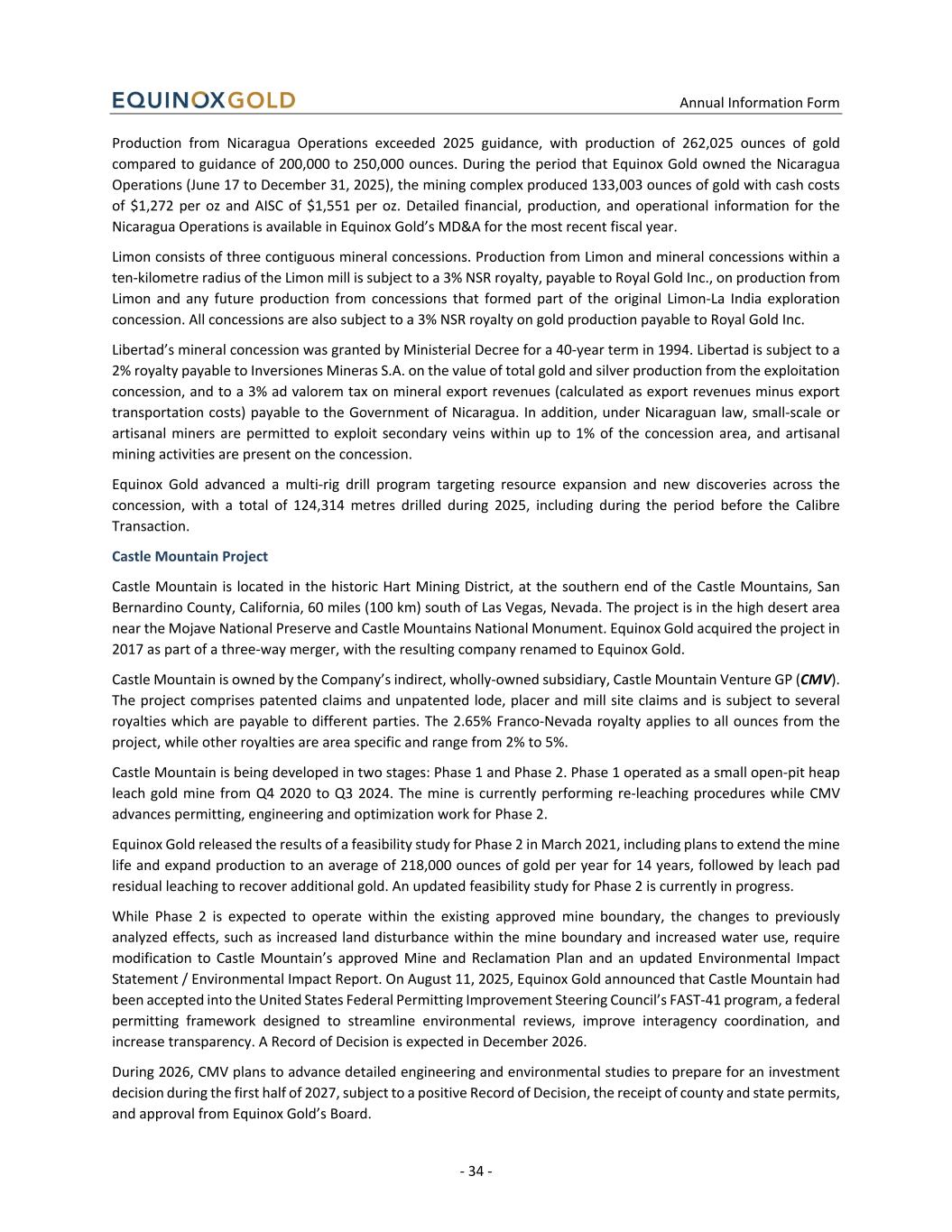 Annual Information Form - 34 - Production from Nicaragua Operations exceeded 2025 guidance, with production of 262,025 ounces of gold compared to guidance of 200,000 to 250,000 ounces. During the period that Equinox Gold owned the Nicaragua Operations (June 17 to December 31, 2025), the mining complex produced 133,003 ounces of gold with cash costs of $1,272 per oz and AISC of $1,551 per oz. Detailed financial, production, and operational information for the Nicaragua Operations is available in Equinox Gold’s MD&A for the most recent fiscal year. Limon consists of three contiguous mineral concessions. Production from Limon and mineral concessions within a ten-kilometre radius of the Limon mill is subject to a 3% NSR royalty, payable to Royal Gold Inc., on production from Limon and any future production from concessions that formed part of the original Limon-La India exploration concession. All concessions are also subject to a 3% NSR royalty on gold production payable to Royal Gold Inc. Libertad’s mineral concession was granted by Ministerial Decree for a 40-year term in 1994. Libertad is subject to a 2% royalty payable to Inversiones Mineras S.A. on the value of total gold and silver production from the exploitation concession, and to a 3% ad valorem tax on mineral export revenues (calculated as export revenues minus export transportation costs) payable to the Government of Nicaragua. In addition, under Nicaraguan law, small-scale or artisanal miners are permitted to exploit secondary veins within up to 1% of the concession area, and artisanal mining activities are present on the concession. Equinox Gold advanced a multi-rig drill program targeting resource expansion and new discoveries across the concession, with a total of 124,314 metres drilled during 2025, including during the period before the Calibre Transaction. Castle Mountain Project Castle Mountain is located in the historic Hart Mining District, at the southern end of the Castle Mountains, San Bernardino County, California, 60 miles (100 km) south of Las Vegas, Nevada. The project is in the high desert area near the Mojave National Preserve and Castle Mountains National Monument. Equinox Gold acquired the project in 2017 as part of a three-way merger, with the resulting company renamed to Equinox Gold. Castle Mountain is owned by the Company’s indirect, wholly-owned subsidiary, Castle Mountain Venture GP (CMV). The project comprises patented claims and unpatented lode, placer and mill site claims and is subject to several royalties which are payable to different parties. The 2.65% Franco-Nevada royalty applies to all ounces from the project, while other royalties are area specific and range from 2% to 5%. Castle Mountain is being developed in two stages: Phase 1 and Phase 2. Phase 1 operated as a small open-pit heap leach gold mine from Q4 2020 to Q3 2024. The mine is currently performing re-leaching procedures while CMV advances permitting, engineering and optimization work for Phase 2. Equinox Gold released the results of a feasibility study for Phase 2 in March 2021, including plans to extend the mine life and expand production to an average of 218,000 ounces of gold per year for 14 years, followed by leach pad residual leaching to recover additional gold. An updated feasibility study for Phase 2 is currently in progress. While Phase 2 is expected to operate within the existing approved mine boundary, the changes to previously analyzed effects, such as increased land disturbance within the mine boundary and increased water use, require modification to Castle Mountain’s approved Mine and Reclamation Plan and an updated Environmental Impact Statement / Environmental Impact Report. On August 11, 2025, Equinox Gold announced that Castle Mountain had been accepted into the United States Federal Permitting Improvement Steering Council’s FAST-41 program, a federal permitting framework designed to streamline environmental reviews, improve interagency coordination, and increase transparency. A Record of Decision is expected in December 2026. During 2026, CMV plans to advance detailed engineering and environmental studies to prepare for an investment decision during the first half of 2027, subject to a positive Record of Decision, the receipt of county and state permits, and approval from Equinox Gold’s Board.