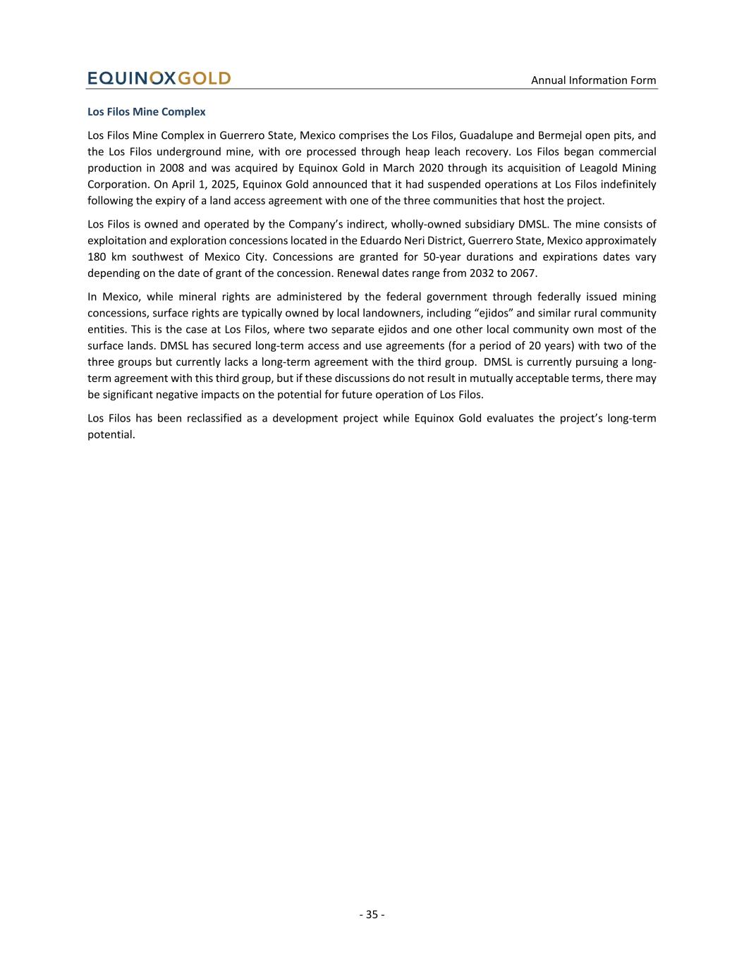 Annual Information Form - 35 - Los Filos Mine Complex Los Filos Mine Complex in Guerrero State, Mexico comprises the Los Filos, Guadalupe and Bermejal open pits, and the Los Filos underground mine, with ore processed through heap leach recovery. Los Filos began commercial production in 2008 and was acquired by Equinox Gold in March 2020 through its acquisition of Leagold Mining Corporation. On April 1, 2025, Equinox Gold announced that it had suspended operations at Los Filos indefinitely following the expiry of a land access agreement with one of the three communities that host the project. Los Filos is owned and operated by the Company’s indirect, wholly-owned subsidiary DMSL. The mine consists of exploitation and exploration concessions located in the Eduardo Neri District, Guerrero State, Mexico approximately 180 km southwest of Mexico City. Concessions are granted for 50-year durations and expirations dates vary depending on the date of grant of the concession. Renewal dates range from 2032 to 2067. In Mexico, while mineral rights are administered by the federal government through federally issued mining concessions, surface rights are typically owned by local landowners, including “ejidos” and similar rural community entities. This is the case at Los Filos, where two separate ejidos and one other local community own most of the surface lands. DMSL has secured long-term access and use agreements (for a period of 20 years) with two of the three groups but currently lacks a long-term agreement with the third group. DMSL is currently pursuing a long- term agreement with this third group, but if these discussions do not result in mutually acceptable terms, there may be significant negative impacts on the potential for future operation of Los Filos. Los Filos has been reclassified as a development project while Equinox Gold evaluates the project’s long-term potential.