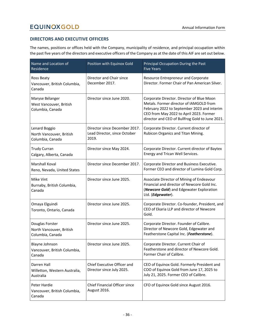 Annual Information Form - 36 - DIRECTORS AND EXECUTIVE OFFICERS The names, positions or offices held with the Company, municipality of residence, and principal occupation within the past five years of the directors and executive officers of the Company as at the date of this AIF are set out below. Name and Location of Residence Position with Equinox Gold Principal Occupation During the Past Five Years Ross Beaty Vancouver, British Columbia, Canada Director and Chair since December 2017. Resource Entrepreneur and Corporate Director. Former Chair of Pan American Silver. Maryse Bélanger West Vancouver, British Columbia, Canada Director since June 2020. Corporate Director. Director of Blue Moon Metals. Former director of IAMGOLD from February 2022 to September 2023 and interim CEO from May 2022 to April 2023. Former director and CEO of Bullfrog Gold to June 2021. Lenard Boggio North Vancouver, British Columbia, Canada Director since December 2017. Lead Director, since October 2019. Corporate Director. Current director of Rubicon Organics and Titan Mining. Trudy Curran Calgary, Alberta, Canada Director since May 2024. Corporate Director. Current director of Baytex Energy and Trican Well Services. Marshall Koval Reno, Nevada, United States Director since December 2017. Corporate Director and Business Executive. Former CEO and director of Lumina Gold Corp. Mike Vint Burnaby, British Columbia, Canada Director since June 2025. Associate Director of Mining of Endeavour Financial and director of Newcore Gold Inc. (Newcore Gold) and Edgewater Exploration Ltd. (Edgewater). Omaya Elguindi Toronto, Ontario, Canada Director since June 2025. Corporate Director. Co-founder, President, and CEO of Ekaria LLP and director of Newcore Gold. Douglas Forster North Vancouver, British Columbia, Canada Director since June 2025. Corporate Director. Founder of Calibre. Director of Newcore Gold, Edgewater and Featherstone Capital Inc. (Featherstone). Blayne Johnson Vancouver, British Columbia, Canada Director since June 2025. Corporate Director. Current Chair of Featherstone and director of Newcore Gold. Former Chair of Calibre. Darren Hall Willetton, Western Australia, Australia Chief Executive Officer and Director since July 2025. CEO of Equinox Gold. Formerly President and COO of Equinox Gold from June 17, 2025 to July 21, 2025. Former CEO of Calibre. Peter Hardie Vancouver, British Columbia, Canada Chief Financial Officer since August 2016. CFO of Equinox Gold since August 2016.