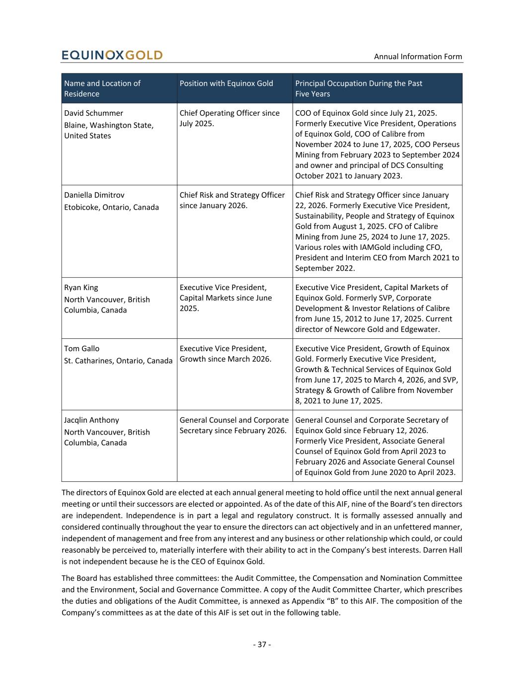 Annual Information Form - 37 - Name and Location of Residence Position with Equinox Gold Principal Occupation During the Past Five Years David Schummer Blaine, Washington State, United States Chief Operating Officer since July 2025. COO of Equinox Gold since July 21, 2025. Formerly Executive Vice President, Operations of Equinox Gold, COO of Calibre from November 2024 to June 17, 2025, COO Perseus Mining from February 2023 to September 2024 and owner and principal of DCS Consulting October 2021 to January 2023. Daniella Dimitrov Etobicoke, Ontario, Canada Chief Risk and Strategy Officer since January 2026. Chief Risk and Strategy Officer since January 22, 2026. Formerly Executive Vice President, Sustainability, People and Strategy of Equinox Gold from August 1, 2025. CFO of Calibre Mining from June 25, 2024 to June 17, 2025. Various roles with IAMGold including CFO, President and Interim CEO from March 2021 to September 2022. Ryan King North Vancouver, British Columbia, Canada Executive Vice President, Capital Markets since June 2025. Executive Vice President, Capital Markets of Equinox Gold. Formerly SVP, Corporate Development & Investor Relations of Calibre from June 15, 2012 to June 17, 2025. Current director of Newcore Gold and Edgewater. Tom Gallo St. Catharines, Ontario, Canada Executive Vice President, Growth since March 2026. Executive Vice President, Growth of Equinox Gold. Formerly Executive Vice President, Growth & Technical Services of Equinox Gold from June 17, 2025 to March 4, 2026, and SVP, Strategy & Growth of Calibre from November 8, 2021 to June 17, 2025. Jacqlin Anthony North Vancouver, British Columbia, Canada General Counsel and Corporate Secretary since February 2026. General Counsel and Corporate Secretary of Equinox Gold since February 12, 2026. Formerly Vice President, Associate General Counsel of Equinox Gold from April 2023 to February 2026 and Associate General Counsel of Equinox Gold from June 2020 to April 2023. The directors of Equinox Gold are elected at each annual general meeting to hold office until the next annual general meeting or until their successors are elected or appointed. As of the date of this AIF, nine of the Board’s ten directors are independent. Independence is in part a legal and regulatory construct. It is formally assessed annually and considered continually throughout the year to ensure the directors can act objectively and in an unfettered manner, independent of management and free from any interest and any business or other relationship which could, or could reasonably be perceived to, materially interfere with their ability to act in the Company’s best interests. Darren Hall is not independent because he is the CEO of Equinox Gold. The Board has established three committees: the Audit Committee, the Compensation and Nomination Committee and the Environment, Social and Governance Committee. A copy of the Audit Committee Charter, which prescribes the duties and obligations of the Audit Committee, is annexed as Appendix “B” to this AIF. The composition of the Company’s committees as at the date of this AIF is set out in the following table.