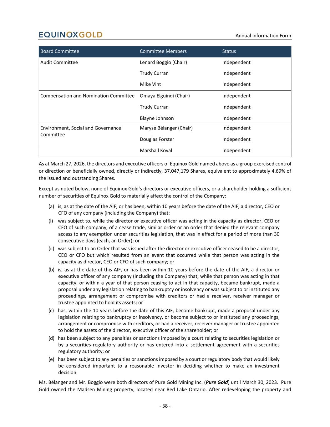 Annual Information Form - 38 - Board Committee Committee Members Status Audit Committee Lenard Boggio (Chair) Independent Trudy Curran Independent Mike Vint Independent Compensation and Nomination Committee Omaya Elguindi (Chair) Independent Trudy Curran Independent Blayne Johnson Independent Environment, Social and Governance Committee Maryse Bélanger (Chair) Independent Douglas Forster Independent Marshall Koval Independent As at March 27, 2026, the directors and executive officers of Equinox Gold named above as a group exercised control or direction or beneficially owned, directly or indirectly, 37,047,179 Shares, equivalent to approximately 4.69% of the issued and outstanding Shares. Except as noted below, none of Equinox Gold’s directors or executive officers, or a shareholder holding a sufficient number of securities of Equinox Gold to materially affect the control of the Company: (a) is, as at the date of the AIF, or has been, within 10 years before the date of the AIF, a director, CEO or CFO of any company (including the Company) that: (i) was subject to, while the director or executive officer was acting in the capacity as director, CEO or CFO of such company, of a cease trade, similar order or an order that denied the relevant company access to any exemption under securities legislation, that was in effect for a period of more than 30 consecutive days (each, an Order); or (ii) was subject to an Order that was issued after the director or executive officer ceased to be a director, CEO or CFO but which resulted from an event that occurred while that person was acting in the capacity as director, CEO or CFO of such company; or (b) is, as at the date of this AIF, or has been within 10 years before the date of the AIF, a director or executive officer of any company (including the Company) that, while that person was acting in that capacity, or within a year of that person ceasing to act in that capacity, became bankrupt, made a proposal under any legislation relating to bankruptcy or insolvency or was subject to or instituted any proceedings, arrangement or compromise with creditors or had a receiver, receiver manager or trustee appointed to hold its assets; or (c) has, within the 10 years before the date of this AIF, become bankrupt, made a proposal under any legislation relating to bankruptcy or insolvency, or become subject to or instituted any proceedings, arrangement or compromise with creditors, or had a receiver, receiver manager or trustee appointed to hold the assets of the director, executive officer of the shareholder; or (d) has been subject to any penalties or sanctions imposed by a court relating to securities legislation or by a securities regulatory authority or has entered into a settlement agreement with a securities regulatory authority; or (e) has been subject to any penalties or sanctions imposed by a court or regulatory body that would likely be considered important to a reasonable investor in deciding whether to make an investment decision. Ms. Bélanger and Mr. Boggio were both directors of Pure Gold Mining Inc. (Pure Gold) until March 30, 2023. Pure Gold owned the Madsen Mining property, located near Red Lake Ontario. After redeveloping the property and