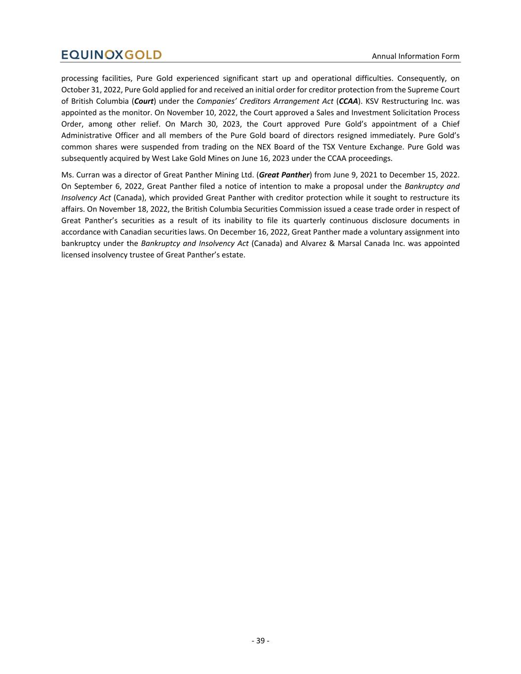 Annual Information Form - 39 - processing facilities, Pure Gold experienced significant start up and operational difficulties. Consequently, on October 31, 2022, Pure Gold applied for and received an initial order for creditor protection from the Supreme Court of British Columbia (Court) under the Companies’ Creditors Arrangement Act (CCAA). KSV Restructuring Inc. was appointed as the monitor. On November 10, 2022, the Court approved a Sales and Investment Solicitation Process Order, among other relief. On March 30, 2023, the Court approved Pure Gold’s appointment of a Chief Administrative Officer and all members of the Pure Gold board of directors resigned immediately. Pure Gold’s common shares were suspended from trading on the NEX Board of the TSX Venture Exchange. Pure Gold was subsequently acquired by West Lake Gold Mines on June 16, 2023 under the CCAA proceedings. Ms. Curran was a director of Great Panther Mining Ltd. (Great Panther) from June 9, 2021 to December 15, 2022. On September 6, 2022, Great Panther filed a notice of intention to make a proposal under the Bankruptcy and Insolvency Act (Canada), which provided Great Panther with creditor protection while it sought to restructure its affairs. On November 18, 2022, the British Columbia Securities Commission issued a cease trade order in respect of Great Panther’s securities as a result of its inability to file its quarterly continuous disclosure documents in accordance with Canadian securities laws. On December 16, 2022, Great Panther made a voluntary assignment into bankruptcy under the Bankruptcy and Insolvency Act (Canada) and Alvarez & Marsal Canada Inc. was appointed licensed insolvency trustee of Great Panther’s estate.