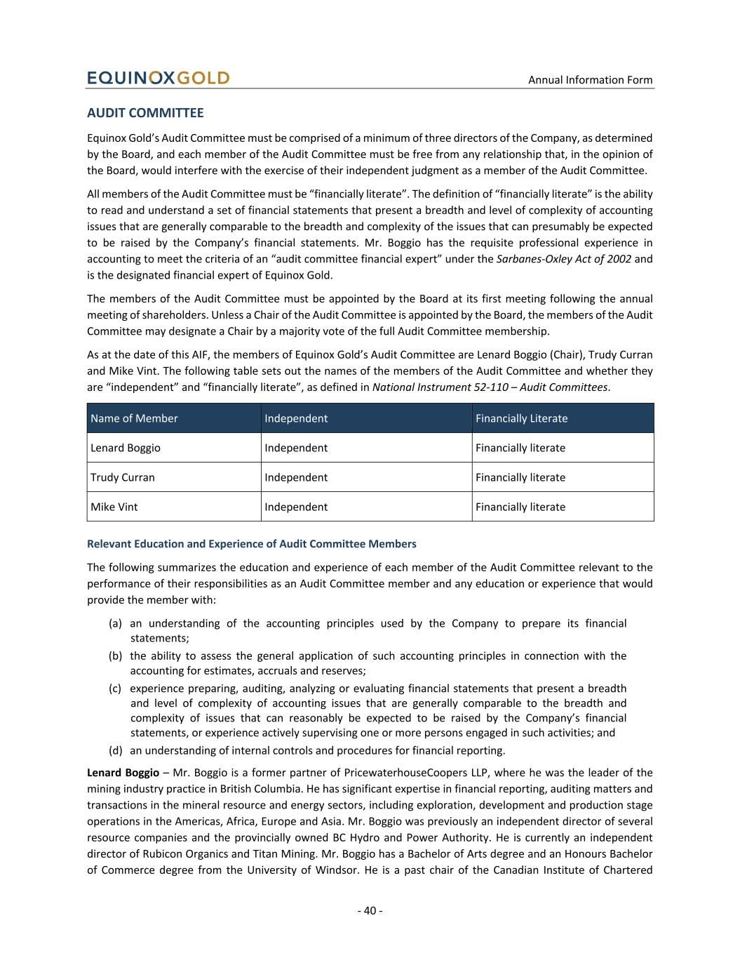 Annual Information Form - 40 - AUDIT COMMITTEE Equinox Gold’s Audit Committee must be comprised of a minimum of three directors of the Company, as determined by the Board, and each member of the Audit Committee must be free from any relationship that, in the opinion of the Board, would interfere with the exercise of their independent judgment as a member of the Audit Committee. All members of the Audit Committee must be “financially literate”. The definition of “financially literate” is the ability to read and understand a set of financial statements that present a breadth and level of complexity of accounting issues that are generally comparable to the breadth and complexity of the issues that can presumably be expected to be raised by the Company’s financial statements. Mr. Boggio has the requisite professional experience in accounting to meet the criteria of an “audit committee financial expert” under the Sarbanes-Oxley Act of 2002 and is the designated financial expert of Equinox Gold. The members of the Audit Committee must be appointed by the Board at its first meeting following the annual meeting of shareholders. Unless a Chair of the Audit Committee is appointed by the Board, the members of the Audit Committee may designate a Chair by a majority vote of the full Audit Committee membership. As at the date of this AIF, the members of Equinox Gold’s Audit Committee are Lenard Boggio (Chair), Trudy Curran and Mike Vint. The following table sets out the names of the members of the Audit Committee and whether they are “independent” and “financially literate”, as defined in National Instrument 52-110 – Audit Committees. Name of Member Independent Financially Literate Lenard Boggio Independent Financially literate Trudy Curran Independent Financially literate Mike Vint Independent Financially literate Relevant Education and Experience of Audit Committee Members The following summarizes the education and experience of each member of the Audit Committee relevant to the performance of their responsibilities as an Audit Committee member and any education or experience that would provide the member with: (a) an understanding of the accounting principles used by the Company to prepare its financial statements; (b) the ability to assess the general application of such accounting principles in connection with the accounting for estimates, accruals and reserves; (c) experience preparing, auditing, analyzing or evaluating financial statements that present a breadth and level of complexity of accounting issues that are generally comparable to the breadth and complexity of issues that can reasonably be expected to be raised by the Company’s financial statements, or experience actively supervising one or more persons engaged in such activities; and (d) an understanding of internal controls and procedures for financial reporting. Lenard Boggio – Mr. Boggio is a former partner of PricewaterhouseCoopers LLP, where he was the leader of the mining industry practice in British Columbia. He has significant expertise in financial reporting, auditing matters and transactions in the mineral resource and energy sectors, including exploration, development and production stage operations in the Americas, Africa, Europe and Asia. Mr. Boggio was previously an independent director of several resource companies and the provincially owned BC Hydro and Power Authority. He is currently an independent director of Rubicon Organics and Titan Mining. Mr. Boggio has a Bachelor of Arts degree and an Honours Bachelor of Commerce degree from the University of Windsor. He is a past chair of the Canadian Institute of Chartered