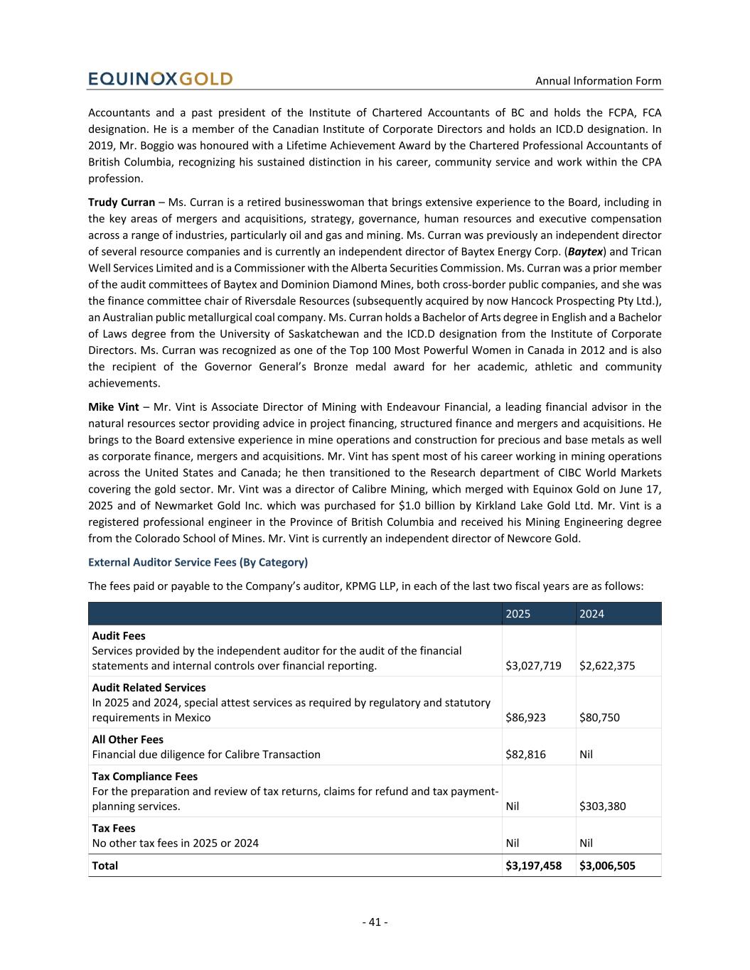 Annual Information Form - 41 - Accountants and a past president of the Institute of Chartered Accountants of BC and holds the FCPA, FCA designation. He is a member of the Canadian Institute of Corporate Directors and holds an ICD.D designation. In 2019, Mr. Boggio was honoured with a Lifetime Achievement Award by the Chartered Professional Accountants of British Columbia, recognizing his sustained distinction in his career, community service and work within the CPA profession. Trudy Curran – Ms. Curran is a retired businesswoman that brings extensive experience to the Board, including in the key areas of mergers and acquisitions, strategy, governance, human resources and executive compensation across a range of industries, particularly oil and gas and mining. Ms. Curran was previously an independent director of several resource companies and is currently an independent director of Baytex Energy Corp. (Baytex) and Trican Well Services Limited and is a Commissioner with the Alberta Securities Commission. Ms. Curran was a prior member of the audit committees of Baytex and Dominion Diamond Mines, both cross-border public companies, and she was the finance committee chair of Riversdale Resources (subsequently acquired by now Hancock Prospecting Pty Ltd.), an Australian public metallurgical coal company. Ms. Curran holds a Bachelor of Arts degree in English and a Bachelor of Laws degree from the University of Saskatchewan and the ICD.D designation from the Institute of Corporate Directors. Ms. Curran was recognized as one of the Top 100 Most Powerful Women in Canada in 2012 and is also the recipient of the Governor General’s Bronze medal award for her academic, athletic and community achievements. Mike Vint – Mr. Vint is Associate Director of Mining with Endeavour Financial, a leading financial advisor in the natural resources sector providing advice in project financing, structured finance and mergers and acquisitions. He brings to the Board extensive experience in mine operations and construction for precious and base metals as well as corporate finance, mergers and acquisitions. Mr. Vint has spent most of his career working in mining operations across the United States and Canada; he then transitioned to the Research department of CIBC World Markets covering the gold sector. Mr. Vint was a director of Calibre Mining, which merged with Equinox Gold on June 17, 2025 and of Newmarket Gold Inc. which was purchased for $1.0 billion by Kirkland Lake Gold Ltd. Mr. Vint is a registered professional engineer in the Province of British Columbia and received his Mining Engineering degree from the Colorado School of Mines. Mr. Vint is currently an independent director of Newcore Gold. External Auditor Service Fees (By Category) The fees paid or payable to the Company’s auditor, KPMG LLP, in each of the last two fiscal years are as follows: 2025 2024 Audit Fees Services provided by the independent auditor for the audit of the financial statements and internal controls over financial reporting. $3,027,719 $2,622,375 Audit Related Services In 2025 and 2024, special attest services as required by regulatory and statutory requirements in Mexico $86,923 $80,750 All Other Fees Financial due diligence for Calibre Transaction $82,816 Nil Tax Compliance Fees For the preparation and review of tax returns, claims for refund and tax payment- planning services. Nil $303,380 Tax Fees No other tax fees in 2025 or 2024 Nil Nil Total $3,197,458 $3,006,505
