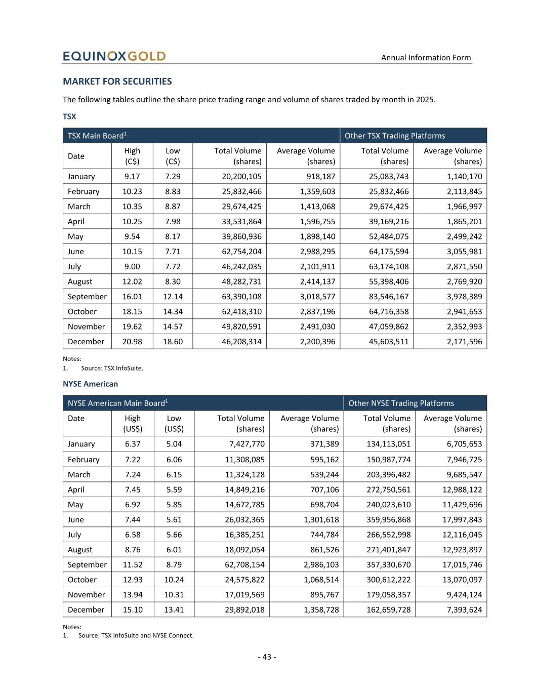 Annual Information Form - 43 - MARKET FOR SECURITIES The following tables outline the share price trading range and volume of shares traded by month in 2025. TSX TSX Main Board1 Other TSX Trading Platforms Date High (C$) Low (C$) Total Volume (shares) Average Volume (shares) Total Volume (shares) Average Volume (shares) January 9.17 7.29 20,200,105 918,187 25,083,743 1,140,170 February 10.23 8.83 25,832,466 1,359,603 25,832,466 2,113,845 March 10.35 8.87 29,674,425 1,413,068 29,674,425 1,966,997 April 10.25 7.98 33,531,864 1,596,755 39,169,216 1,865,201 May 9.54 8.17 39,860,936 1,898,140 52,484,075 2,499,242 June 10.15 7.71 62,754,204 2,988,295 64,175,594 3,055,981 July 9.00 7.72 46,242,035 2,101,911 63,174,108 2,871,550 August 12.02 8.30 48,282,731 2,414,137 55,398,406 2,769,920 September 16.01 12.14 63,390,108 3,018,577 83,546,167 3,978,389 October 18.15 14.34 62,418,310 2,837,196 64,716,358 2,941,653 November 19.62 14.57 49,820,591 2,491,030 47,059,862 2,352,993 December 20.98 18.60 46,208,314 2,200,396 45,603,511 2,171,596 Notes: 1. Source: TSX InfoSuite. NYSE American NYSE American Main Board1 Other NYSE Trading Platforms Date High (US$) Low (US$) Total Volume (shares) Average Volume (shares) Total Volume (shares) Average Volume (shares) January 6.37 5.04 7,427,770 371,389 134,113,051 6,705,653 February 7.22 6.06 11,308,085 595,162 150,987,774 7,946,725 March 7.24 6.15 11,324,128 539,244 203,396,482 9,685,547 April 7.45 5.59 14,849,216 707,106 272,750,561 12,988,122 May 6.92 5.85 14,672,785 698,704 240,023,610 11,429,696 June 7.44 5.61 26,032,365 1,301,618 359,956,868 17,997,843 July 6.58 5.66 16,385,251 744,784 266,552,998 12,116,045 August 8.76 6.01 18,092,054 861,526 271,401,847 12,923,897 September 11.52 8.79 62,708,154 2,986,103 357,330,670 17,015,746 October 12.93 10.24 24,575,822 1,068,514 300,612,222 13,070,097 November 13.94 10.31 17,019,569 895,767 179,058,357 9,424,124 December 15.10 13.41 29,892,018 1,358,728 162,659,728 7,393,624 Notes: 1. Source: TSX InfoSuite and NYSE Connect.