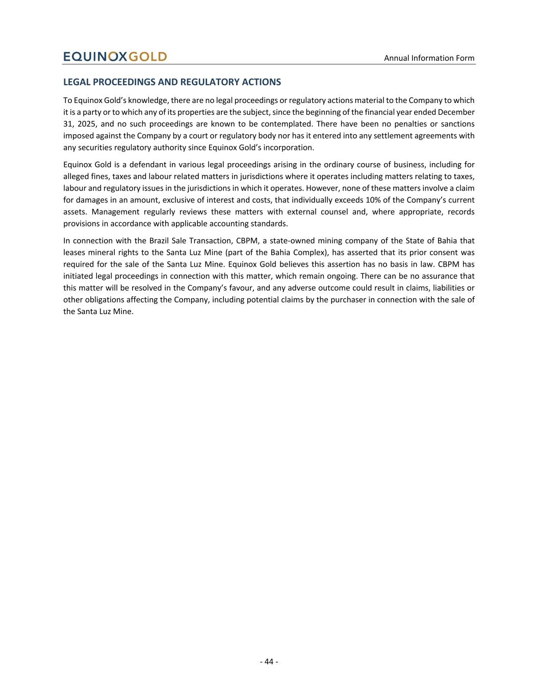 Annual Information Form - 44 - LEGAL PROCEEDINGS AND REGULATORY ACTIONS To Equinox Gold’s knowledge, there are no legal proceedings or regulatory actions material to the Company to which it is a party or to which any of its properties are the subject, since the beginning of the financial year ended December 31, 2025, and no such proceedings are known to be contemplated. There have been no penalties or sanctions imposed against the Company by a court or regulatory body nor has it entered into any settlement agreements with any securities regulatory authority since Equinox Gold’s incorporation. Equinox Gold is a defendant in various legal proceedings arising in the ordinary course of business, including for alleged fines, taxes and labour related matters in jurisdictions where it operates including matters relating to taxes, labour and regulatory issues in the jurisdictions in which it operates. However, none of these matters involve a claim for damages in an amount, exclusive of interest and costs, that individually exceeds 10% of the Company’s current assets. Management regularly reviews these matters with external counsel and, where appropriate, records provisions in accordance with applicable accounting standards. In connection with the Brazil Sale Transaction, CBPM, a state-owned mining company of the State of Bahia that leases mineral rights to the Santa Luz Mine (part of the Bahia Complex), has asserted that its prior consent was required for the sale of the Santa Luz Mine. Equinox Gold believes this assertion has no basis in law. CBPM has initiated legal proceedings in connection with this matter, which remain ongoing. There can be no assurance that this matter will be resolved in the Company’s favour, and any adverse outcome could result in claims, liabilities or other obligations affecting the Company, including potential claims by the purchaser in connection with the sale of the Santa Luz Mine.
