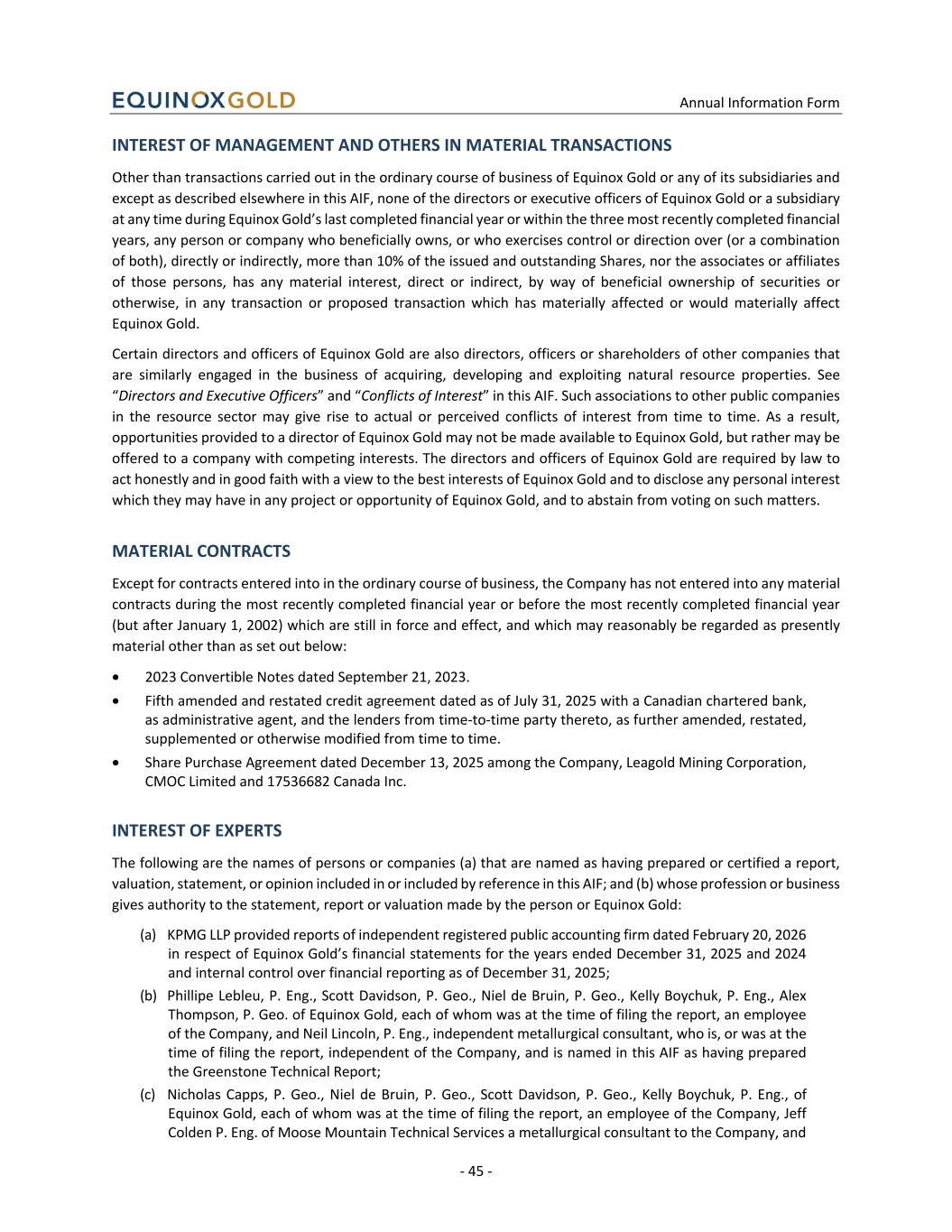 Annual Information Form - 45 - INTEREST OF MANAGEMENT AND OTHERS IN MATERIAL TRANSACTIONS Other than transactions carried out in the ordinary course of business of Equinox Gold or any of its subsidiaries and except as described elsewhere in this AIF, none of the directors or executive officers of Equinox Gold or a subsidiary at any time during Equinox Gold’s last completed financial year or within the three most recently completed financial years, any person or company who beneficially owns, or who exercises control or direction over (or a combination of both), directly or indirectly, more than 10% of the issued and outstanding Shares, nor the associates or affiliates of those persons, has any material interest, direct or indirect, by way of beneficial ownership of securities or otherwise, in any transaction or proposed transaction which has materially affected or would materially affect Equinox Gold. Certain directors and officers of Equinox Gold are also directors, officers or shareholders of other companies that are similarly engaged in the business of acquiring, developing and exploiting natural resource properties. See “Directors and Executive Officers” and “Conflicts of Interest” in this AIF. Such associations to other public companies in the resource sector may give rise to actual or perceived conflicts of interest from time to time. As a result, opportunities provided to a director of Equinox Gold may not be made available to Equinox Gold, but rather may be offered to a company with competing interests. The directors and officers of Equinox Gold are required by law to act honestly and in good faith with a view to the best interests of Equinox Gold and to disclose any personal interest which they may have in any project or opportunity of Equinox Gold, and to abstain from voting on such matters. MATERIAL CONTRACTS Except for contracts entered into in the ordinary course of business, the Company has not entered into any material contracts during the most recently completed financial year or before the most recently completed financial year (but after January 1, 2002) which are still in force and effect, and which may reasonably be regarded as presently material other than as set out below: • 2023 Convertible Notes dated September 21, 2023. • Fifth amended and restated credit agreement dated as of July 31, 2025 with a Canadian chartered bank, as administrative agent, and the lenders from time-to-time party thereto, as further amended, restated, supplemented or otherwise modified from time to time. • Share Purchase Agreement dated December 13, 2025 among the Company, Leagold Mining Corporation, CMOC Limited and 17536682 Canada Inc. INTEREST OF EXPERTS The following are the names of persons or companies (a) that are named as having prepared or certified a report, valuation, statement, or opinion included in or included by reference in this AIF; and (b) whose profession or business gives authority to the statement, report or valuation made by the person or Equinox Gold: (a) KPMG LLP provided reports of independent registered public accounting firm dated February 20, 2026 in respect of Equinox Gold’s financial statements for the years ended December 31, 2025 and 2024 and internal control over financial reporting as of December 31, 2025; (b) Phillipe Lebleu, P. Eng., Scott Davidson, P. Geo., Niel de Bruin, P. Geo., Kelly Boychuk, P. Eng., Alex Thompson, P. Geo. of Equinox Gold, each of whom was at the time of filing the report, an employee of the Company, and Neil Lincoln, P. Eng., independent metallurgical consultant, who is, or was at the time of filing the report, independent of the Company, and is named in this AIF as having prepared the Greenstone Technical Report; (c) Nicholas Capps, P. Geo., Niel de Bruin, P. Geo., Scott Davidson, P. Geo., Kelly Boychuk, P. Eng., of Equinox Gold, each of whom was at the time of filing the report, an employee of the Company, Jeff Colden P. Eng. of Moose Mountain Technical Services a metallurgical consultant to the Company, and