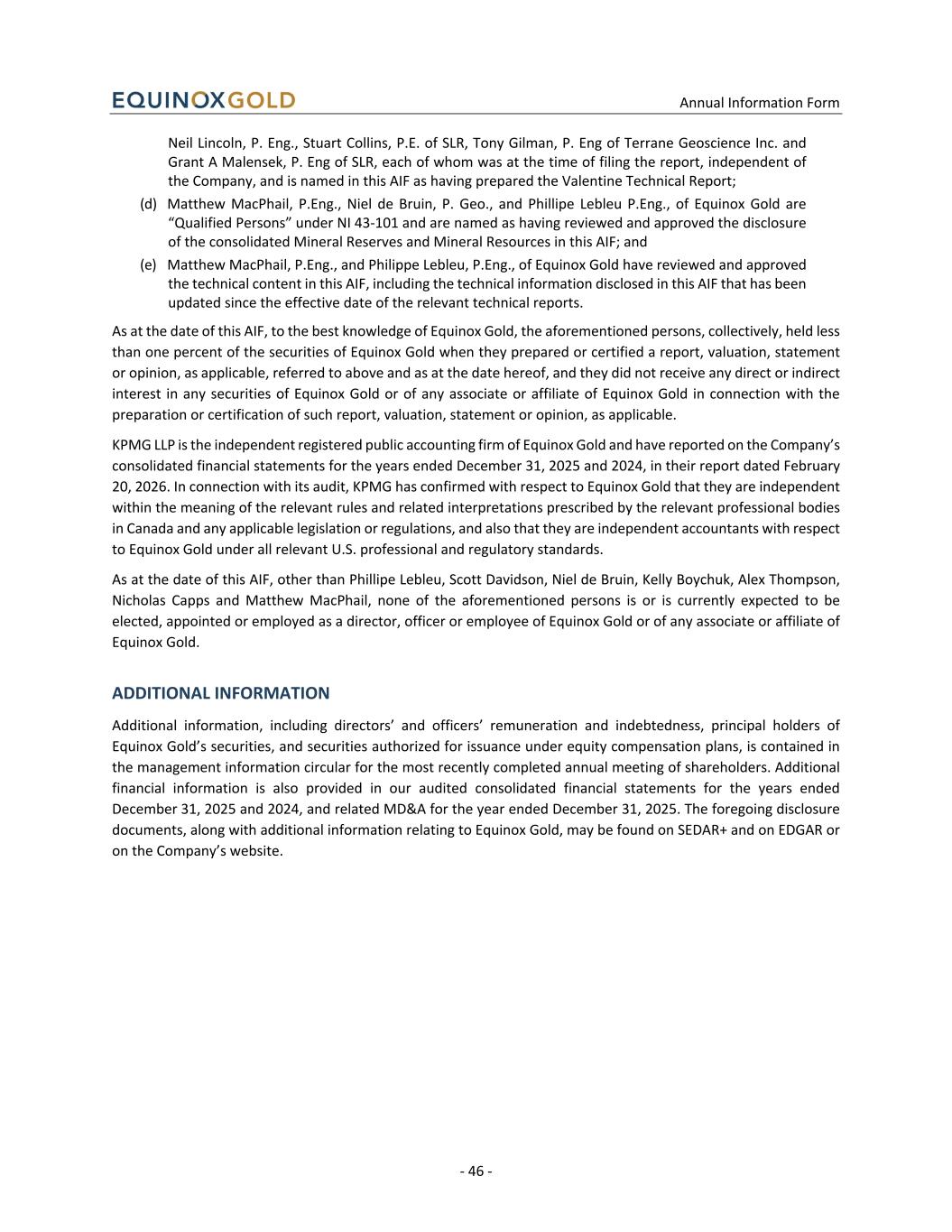 Annual Information Form - 46 - Neil Lincoln, P. Eng., Stuart Collins, P.E. of SLR, Tony Gilman, P. Eng of Terrane Geoscience Inc. and Grant A Malensek, P. Eng of SLR, each of whom was at the time of filing the report, independent of the Company, and is named in this AIF as having prepared the Valentine Technical Report; (d) Matthew MacPhail, P.Eng., Niel de Bruin, P. Geo., and Phillipe Lebleu P.Eng., of Equinox Gold are “Qualified Persons” under NI 43-101 and are named as having reviewed and approved the disclosure of the consolidated Mineral Reserves and Mineral Resources in this AIF; and (e) Matthew MacPhail, P.Eng., and Philippe Lebleu, P.Eng., of Equinox Gold have reviewed and approved the technical content in this AIF, including the technical information disclosed in this AIF that has been updated since the effective date of the relevant technical reports. As at the date of this AIF, to the best knowledge of Equinox Gold, the aforementioned persons, collectively, held less than one percent of the securities of Equinox Gold when they prepared or certified a report, valuation, statement or opinion, as applicable, referred to above and as at the date hereof, and they did not receive any direct or indirect interest in any securities of Equinox Gold or of any associate or affiliate of Equinox Gold in connection with the preparation or certification of such report, valuation, statement or opinion, as applicable. KPMG LLP is the independent registered public accounting firm of Equinox Gold and have reported on the Company’s consolidated financial statements for the years ended December 31, 2025 and 2024, in their report dated February 20, 2026. In connection with its audit, KPMG has confirmed with respect to Equinox Gold that they are independent within the meaning of the relevant rules and related interpretations prescribed by the relevant professional bodies in Canada and any applicable legislation or regulations, and also that they are independent accountants with respect to Equinox Gold under all relevant U.S. professional and regulatory standards. As at the date of this AIF, other than Phillipe Lebleu, Scott Davidson, Niel de Bruin, Kelly Boychuk, Alex Thompson, Nicholas Capps and Matthew MacPhail, none of the aforementioned persons is or is currently expected to be elected, appointed or employed as a director, officer or employee of Equinox Gold or of any associate or affiliate of Equinox Gold. ADDITIONAL INFORMATION Additional information, including directors’ and officers’ remuneration and indebtedness, principal holders of Equinox Gold’s securities, and securities authorized for issuance under equity compensation plans, is contained in the management information circular for the most recently completed annual meeting of shareholders. Additional financial information is also provided in our audited consolidated financial statements for the years ended December 31, 2025 and 2024, and related MD&A for the year ended December 31, 2025. The foregoing disclosure documents, along with additional information relating to Equinox Gold, may be found on SEDAR+ and on EDGAR or on the Company’s website.