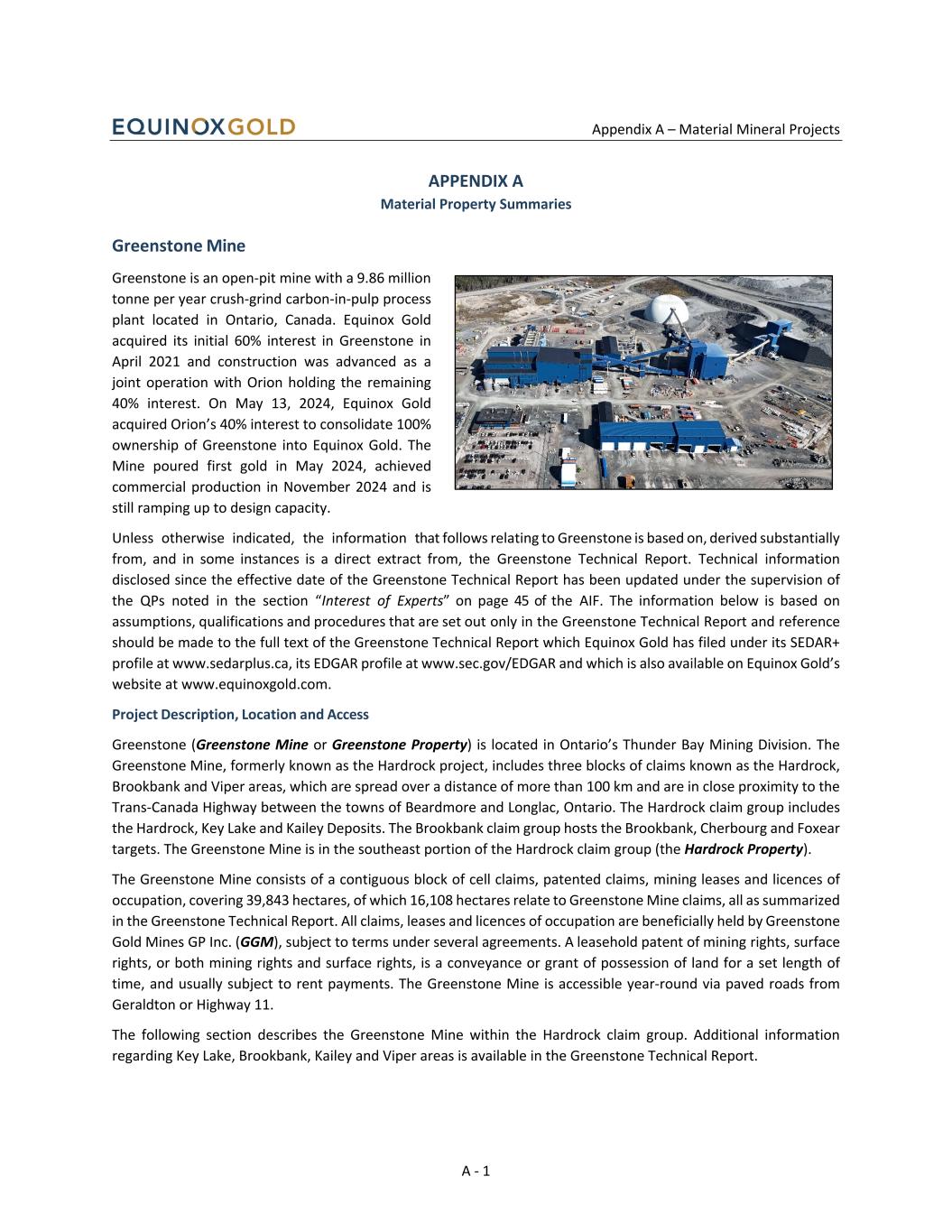 Appendix A – Material Mineral Projects A - 1 APPENDIX A Material Property Summaries Greenstone Mine Greenstone is an open-pit mine with a 9.86 million tonne per year crush-grind carbon-in-pulp process plant located in Ontario, Canada. Equinox Gold acquired its initial 60% interest in Greenstone in April 2021 and construction was advanced as a joint operation with Orion holding the remaining 40% interest. On May 13, 2024, Equinox Gold acquired Orion’s 40% interest to consolidate 100% ownership of Greenstone into Equinox Gold. The Mine poured first gold in May 2024, achieved commercial production in November 2024 and is still ramping up to design capacity. Unless otherwise indicated, the information that follows relating to Greenstone is based on, derived substantially from, and in some instances is a direct extract from, the Greenstone Technical Report. Technical information disclosed since the effective date of the Greenstone Technical Report has been updated under the supervision of the QPs noted in the section “Interest of Experts” on page 45 of the AIF. The information below is based on assumptions, qualifications and procedures that are set out only in the Greenstone Technical Report and reference should be made to the full text of the Greenstone Technical Report which Equinox Gold has filed under its SEDAR+ profile at www.sedarplus.ca, its EDGAR profile at www.sec.gov/EDGAR and which is also available on Equinox Gold’s website at www.equinoxgold.com. Project Description, Location and Access Greenstone (Greenstone Mine or Greenstone Property) is located in Ontario’s Thunder Bay Mining Division. The Greenstone Mine, formerly known as the Hardrock project, includes three blocks of claims known as the Hardrock, Brookbank and Viper areas, which are spread over a distance of more than 100 km and are in close proximity to the Trans-Canada Highway between the towns of Beardmore and Longlac, Ontario. The Hardrock claim group includes the Hardrock, Key Lake and Kailey Deposits. The Brookbank claim group hosts the Brookbank, Cherbourg and Foxear targets. The Greenstone Mine is in the southeast portion of the Hardrock claim group (the Hardrock Property). The Greenstone Mine consists of a contiguous block of cell claims, patented claims, mining leases and licences of occupation, covering 39,843 hectares, of which 16,108 hectares relate to Greenstone Mine claims, all as summarized in the Greenstone Technical Report. All claims, leases and licences of occupation are beneficially held by Greenstone Gold Mines GP Inc. (GGM), subject to terms under several agreements. A leasehold patent of mining rights, surface rights, or both mining rights and surface rights, is a conveyance or grant of possession of land for a set length of time, and usually subject to rent payments. The Greenstone Mine is accessible year-round via paved roads from Geraldton or Highway 11. The following section describes the Greenstone Mine within the Hardrock claim group. Additional information regarding Key Lake, Brookbank, Kailey and Viper areas is available in the Greenstone Technical Report.