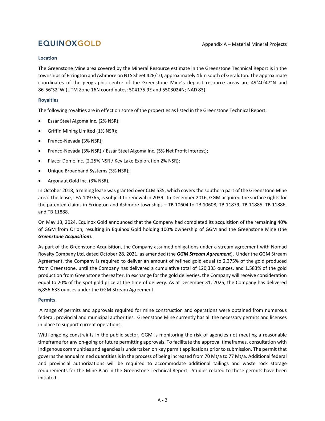 Appendix A – Material Mineral Projects A - 2 Location The Greenstone Mine area covered by the Mineral Resource estimate in the Greenstone Technical Report is in the townships of Errington and Ashmore on NTS Sheet 42E/10, approximately 4 km south of Geraldton. The approximate coordinates of the geographic centre of the Greenstone Mine’s deposit resource areas are 49°40’47”N and 86°56’32”W (UTM Zone 16N coordinates: 504175.9E and 5503024N; NAD 83). Royalties The following royalties are in effect on some of the properties as listed in the Greenstone Technical Report: • Essar Steel Algoma Inc. (2% NSR); • Griffin Mining Limited (1% NSR); • Franco-Nevada (3% NSR); • Franco-Nevada (3% NSR) / Essar Steel Algoma Inc. (5% Net Profit Interest); • Placer Dome Inc. (2.25% NSR / Key Lake Exploration 2% NSR); • Unique Broadband Systems (3% NSR); • Argonaut Gold Inc. (3% NSR). In October 2018, a mining lease was granted over CLM 535, which covers the southern part of the Greenstone Mine area. The lease, LEA-109765, is subject to renewal in 2039. In December 2016, GGM acquired the surface rights for the patented claims in Errington and Ashmore townships – TB 10604 to TB 10608, TB 11879, TB 11885, TB 11886, and TB 11888. On May 13, 2024, Equinox Gold announced that the Company had completed its acquisition of the remaining 40% of GGM from Orion, resulting in Equinox Gold holding 100% ownership of GGM and the Greenstone Mine (the Greenstone Acquisition). As part of the Greenstone Acquisition, the Company assumed obligations under a stream agreement with Nomad Royalty Company Ltd, dated October 28, 2021, as amended (the GGM Stream Agreement). Under the GGM Stream Agreement, the Company is required to deliver an amount of refined gold equal to 2.375% of the gold produced from Greenstone, until the Company has delivered a cumulative total of 120,333 ounces, and 1.583% of the gold production from Greenstone thereafter. In exchange for the gold deliveries, the Company will receive consideration equal to 20% of the spot gold price at the time of delivery. As at December 31, 2025, the Company has delivered 6,856.633 ounces under the GGM Stream Agreement. Permits A range of permits and approvals required for mine construction and operations were obtained from numerous federal, provincial and municipal authorities. Greenstone Mine currently has all the necessary permits and licenses in place to support current operations. With ongoing constraints in the public sector, GGM is monitoring the risk of agencies not meeting a reasonable timeframe for any on-going or future permitting approvals. To facilitate the approval timeframes, consultation with Indigenous communities and agencies is undertaken on key permit applications prior to submission. The permit that governs the annual mined quantities is in the process of being increased from 70 Mt/a to 77 Mt/a. Additional federal and provincial authorizations will be required to accommodate additional tailings and waste rock storage requirements for the Mine Plan in the Greenstone Technical Report. Studies related to these permits have been initiated.