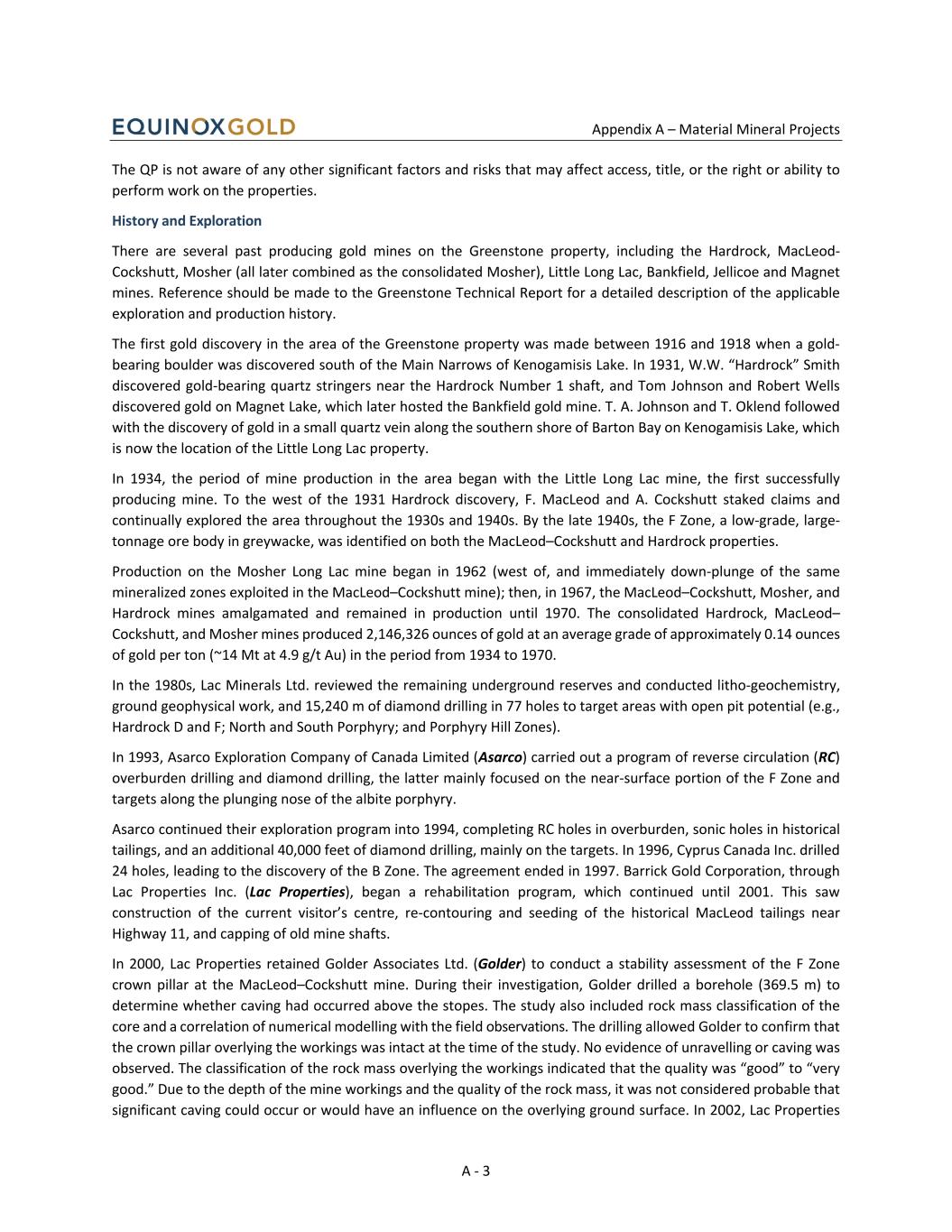 Appendix A – Material Mineral Projects A - 3 The QP is not aware of any other significant factors and risks that may affect access, title, or the right or ability to perform work on the properties. History and Exploration There are several past producing gold mines on the Greenstone property, including the Hardrock, MacLeod- Cockshutt, Mosher (all later combined as the consolidated Mosher), Little Long Lac, Bankfield, Jellicoe and Magnet mines. Reference should be made to the Greenstone Technical Report for a detailed description of the applicable exploration and production history. The first gold discovery in the area of the Greenstone property was made between 1916 and 1918 when a gold- bearing boulder was discovered south of the Main Narrows of Kenogamisis Lake. In 1931, W.W. “Hardrock” Smith discovered gold-bearing quartz stringers near the Hardrock Number 1 shaft, and Tom Johnson and Robert Wells discovered gold on Magnet Lake, which later hosted the Bankfield gold mine. T. A. Johnson and T. Oklend followed with the discovery of gold in a small quartz vein along the southern shore of Barton Bay on Kenogamisis Lake, which is now the location of the Little Long Lac property. In 1934, the period of mine production in the area began with the Little Long Lac mine, the first successfully producing mine. To the west of the 1931 Hardrock discovery, F. MacLeod and A. Cockshutt staked claims and continually explored the area throughout the 1930s and 1940s. By the late 1940s, the F Zone, a low-grade, large- tonnage ore body in greywacke, was identified on both the MacLeod–Cockshutt and Hardrock properties. Production on the Mosher Long Lac mine began in 1962 (west of, and immediately down-plunge of the same mineralized zones exploited in the MacLeod–Cockshutt mine); then, in 1967, the MacLeod–Cockshutt, Mosher, and Hardrock mines amalgamated and remained in production until 1970. The consolidated Hardrock, MacLeod– Cockshutt, and Mosher mines produced 2,146,326 ounces of gold at an average grade of approximately 0.14 ounces of gold per ton (~14 Mt at 4.9 g/t Au) in the period from 1934 to 1970. In the 1980s, Lac Minerals Ltd. reviewed the remaining underground reserves and conducted litho-geochemistry, ground geophysical work, and 15,240 m of diamond drilling in 77 holes to target areas with open pit potential (e.g., Hardrock D and F; North and South Porphyry; and Porphyry Hill Zones). In 1993, Asarco Exploration Company of Canada Limited (Asarco) carried out a program of reverse circulation (RC) overburden drilling and diamond drilling, the latter mainly focused on the near-surface portion of the F Zone and targets along the plunging nose of the albite porphyry. Asarco continued their exploration program into 1994, completing RC holes in overburden, sonic holes in historical tailings, and an additional 40,000 feet of diamond drilling, mainly on the targets. In 1996, Cyprus Canada Inc. drilled 24 holes, leading to the discovery of the B Zone. The agreement ended in 1997. Barrick Gold Corporation, through Lac Properties Inc. (Lac Properties), began a rehabilitation program, which continued until 2001. This saw construction of the current visitor’s centre, re-contouring and seeding of the historical MacLeod tailings near Highway 11, and capping of old mine shafts. In 2000, Lac Properties retained Golder Associates Ltd. (Golder) to conduct a stability assessment of the F Zone crown pillar at the MacLeod–Cockshutt mine. During their investigation, Golder drilled a borehole (369.5 m) to determine whether caving had occurred above the stopes. The study also included rock mass classification of the core and a correlation of numerical modelling with the field observations. The drilling allowed Golder to confirm that the crown pillar overlying the workings was intact at the time of the study. No evidence of unravelling or caving was observed. The classification of the rock mass overlying the workings indicated that the quality was “good” to “very good.” Due to the depth of the mine workings and the quality of the rock mass, it was not considered probable that significant caving could occur or would have an influence on the overlying ground surface. In 2002, Lac Properties