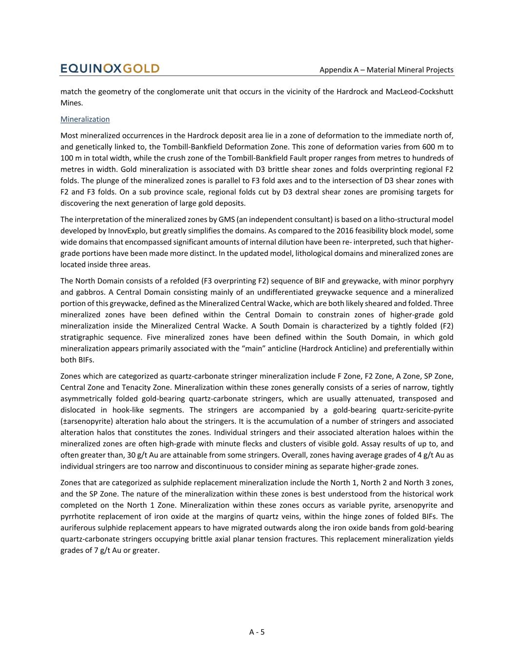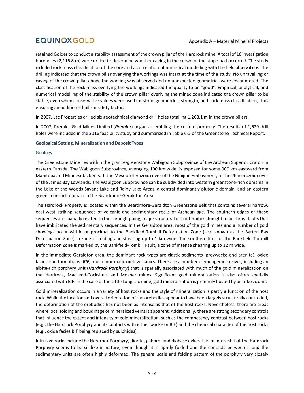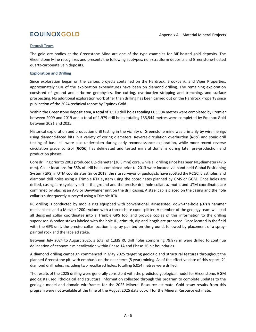 Appendix A – Material Mineral Projects A - 6 Deposit Types The gold ore bodies at the Greenstone Mine are one of the type examples for BIF-hosted gold deposits. The Greenstone Mine recognizes and presents the following subtypes: non-stratiform deposits and Greenstone-hosted quartz-carbonate vein deposits. Exploration and Drilling Since exploration began on the various projects contained on the Hardrock, Brookbank, and Viper Properties, approximately 90% of the exploration expenditures have been on diamond drilling. The remaining exploration consisted of ground and airborne geophysics, line cutting, overburden stripping and trenching, and surface prospecting. No additional exploration work other than drilling has been carried out on the Hardrock Property since publication of the 2024 technical report by Equinox Gold. Within the Greenstone deposit area, a total of 1,919 drill holes totaling 603,904 metres were completed by Premier between 2009 and 2019 and a total of 1,979 drill holes totaling 133,544 metres were completed by Equinox Gold between 2021 and 2025. Historical exploration and production drill testing in the vicinity of Greenstone mine was primarily by wireline rigs using diamond-faced bits in a variety of coring diameters. Reverse-circulation overburden (RCO) and sonic drill testing of basal till were also undertaken during early reconnaissance exploration, while more recent reverse circulation grade control (RCGC) has delineated and tested mineral domains during later pre-production and production phases. Core drilling prior to 2002 produced BQ-diameter (36.5 mm) core, while all drilling since has been NQ-diameter (47.6 mm). Collar locations for 55% of drill holes completed prior to 2013 were located via hand-held Global Positioning System (GPS) in UTM coordinates. Since 2018, the site surveyor or geologists have spotted the RCGC, blastholes, and diamond drill holes using a Trimble RTK system using the coordinates planned by GMS or GGM. Once holes are drilled, casings are typically left in the ground and the precise drill hole collar, azimuth, and UTM coordinates are confirmed by placing an APS or DeviAligner unit on the drill casing. A steel cap is placed on the casing and the hole collar is subsequently surveyed using a Trimble RTK. RC drilling is conducted by mobile rigs equipped with conventional, air-assisted, down-the-hole (DTH) hammer mechanisms and a Metzke 1200 cyclone with a three chute cone splitter. A member of the geology team will load all designed collar coordinates into a Trimble GPS tool and provide copies of this information to the drilling supervisor. Wooden stakes labeled with the hole ID, azimuth, dip and length are prepared. Once located in the field with the GPS unit, the precise collar location is spray painted on the ground, followed by placement of a spray- painted rock and the labeled stake. Between July 2024 to August 2025, a total of 1,339 RC drill holes comprising 79,878 m were drilled to continue delineation of economic mineralization within Phase 1A and Phase 1B pit boundaries. A diamond drilling campaign commenced in May 2025 targeting geologic and structural features throughout the planned Greenstone pit, with emphasis on the near-term (5 year) mining. As of the effective date of this report, 21 diamond drill holes, including two recollared holes, totalling 6,054 metres were drilled. The results of the 2025 drilling were generally consistent with the predicted geological model for Greenstone. GGM geologists used lithological and structural information collected through this program to complete updates to the geologic model and domain wireframes for the 2025 Mineral Resource estimate. Gold assay results from this program were not available at the time of the August 2025 data cut-off for the Mineral Resource estimate.