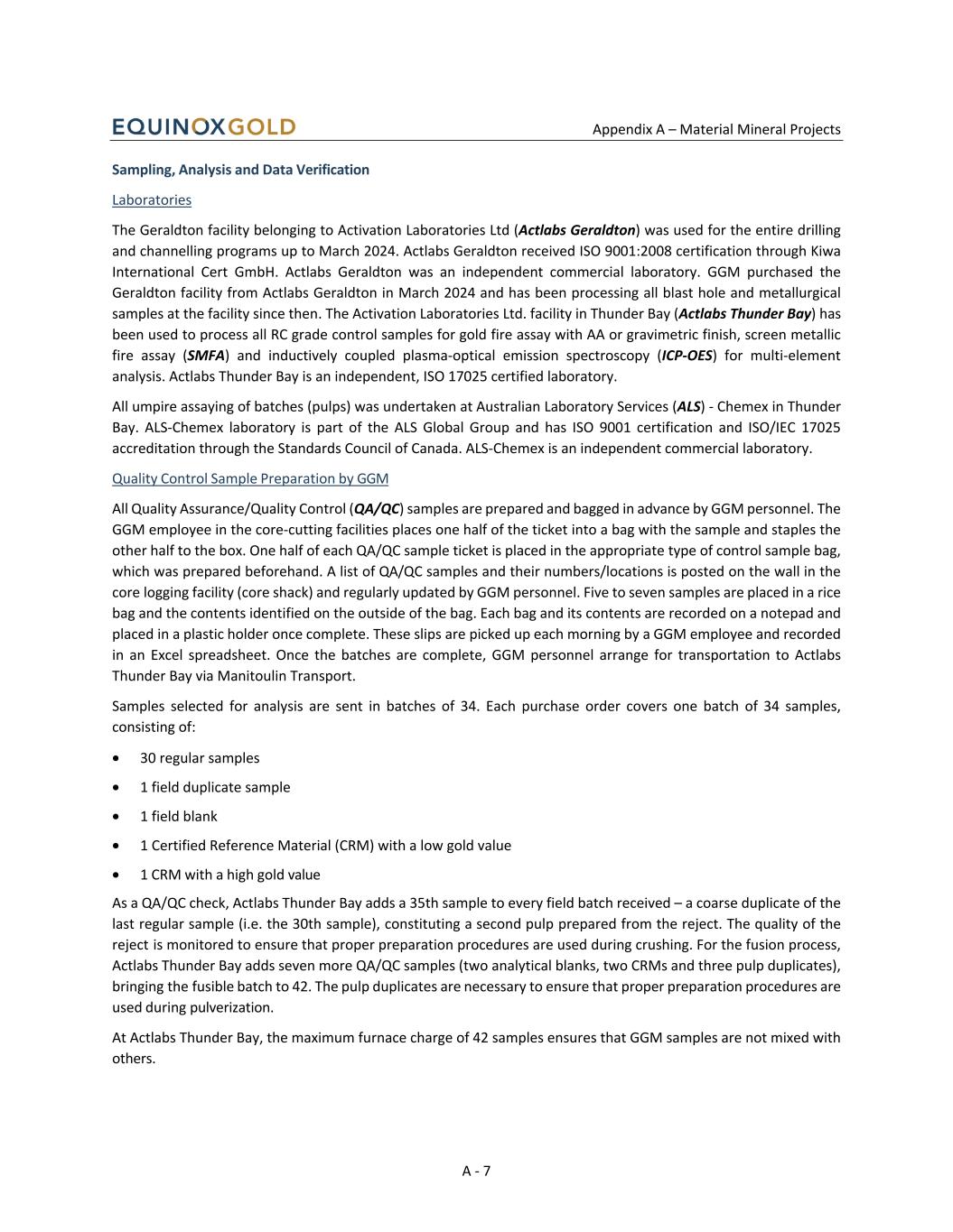 Appendix A – Material Mineral Projects A - 7 Sampling, Analysis and Data Verification Laboratories The Geraldton facility belonging to Activation Laboratories Ltd (Actlabs Geraldton) was used for the entire drilling and channelling programs up to March 2024. Actlabs Geraldton received ISO 9001:2008 certification through Kiwa International Cert GmbH. Actlabs Geraldton was an independent commercial laboratory. GGM purchased the Geraldton facility from Actlabs Geraldton in March 2024 and has been processing all blast hole and metallurgical samples at the facility since then. The Activation Laboratories Ltd. facility in Thunder Bay (Actlabs Thunder Bay) has been used to process all RC grade control samples for gold fire assay with AA or gravimetric finish, screen metallic fire assay (SMFA) and inductively coupled plasma-optical emission spectroscopy (ICP-OES) for multi-element analysis. Actlabs Thunder Bay is an independent, ISO 17025 certified laboratory. All umpire assaying of batches (pulps) was undertaken at Australian Laboratory Services (ALS) - Chemex in Thunder Bay. ALS-Chemex laboratory is part of the ALS Global Group and has ISO 9001 certification and ISO/IEC 17025 accreditation through the Standards Council of Canada. ALS-Chemex is an independent commercial laboratory. Quality Control Sample Preparation by GGM All Quality Assurance/Quality Control (QA/QC) samples are prepared and bagged in advance by GGM personnel. The GGM employee in the core-cutting facilities places one half of the ticket into a bag with the sample and staples the other half to the box. One half of each QA/QC sample ticket is placed in the appropriate type of control sample bag, which was prepared beforehand. A list of QA/QC samples and their numbers/locations is posted on the wall in the core logging facility (core shack) and regularly updated by GGM personnel. Five to seven samples are placed in a rice bag and the contents identified on the outside of the bag. Each bag and its contents are recorded on a notepad and placed in a plastic holder once complete. These slips are picked up each morning by a GGM employee and recorded in an Excel spreadsheet. Once the batches are complete, GGM personnel arrange for transportation to Actlabs Thunder Bay via Manitoulin Transport. Samples selected for analysis are sent in batches of 34. Each purchase order covers one batch of 34 samples, consisting of: • 30 regular samples • 1 field duplicate sample • 1 field blank • 1 Certified Reference Material (CRM) with a low gold value • 1 CRM with a high gold value As a QA/QC check, Actlabs Thunder Bay adds a 35th sample to every field batch received – a coarse duplicate of the last regular sample (i.e. the 30th sample), constituting a second pulp prepared from the reject. The quality of the reject is monitored to ensure that proper preparation procedures are used during crushing. For the fusion process, Actlabs Thunder Bay adds seven more QA/QC samples (two analytical blanks, two CRMs and three pulp duplicates), bringing the fusible batch to 42. The pulp duplicates are necessary to ensure that proper preparation procedures are used during pulverization. At Actlabs Thunder Bay, the maximum furnace charge of 42 samples ensures that GGM samples are not mixed with others.