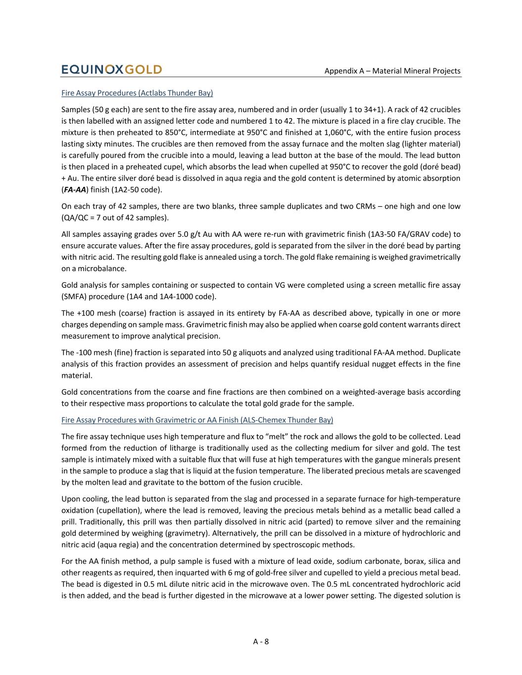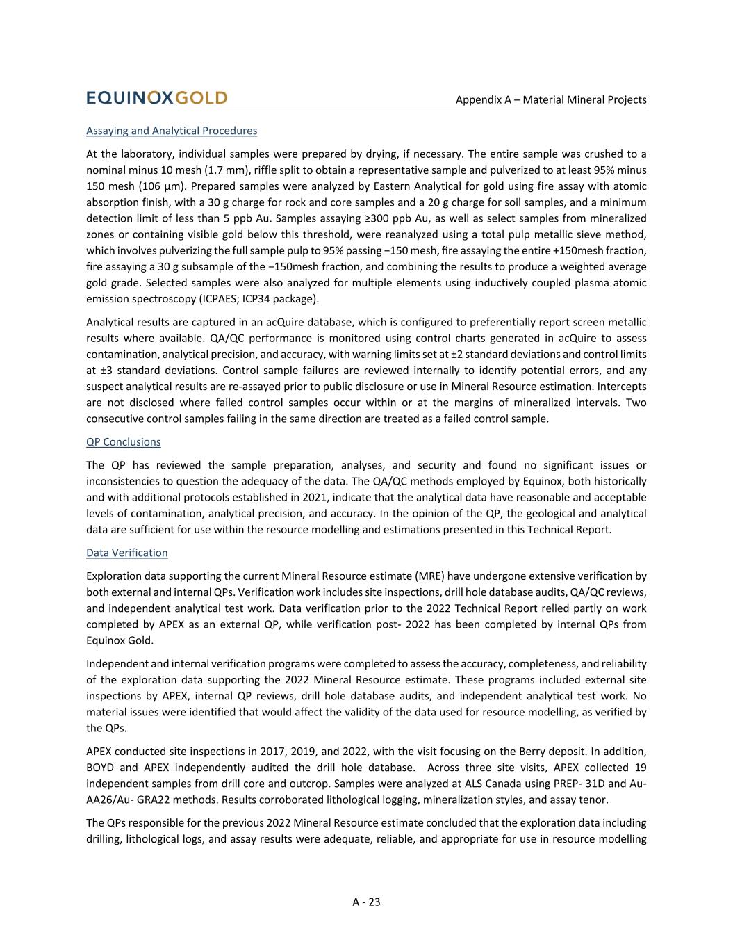 Appendix A – Material Mineral Projects A - 23 Assaying and Analytical Procedures At the laboratory, individual samples were prepared by drying, if necessary. The entire sample was crushed to a nominal minus 10 mesh (1.7 mm), riffle split to obtain a representative sample and pulverized to at least 95% minus 150 mesh (106 μm). Prepared samples were analyzed by Eastern Analytical for gold using fire assay with atomic absorption finish, with a 30 g charge for rock and core samples and a 20 g charge for soil samples, and a minimum detection limit of less than 5 ppb Au. Samples assaying ≥300 ppb Au, as well as select samples from mineralized zones or containing visible gold below this threshold, were reanalyzed using a total pulp metallic sieve method, which involves pulverizing the full sample pulp to 95% passing −150 mesh, fire assaying the entire +150mesh fraction, fire assaying a 30 g subsample of the −150mesh frac on, and combining the results to produce a weighted average gold grade. Selected samples were also analyzed for multiple elements using inductively coupled plasma atomic emission spectroscopy (ICPAES; ICP34 package). Analytical results are captured in an acQuire database, which is configured to preferentially report screen metallic results where available. QA/QC performance is monitored using control charts generated in acQuire to assess contamination, analytical precision, and accuracy, with warning limits set at ±2 standard deviations and control limits at ±3 standard deviations. Control sample failures are reviewed internally to identify potential errors, and any suspect analytical results are re-assayed prior to public disclosure or use in Mineral Resource estimation. Intercepts are not disclosed where failed control samples occur within or at the margins of mineralized intervals. Two consecutive control samples failing in the same direction are treated as a failed control sample. QP Conclusions The QP has reviewed the sample preparation, analyses, and security and found no significant issues or inconsistencies to question the adequacy of the data. The QA/QC methods employed by Equinox, both historically and with additional protocols established in 2021, indicate that the analytical data have reasonable and acceptable levels of contamination, analytical precision, and accuracy. In the opinion of the QP, the geological and analytical data are sufficient for use within the resource modelling and estimations presented in this Technical Report. Data Verification Exploration data supporting the current Mineral Resource estimate (MRE) have undergone extensive verification by both external and internal QPs. Verification work includes site inspections, drill hole database audits, QA/QC reviews, and independent analytical test work. Data verification prior to the 2022 Technical Report relied partly on work completed by APEX as an external QP, while verification post‑ 2022 has been completed by internal QPs from Equinox Gold. Independent and internal verification programs were completed to assess the accuracy, completeness, and reliability of the exploration data supporting the 2022 Mineral Resource estimate. These programs included external site inspections by APEX, internal QP reviews, drill hole database audits, and independent analytical test work. No material issues were identified that would affect the validity of the data used for resource modelling, as verified by the QPs. APEX conducted site inspections in 2017, 2019, and 2022, with the visit focusing on the Berry deposit. In addition, BOYD and APEX independently audited the drill hole database. Across three site visits, APEX collected 19 independent samples from drill core and outcrop. Samples were analyzed at ALS Canada using PREP‑ 31D and Au‑ AA26/Au‑ GRA22 methods. Results corroborated lithological logging, mineralization styles, and assay tenor. The QPs responsible for the previous 2022 Mineral Resource estimate concluded that the exploration data including drilling, lithological logs, and assay results were adequate, reliable, and appropriate for use in resource modelling