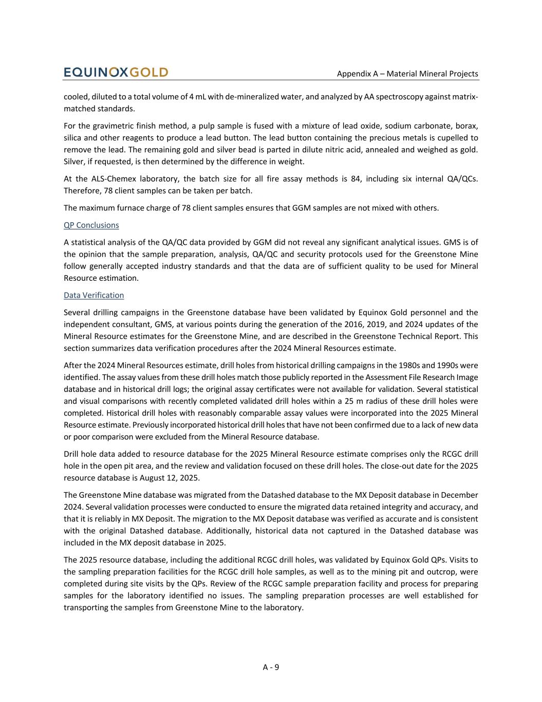 Appendix A – Material Mineral Projects A - 9 cooled, diluted to a total volume of 4 mL with de-mineralized water, and analyzed by AA spectroscopy against matrix- matched standards. For the gravimetric finish method, a pulp sample is fused with a mixture of lead oxide, sodium carbonate, borax, silica and other reagents to produce a lead button. The lead button containing the precious metals is cupelled to remove the lead. The remaining gold and silver bead is parted in dilute nitric acid, annealed and weighed as gold. Silver, if requested, is then determined by the difference in weight. At the ALS-Chemex laboratory, the batch size for all fire assay methods is 84, including six internal QA/QCs. Therefore, 78 client samples can be taken per batch. The maximum furnace charge of 78 client samples ensures that GGM samples are not mixed with others. QP Conclusions A statistical analysis of the QA/QC data provided by GGM did not reveal any significant analytical issues. GMS is of the opinion that the sample preparation, analysis, QA/QC and security protocols used for the Greenstone Mine follow generally accepted industry standards and that the data are of sufficient quality to be used for Mineral Resource estimation. Data Verification Several drilling campaigns in the Greenstone database have been validated by Equinox Gold personnel and the independent consultant, GMS, at various points during the generation of the 2016, 2019, and 2024 updates of the Mineral Resource estimates for the Greenstone Mine, and are described in the Greenstone Technical Report. This section summarizes data verification procedures after the 2024 Mineral Resources estimate. After the 2024 Mineral Resources estimate, drill holes from historical drilling campaigns in the 1980s and 1990s were identified. The assay values from these drill holes match those publicly reported in the Assessment File Research Image database and in historical drill logs; the original assay certificates were not available for validation. Several statistical and visual comparisons with recently completed validated drill holes within a 25 m radius of these drill holes were completed. Historical drill holes with reasonably comparable assay values were incorporated into the 2025 Mineral Resource estimate. Previously incorporated historical drill holes that have not been confirmed due to a lack of new data or poor comparison were excluded from the Mineral Resource database. Drill hole data added to resource database for the 2025 Mineral Resource estimate comprises only the RCGC drill hole in the open pit area, and the review and validation focused on these drill holes. The close-out date for the 2025 resource database is August 12, 2025. The Greenstone Mine database was migrated from the Datashed database to the MX Deposit database in December 2024. Several validation processes were conducted to ensure the migrated data retained integrity and accuracy, and that it is reliably in MX Deposit. The migration to the MX Deposit database was verified as accurate and is consistent with the original Datashed database. Additionally, historical data not captured in the Datashed database was included in the MX deposit database in 2025. The 2025 resource database, including the additional RCGC drill holes, was validated by Equinox Gold QPs. Visits to the sampling preparation facilities for the RCGC drill hole samples, as well as to the mining pit and outcrop, were completed during site visits by the QPs. Review of the RCGC sample preparation facility and process for preparing samples for the laboratory identified no issues. The sampling preparation processes are well established for transporting the samples from Greenstone Mine to the laboratory.