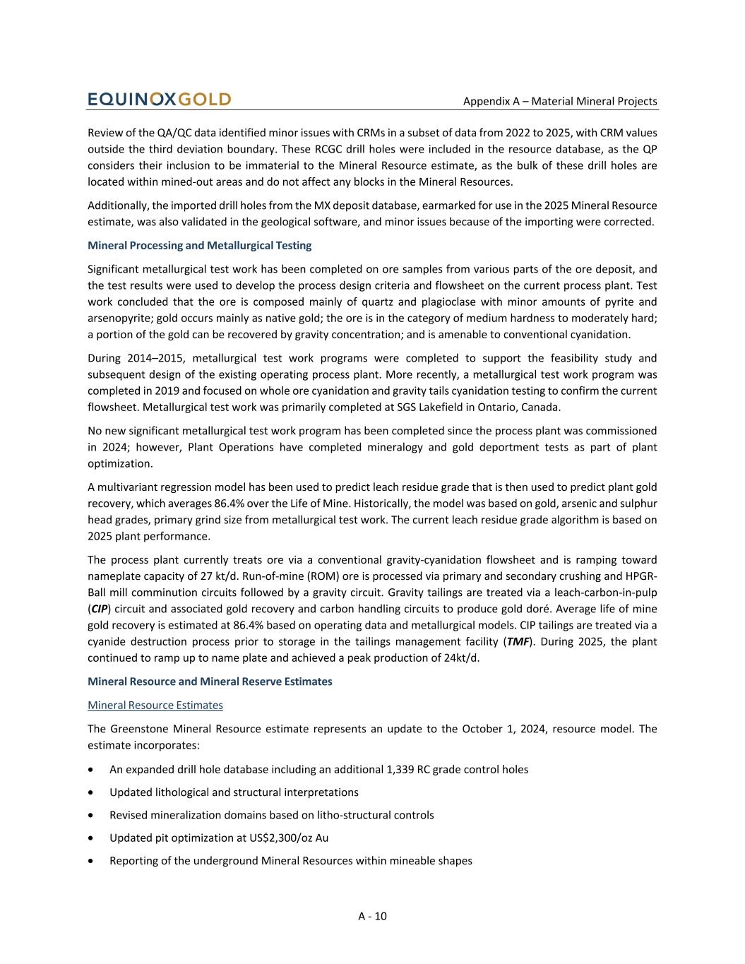 Appendix A – Material Mineral Projects A - 10 Review of the QA/QC data identified minor issues with CRMs in a subset of data from 2022 to 2025, with CRM values outside the third deviation boundary. These RCGC drill holes were included in the resource database, as the QP considers their inclusion to be immaterial to the Mineral Resource estimate, as the bulk of these drill holes are located within mined-out areas and do not affect any blocks in the Mineral Resources. Additionally, the imported drill holes from the MX deposit database, earmarked for use in the 2025 Mineral Resource estimate, was also validated in the geological software, and minor issues because of the importing were corrected. Mineral Processing and Metallurgical Testing Significant metallurgical test work has been completed on ore samples from various parts of the ore deposit, and the test results were used to develop the process design criteria and flowsheet on the current process plant. Test work concluded that the ore is composed mainly of quartz and plagioclase with minor amounts of pyrite and arsenopyrite; gold occurs mainly as native gold; the ore is in the category of medium hardness to moderately hard; a portion of the gold can be recovered by gravity concentration; and is amenable to conventional cyanidation. During 2014–2015, metallurgical test work programs were completed to support the feasibility study and subsequent design of the existing operating process plant. More recently, a metallurgical test work program was completed in 2019 and focused on whole ore cyanidation and gravity tails cyanidation testing to confirm the current flowsheet. Metallurgical test work was primarily completed at SGS Lakefield in Ontario, Canada. No new significant metallurgical test work program has been completed since the process plant was commissioned in 2024; however, Plant Operations have completed mineralogy and gold deportment tests as part of plant optimization. A multivariant regression model has been used to predict leach residue grade that is then used to predict plant gold recovery, which averages 86.4% over the Life of Mine. Historically, the model was based on gold, arsenic and sulphur head grades, primary grind size from metallurgical test work. The current leach residue grade algorithm is based on 2025 plant performance. The process plant currently treats ore via a conventional gravity-cyanidation flowsheet and is ramping toward nameplate capacity of 27 kt/d. Run-of-mine (ROM) ore is processed via primary and secondary crushing and HPGR- Ball mill comminution circuits followed by a gravity circuit. Gravity tailings are treated via a leach-carbon-in-pulp (CIP) circuit and associated gold recovery and carbon handling circuits to produce gold doré. Average life of mine gold recovery is estimated at 86.4% based on operating data and metallurgical models. CIP tailings are treated via a cyanide destruction process prior to storage in the tailings management facility (TMF). During 2025, the plant continued to ramp up to name plate and achieved a peak production of 24kt/d. Mineral Resource and Mineral Reserve Estimates Mineral Resource Estimates The Greenstone Mineral Resource estimate represents an update to the October 1, 2024, resource model. The estimate incorporates: • An expanded drill hole database including an additional 1,339 RC grade control holes • Updated lithological and structural interpretations • Revised mineralization domains based on litho-structural controls • Updated pit optimization at US$2,300/oz Au • Reporting of the underground Mineral Resources within mineable shapes