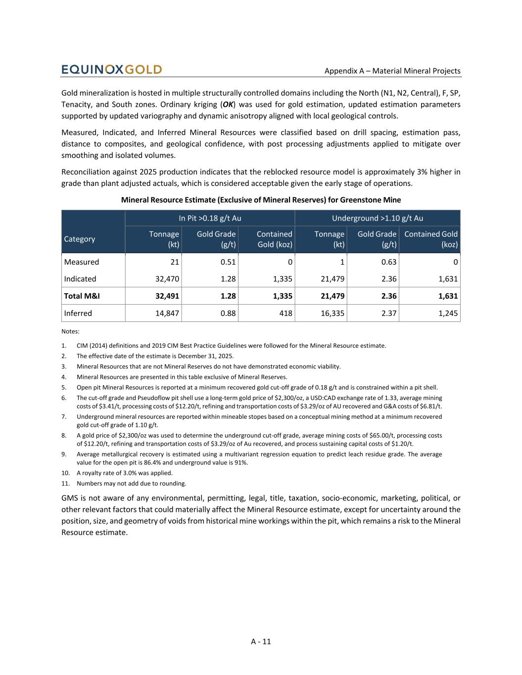 Appendix A – Material Mineral Projects A - 11 Gold mineralization is hosted in multiple structurally controlled domains including the North (N1, N2, Central), F, SP, Tenacity, and South zones. Ordinary kriging (OK) was used for gold estimation, updated estimation parameters supported by updated variography and dynamic anisotropy aligned with local geological controls. Measured, Indicated, and Inferred Mineral Resources were classified based on drill spacing, estimation pass, distance to composites, and geological confidence, with post processing adjustments applied to mitigate over smoothing and isolated volumes. Reconciliation against 2025 production indicates that the reblocked resource model is approximately 3% higher in grade than plant adjusted actuals, which is considered acceptable given the early stage of operations. Mineral Resource Estimate (Exclusive of Mineral Reserves) for Greenstone Mine Category In Pit >0.18 g/t Au Underground >1.10 g/t Au Tonnage (kt) Gold Grade (g/t) Contained Gold (koz) Tonnage (kt) Gold Grade (g/t) Contained Gold (koz) Measured 21 0.51 0 1 0.63 0 Indicated 32,470 1.28 1,335 21,479 2.36 1,631 Total M&I 32,491 1.28 1,335 21,479 2.36 1,631 Inferred 14,847 0.88 418 16,335 2.37 1,245 Notes: 1. CIM (2014) definitions and 2019 CIM Best Practice Guidelines were followed for the Mineral Resource estimate. 2. The effective date of the estimate is December 31, 2025. 3. Mineral Resources that are not Mineral Reserves do not have demonstrated economic viability. 4. Mineral Resources are presented in this table exclusive of Mineral Reserves. 5. Open pit Mineral Resources is reported at a minimum recovered gold cut-off grade of 0.18 g/t and is constrained within a pit shell. 6. The cut-off grade and Pseudoflow pit shell use a long-term gold price of $2,300/oz, a USD:CAD exchange rate of 1.33, average mining costs of $3.41/t, processing costs of $12.20/t, refining and transportation costs of $3.29/oz of AU recovered and G&A costs of $6.81/t. 7. Underground mineral resources are reported within mineable stopes based on a conceptual mining method at a minimum recovered gold cut-off grade of 1.10 g/t. 8. A gold price of $2,300/oz was used to determine the underground cut-off grade, average mining costs of $65.00/t, processing costs of $12.20/t, refining and transportation costs of $3.29/oz of Au recovered, and process sustaining capital costs of $1.20/t. 9. Average metallurgical recovery is estimated using a multivariant regression equation to predict leach residue grade. The average value for the open pit is 86.4% and underground value is 91%. 10. A royalty rate of 3.0% was applied. 11. Numbers may not add due to rounding. GMS is not aware of any environmental, permitting, legal, title, taxation, socio-economic, marketing, political, or other relevant factors that could materially affect the Mineral Resource estimate, except for uncertainty around the position, size, and geometry of voids from historical mine workings within the pit, which remains a risk to the Mineral Resource estimate.