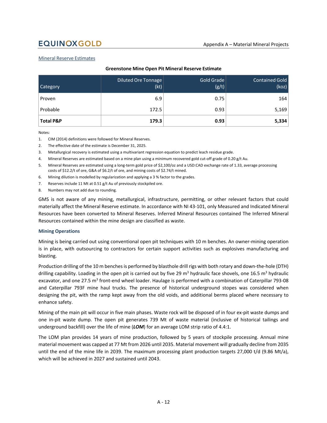 Appendix A – Material Mineral Projects A - 12 Mineral Reserve Estimates Greenstone Mine Open Pit Mineral Reserve Estimate Category Diluted Ore Tonnage (kt) Gold Grade (g/t) Contained Gold (koz) Proven 6.9 0.75 164 Probable 172.5 0.93 5,169 Total P&P 179.3 0.93 5,334 Notes: 1. CIM (2014) definitions were followed for Mineral Reserves. 2. The effective date of the estimate is December 31, 2025. 3. Metallurgical recovery is estimated using a multivariant regression equation to predict leach residue grade. 4. Mineral Reserves are estimated based on a mine plan using a minimum recovered gold cut-off grade of 0.20 g/t Au. 5. Mineral Reserves are estimated using a long-term gold price of $2,100/oz and a USD:CAD exchange rate of 1.33, average processing costs of $12.2/t of ore, G&A of $6.2/t of ore, and mining costs of $2.74/t mined. 6. Mining dilution is modelled by regularization and applying a 3 % factor to the grades. 7. Reserves include 11 Mt at 0.51 g/t Au of previously stockpiled ore. 8. Numbers may not add due to rounding. GMS is not aware of any mining, metallurgical, infrastructure, permitting, or other relevant factors that could materially affect the Mineral Reserve estimate. In accordance with NI 43-101, only Measured and Indicated Mineral Resources have been converted to Mineral Reserves. Inferred Mineral Resources contained The Inferred Mineral Resources contained within the mine design are classified as waste. Mining Operations Mining is being carried out using conventional open pit techniques with 10 m benches. An owner-mining operation is in place, with outsourcing to contractors for certain support activities such as explosives manufacturing and blasting. Production drilling of the 10 m benches is performed by blasthole drill rigs with both rotary and down-the-hole (DTH) drilling capability. Loading in the open pit is carried out by five 29 m3 hydraulic face shovels, one 16.5 m3 hydraulic excavator, and one 27.5 m3 front-end wheel loader. Haulage is performed with a combination of Caterpillar 793-08 and Caterpillar 793F mine haul trucks. The presence of historical underground stopes was considered when designing the pit, with the ramp kept away from the old voids, and additional berms placed where necessary to enhance safety. Mining of the main pit will occur in five main phases. Waste rock will be disposed of in four ex-pit waste dumps and one in-pit waste dump. The open pit generates 739 Mt of waste material (inclusive of historical tailings and underground backfill) over the life of mine (LOM) for an average LOM strip ratio of 4.4:1. The LOM plan provides 14 years of mine production, followed by 5 years of stockpile processing. Annual mine material movement was capped at 77 Mt from 2026 until 2035. Material movement will gradually decline from 2035 until the end of the mine life in 2039. The maximum processing plant production targets 27,000 t/d (9.86 Mt/a), which will be achieved in 2027 and sustained until 2043.