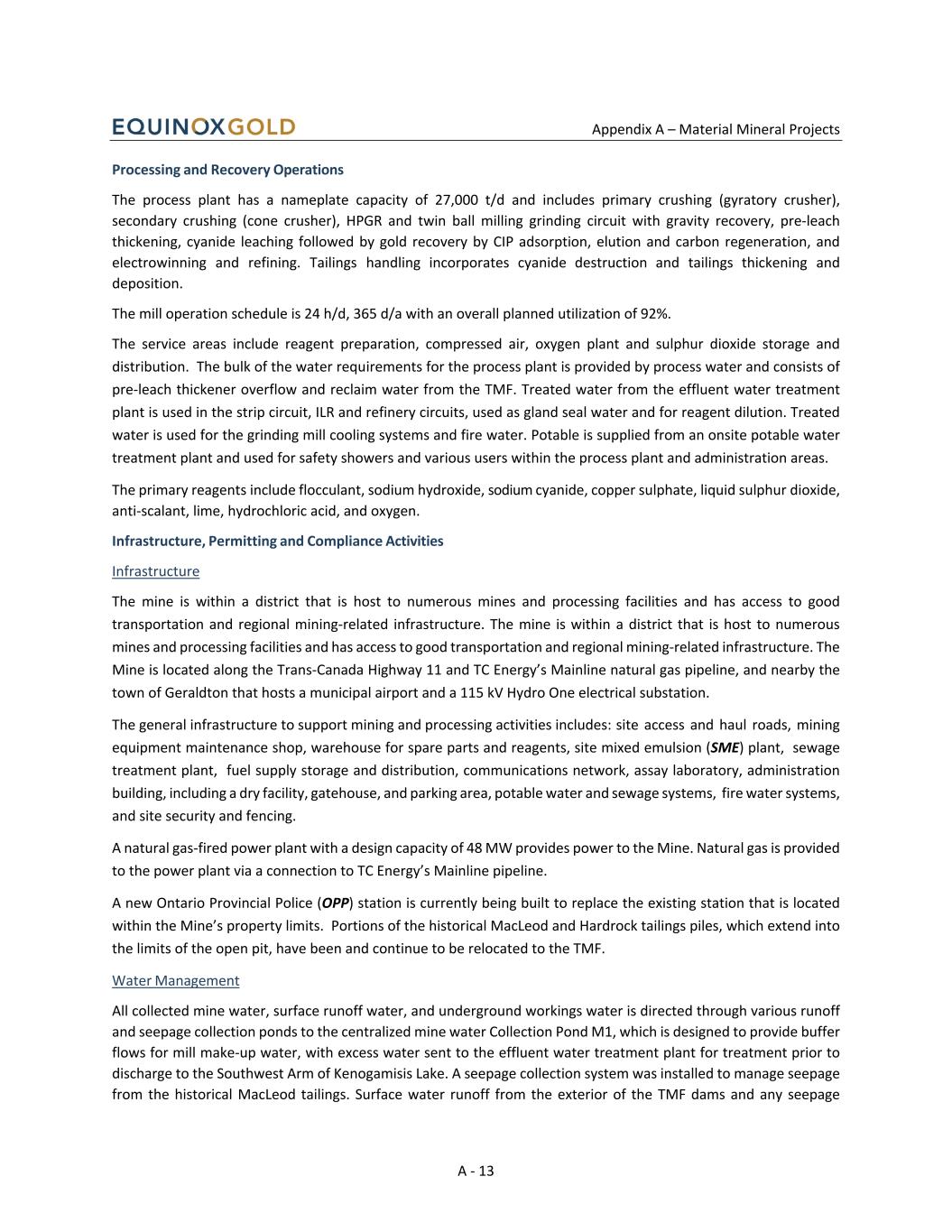 Appendix A – Material Mineral Projects A - 13 Processing and Recovery Operations The process plant has a nameplate capacity of 27,000 t/d and includes primary crushing (gyratory crusher), secondary crushing (cone crusher), HPGR and twin ball milling grinding circuit with gravity recovery, pre-leach thickening, cyanide leaching followed by gold recovery by CIP adsorption, elution and carbon regeneration, and electrowinning and refining. Tailings handling incorporates cyanide destruction and tailings thickening and deposition. The mill operation schedule is 24 h/d, 365 d/a with an overall planned utilization of 92%. The service areas include reagent preparation, compressed air, oxygen plant and sulphur dioxide storage and distribution. The bulk of the water requirements for the process plant is provided by process water and consists of pre-leach thickener overflow and reclaim water from the TMF. Treated water from the effluent water treatment plant is used in the strip circuit, ILR and refinery circuits, used as gland seal water and for reagent dilution. Treated water is used for the grinding mill cooling systems and fire water. Potable is supplied from an onsite potable water treatment plant and used for safety showers and various users within the process plant and administration areas. The primary reagents include flocculant, sodium hydroxide, sodium cyanide, copper sulphate, liquid sulphur dioxide, anti-scalant, lime, hydrochloric acid, and oxygen. Infrastructure, Permitting and Compliance Activities Infrastructure The mine is within a district that is host to numerous mines and processing facilities and has access to good transportation and regional mining-related infrastructure. The mine is within a district that is host to numerous mines and processing facilities and has access to good transportation and regional mining-related infrastructure. The Mine is located along the Trans-Canada Highway 11 and TC Energy’s Mainline natural gas pipeline, and nearby the town of Geraldton that hosts a municipal airport and a 115 kV Hydro One electrical substation. The general infrastructure to support mining and processing activities includes: site access and haul roads, mining equipment maintenance shop, warehouse for spare parts and reagents, site mixed emulsion (SME) plant, sewage treatment plant, fuel supply storage and distribution, communications network, assay laboratory, administration building, including a dry facility, gatehouse, and parking area, potable water and sewage systems, fire water systems, and site security and fencing. A natural gas-fired power plant with a design capacity of 48 MW provides power to the Mine. Natural gas is provided to the power plant via a connection to TC Energy’s Mainline pipeline. A new Ontario Provincial Police (OPP) station is currently being built to replace the existing station that is located within the Mine’s property limits. Portions of the historical MacLeod and Hardrock tailings piles, which extend into the limits of the open pit, have been and continue to be relocated to the TMF. Water Management All collected mine water, surface runoff water, and underground workings water is directed through various runoff and seepage collection ponds to the centralized mine water Collection Pond M1, which is designed to provide buffer flows for mill make-up water, with excess water sent to the effluent water treatment plant for treatment prior to discharge to the Southwest Arm of Kenogamisis Lake. A seepage collection system was installed to manage seepage from the historical MacLeod tailings. Surface water runoff from the exterior of the TMF dams and any seepage