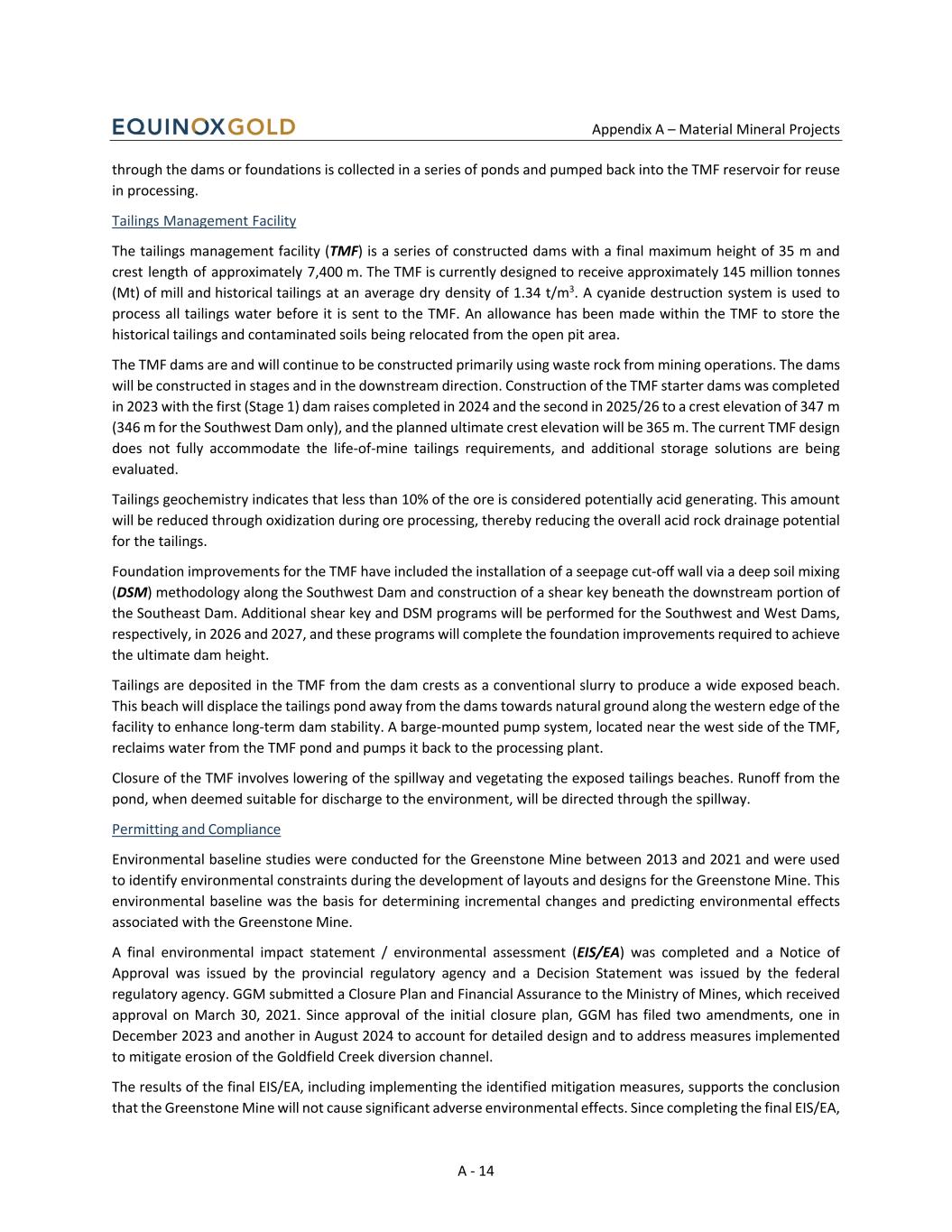 Appendix A – Material Mineral Projects A - 14 through the dams or foundations is collected in a series of ponds and pumped back into the TMF reservoir for reuse in processing. Tailings Management Facility The tailings management facility (TMF) is a series of constructed dams with a final maximum height of 35 m and crest length of approximately 7,400 m. The TMF is currently designed to receive approximately 145 million tonnes (Mt) of mill and historical tailings at an average dry density of 1.34 t/m3. A cyanide destruction system is used to process all tailings water before it is sent to the TMF. An allowance has been made within the TMF to store the historical tailings and contaminated soils being relocated from the open pit area. The TMF dams are and will continue to be constructed primarily using waste rock from mining operations. The dams will be constructed in stages and in the downstream direction. Construction of the TMF starter dams was completed in 2023 with the first (Stage 1) dam raises completed in 2024 and the second in 2025/26 to a crest elevation of 347 m (346 m for the Southwest Dam only), and the planned ultimate crest elevation will be 365 m. The current TMF design does not fully accommodate the life-of-mine tailings requirements, and additional storage solutions are being evaluated. Tailings geochemistry indicates that less than 10% of the ore is considered potentially acid generating. This amount will be reduced through oxidization during ore processing, thereby reducing the overall acid rock drainage potential for the tailings. Foundation improvements for the TMF have included the installation of a seepage cut-off wall via a deep soil mixing (DSM) methodology along the Southwest Dam and construction of a shear key beneath the downstream portion of the Southeast Dam. Additional shear key and DSM programs will be performed for the Southwest and West Dams, respectively, in 2026 and 2027, and these programs will complete the foundation improvements required to achieve the ultimate dam height. Tailings are deposited in the TMF from the dam crests as a conventional slurry to produce a wide exposed beach. This beach will displace the tailings pond away from the dams towards natural ground along the western edge of the facility to enhance long-term dam stability. A barge-mounted pump system, located near the west side of the TMF, reclaims water from the TMF pond and pumps it back to the processing plant. Closure of the TMF involves lowering of the spillway and vegetating the exposed tailings beaches. Runoff from the pond, when deemed suitable for discharge to the environment, will be directed through the spillway. Permitting and Compliance Environmental baseline studies were conducted for the Greenstone Mine between 2013 and 2021 and were used to identify environmental constraints during the development of layouts and designs for the Greenstone Mine. This environmental baseline was the basis for determining incremental changes and predicting environmental effects associated with the Greenstone Mine. A final environmental impact statement / environmental assessment (EIS/EA) was completed and a Notice of Approval was issued by the provincial regulatory agency and a Decision Statement was issued by the federal regulatory agency. GGM submitted a Closure Plan and Financial Assurance to the Ministry of Mines, which received approval on March 30, 2021. Since approval of the initial closure plan, GGM has filed two amendments, one in December 2023 and another in August 2024 to account for detailed design and to address measures implemented to mitigate erosion of the Goldfield Creek diversion channel. The results of the final EIS/EA, including implementing the identified mitigation measures, supports the conclusion that the Greenstone Mine will not cause significant adverse environmental effects. Since completing the final EIS/EA,