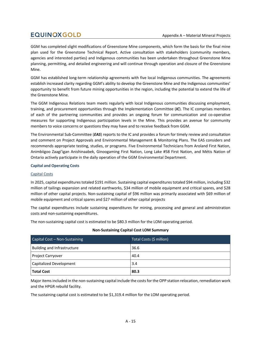 Appendix A – Material Mineral Projects A - 15 GGM has completed slight modifications of Greenstone Mine components, which form the basis for the final mine plan used for the Greenstone Technical Report. Active consultation with stakeholders (community members, agencies and interested parties) and Indigenous communities has been undertaken throughout Greenstone Mine planning, permitting, and detailed engineering and will continue through operation and closure of the Greenstone Mine. GGM has established long-term relationship agreements with five local Indigenous communities. The agreements establish increased clarity regarding GGM’s ability to develop the Greenstone Mine and the Indigenous communities’ opportunity to benefit from future mining opportunities in the region, including the potential to extend the life of the Greenstone Mine. The GGM Indigenous Relations team meets regularly with local Indigenous communities discussing employment, training, and procurement opportunities through the Implementation Committee (IC). The IC comprises members of each of the partnering communities and provides an ongoing forum for communication and co-operative measures for supporting Indigenous participation levels in the Mine. This provides an avenue for community members to voice concerns or questions they may have and to receive feedback from GGM. The Environmental Sub-Committee (EAS) reports to the IC and provides a forum for timely review and consultation and comment on Project Approvals and Environmental Management & Monitoring Plans. The EAS considers and recommends appropriate testing, studies, or programs. Five Environmental Technicians from Aroland First Nation, Animbiigoo Zaagi’igan Anishinaabek, Ginoogaming First Nation, Long Lake #58 First Nation, and Métis Nation of Ontario actively participate in the daily operation of the GGM Environmental Department. Capital and Operating Costs Capital Costs In 2025, capital expenditures totaled $191 million. Sustaining capital expenditures totaled $94 million, including $32 million of tailings expansion and related earthworks, $34 million of mobile equipment and critical spares, and $28 million of other capital projects. Non-sustaining capital of $96 million was primarily associated with $69 million of mobile equipment and critical spares and $27 million of other capital projects The capital expenditures include sustaining expenditures for mining, processing and general and administration costs and non-sustaining expenditures. The non-sustaining capital cost is estimated to be $80.3 million for the LOM operating period. Non-Sustaining Capital Cost LOM Summary Capital Cost – Non-Sustaining Total Costs ($ million) Building and Infrastructure 36.6 Project Carryover 40.4 Capitalized Development 3.4 Total Cost 80.3 Major items included in the non-sustaining capital include the costs for the OPP station relocation, remediation work and the HPGR rebuild facility. The sustaining capital cost is estimated to be $1,319.4 million for the LOM operating period.