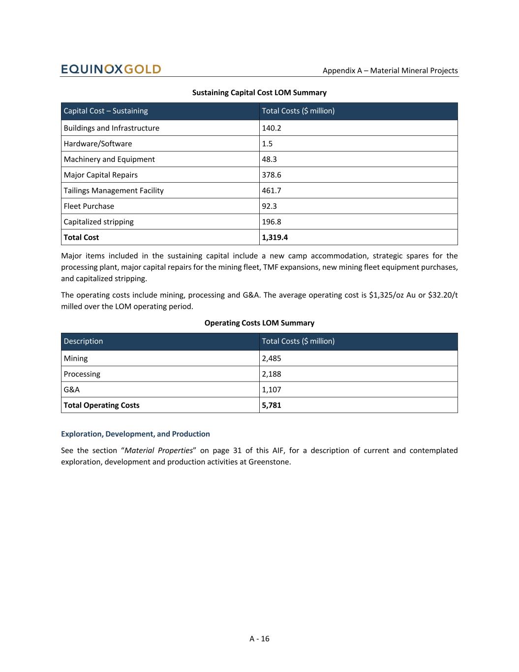 Appendix A – Material Mineral Projects A - 16 Sustaining Capital Cost LOM Summary Capital Cost – Sustaining Total Costs ($ million) Buildings and Infrastructure 140.2 Hardware/Software 1.5 Machinery and Equipment 48.3 Major Capital Repairs 378.6 Tailings Management Facility 461.7 Fleet Purchase 92.3 Capitalized stripping 196.8 Total Cost 1,319.4 Major items included in the sustaining capital include a new camp accommodation, strategic spares for the processing plant, major capital repairs for the mining fleet, TMF expansions, new mining fleet equipment purchases, and capitalized stripping. The operating costs include mining, processing and G&A. The average operating cost is $1,325/oz Au or $32.20/t milled over the LOM operating period. Operating Costs LOM Summary Description Total Costs ($ million) Mining 2,485 Processing 2,188 G&A 1,107 Total Operating Costs 5,781 Exploration, Development, and Production See the section “Material Properties” on page 31 of this AIF, for a description of current and contemplated exploration, development and production activities at Greenstone.