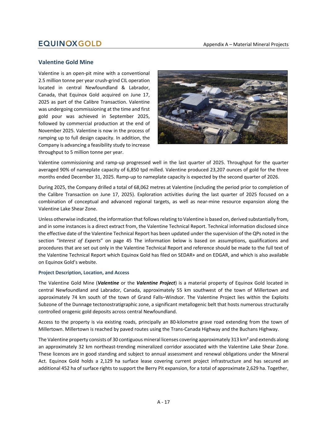 Appendix A – Material Mineral Projects A - 17 Valentine Gold Mine Valentine is an open-pit mine with a conventional 2.5 million tonne per year crush-grind CIL operation located in central Newfoundland & Labrador, Canada, that Equinox Gold acquired on June 17, 2025 as part of the Calibre Transaction. Valentine was undergoing commissioning at the time and first gold pour was achieved in September 2025, followed by commercial production at the end of November 2025. Valentine is now in the process of ramping up to full design capacity. In addition, the Company is advancing a feasibility study to increase throughput to 5 million tonne per year. Valentine commissioning and ramp-up progressed well in the last quarter of 2025. Throughput for the quarter averaged 90% of nameplate capacity of 6,850 tpd milled. Valentine produced 23,207 ounces of gold for the three months ended December 31, 2025. Ramp-up to nameplate capacity is expected by the second quarter of 2026. During 2025, the Company drilled a total of 68,062 metres at Valentine (including the period prior to completion of the Calibre Transaction on June 17, 2025). Exploration activities during the last quarter of 2025 focused on a combination of conceptual and advanced regional targets, as well as near-mine resource expansion along the Valentine Lake Shear Zone. Unless otherwise indicated, the information that follows relating to Valentine is based on, derived substantially from, and in some instances is a direct extract from, the Valentine Technical Report. Technical information disclosed since the effective date of the Valentine Technical Report has been updated under the supervision of the QPs noted in the section “Interest of Experts” on page 45 The information below is based on assumptions, qualifications and procedures that are set out only in the Valentine Technical Report and reference should be made to the full text of the Valentine Technical Report which Equinox Gold has filed on SEDAR+ and on EDGAR, and which is also available on Equinox Gold’s website. Project Description, Location, and Access The Valentine Gold Mine (Valentine or the Valentine Project) is a material property of Equinox Gold located in central Newfoundland and Labrador, Canada, approximately 55 km southwest of the town of Millertown and approximately 74 km south of the town of Grand Falls–Windsor. The Valentine Project lies within the Exploits Subzone of the Dunnage tectonostratigraphic zone, a significant metallogenic belt that hosts numerous structurally controlled orogenic gold deposits across central Newfoundland. Access to the property is via existing roads, principally an 80-kilometre grave road extending from the town of Millertown. Millertown is reached by paved routes using the Trans-Canada Highway and the Buchans Highway. The Valentine property consists of 30 contiguous mineral licenses covering approximately 313 km² and extends along an approximately 32 km northeast-trending mineralized corridor associated with the Valentine Lake Shear Zone. These licences are in good standing and subject to annual assessment and renewal obligations under the Mineral Act. Equinox Gold holds a 2,129 ha surface lease covering current project infrastructure and has secured an additional 452 ha of surface rights to support the Berry Pit expansion, for a total of approximate 2,629 ha. Together,