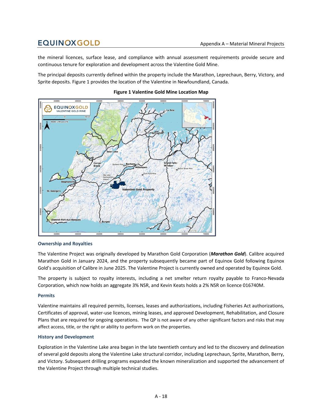 Appendix A – Material Mineral Projects A - 18 the mineral licences, surface lease, and compliance with annual assessment requirements provide secure and continuous tenure for exploration and development across the Valentine Gold Mine. The principal deposits currently defined within the property include the Marathon, Leprechaun, Berry, Victory, and Sprite deposits. Figure 1 provides the location of the Valentine in Newfoundland, Canada. Figure 1 Valentine Gold Mine Location Map Ownership and Royalties The Valentine Project was originally developed by Marathon Gold Corporation (Marathon Gold). Calibre acquired Marathon Gold in January 2024, and the property subsequently became part of Equinox Gold following Equinox Gold’s acquisition of Calibre in June 2025. The Valentine Project is currently owned and operated by Equinox Gold. The property is subject to royalty interests, including a net smelter return royalty payable to Franco-Nevada Corporation, which now holds an aggregate 3% NSR, and Kevin Keats holds a 2% NSR on licence 016740M. Permits Valentine maintains all required permits, licenses, leases and authorizations, including Fisheries Act authorizations, Certificates of approval, water-use licences, mining leases, and approved Development, Rehabilitation, and Closure Plans that are required for ongoing operations. The QP is not aware of any other significant factors and risks that may affect access, title, or the right or ability to perform work on the properties. History and Development Exploration in the Valentine Lake area began in the late twentieth century and led to the discovery and delineation of several gold deposits along the Valentine Lake structural corridor, including Leprechaun, Sprite, Marathon, Berry, and Victory. Subsequent drilling programs expanded the known mineralization and supported the advancement of the Valentine Project through multiple technical studies.