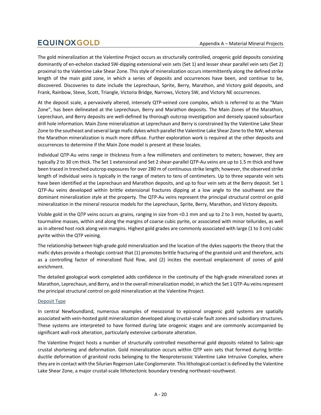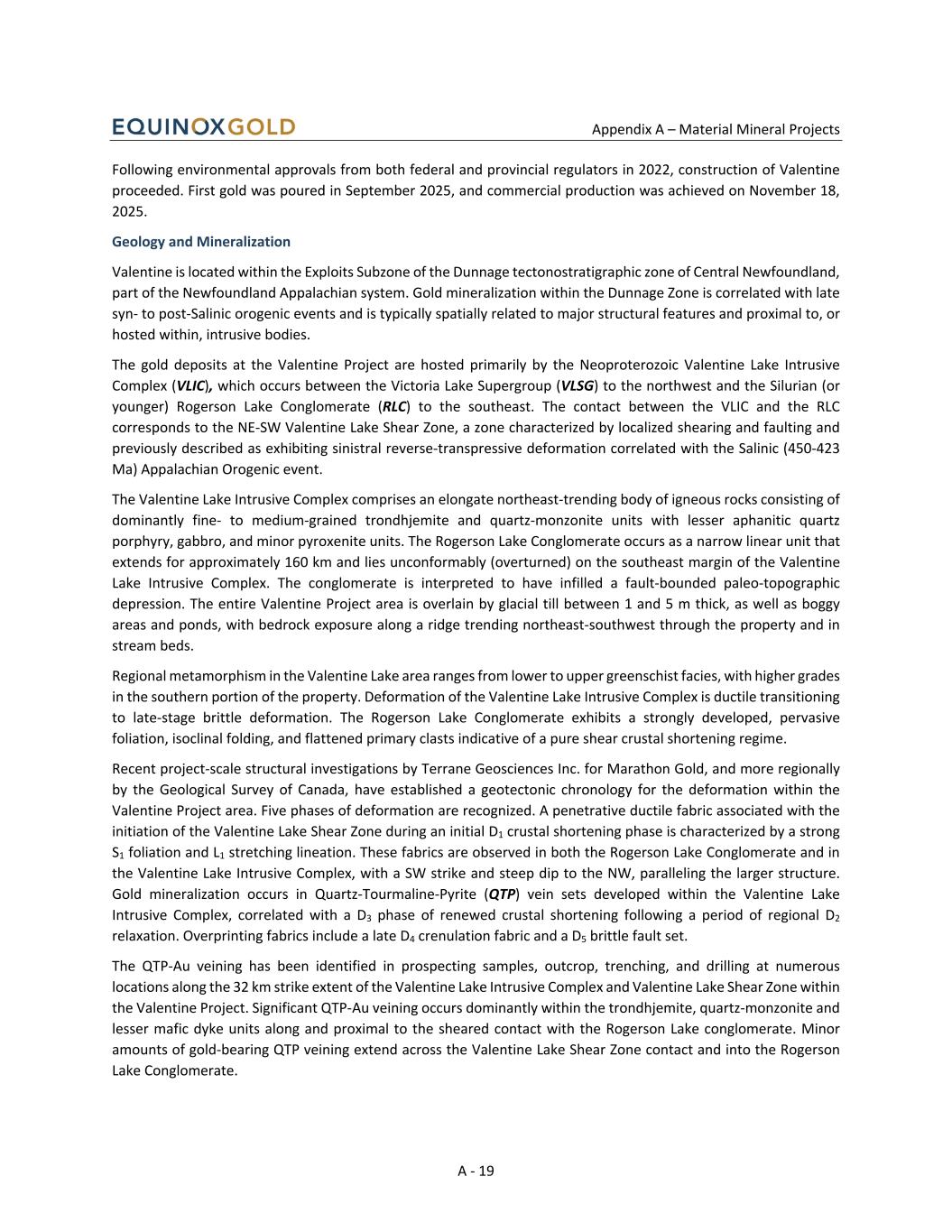 Appendix A – Material Mineral Projects A - 19 Following environmental approvals from both federal and provincial regulators in 2022, construction of Valentine proceeded. First gold was poured in September 2025, and commercial production was achieved on November 18, 2025. Geology and Mineralization Valentine is located within the Exploits Subzone of the Dunnage tectonostratigraphic zone of Central Newfoundland, part of the Newfoundland Appalachian system. Gold mineralization within the Dunnage Zone is correlated with late syn- to post-Salinic orogenic events and is typically spatially related to major structural features and proximal to, or hosted within, intrusive bodies. The gold deposits at the Valentine Project are hosted primarily by the Neoproterozoic Valentine Lake Intrusive Complex (VLIC), which occurs between the Victoria Lake Supergroup (VLSG) to the northwest and the Silurian (or younger) Rogerson Lake Conglomerate (RLC) to the southeast. The contact between the VLIC and the RLC corresponds to the NE-SW Valentine Lake Shear Zone, a zone characterized by localized shearing and faulting and previously described as exhibiting sinistral reverse-transpressive deformation correlated with the Salinic (450-423 Ma) Appalachian Orogenic event. The Valentine Lake Intrusive Complex comprises an elongate northeast-trending body of igneous rocks consisting of dominantly fine- to medium-grained trondhjemite and quartz-monzonite units with lesser aphanitic quartz porphyry, gabbro, and minor pyroxenite units. The Rogerson Lake Conglomerate occurs as a narrow linear unit that extends for approximately 160 km and lies unconformably (overturned) on the southeast margin of the Valentine Lake Intrusive Complex. The conglomerate is interpreted to have infilled a fault-bounded paleo-topographic depression. The entire Valentine Project area is overlain by glacial till between 1 and 5 m thick, as well as boggy areas and ponds, with bedrock exposure along a ridge trending northeast-southwest through the property and in stream beds. Regional metamorphism in the Valentine Lake area ranges from lower to upper greenschist facies, with higher grades in the southern portion of the property. Deformation of the Valentine Lake Intrusive Complex is ductile transitioning to late-stage brittle deformation. The Rogerson Lake Conglomerate exhibits a strongly developed, pervasive foliation, isoclinal folding, and flattened primary clasts indicative of a pure shear crustal shortening regime. Recent project-scale structural investigations by Terrane Geosciences Inc. for Marathon Gold, and more regionally by the Geological Survey of Canada, have established a geotectonic chronology for the deformation within the Valentine Project area. Five phases of deformation are recognized. A penetrative ductile fabric associated with the initiation of the Valentine Lake Shear Zone during an initial D1 crustal shortening phase is characterized by a strong S1 foliation and L1 stretching lineation. These fabrics are observed in both the Rogerson Lake Conglomerate and in the Valentine Lake Intrusive Complex, with a SW strike and steep dip to the NW, paralleling the larger structure. Gold mineralization occurs in Quartz-Tourmaline-Pyrite (QTP) vein sets developed within the Valentine Lake Intrusive Complex, correlated with a D3 phase of renewed crustal shortening following a period of regional D2 relaxation. Overprinting fabrics include a late D4 crenulation fabric and a D5 brittle fault set. The QTP-Au veining has been identified in prospecting samples, outcrop, trenching, and drilling at numerous locations along the 32 km strike extent of the Valentine Lake Intrusive Complex and Valentine Lake Shear Zone within the Valentine Project. Significant QTP-Au veining occurs dominantly within the trondhjemite, quartz-monzonite and lesser mafic dyke units along and proximal to the sheared contact with the Rogerson Lake conglomerate. Minor amounts of gold-bearing QTP veining extend across the Valentine Lake Shear Zone contact and into the Rogerson Lake Conglomerate.
