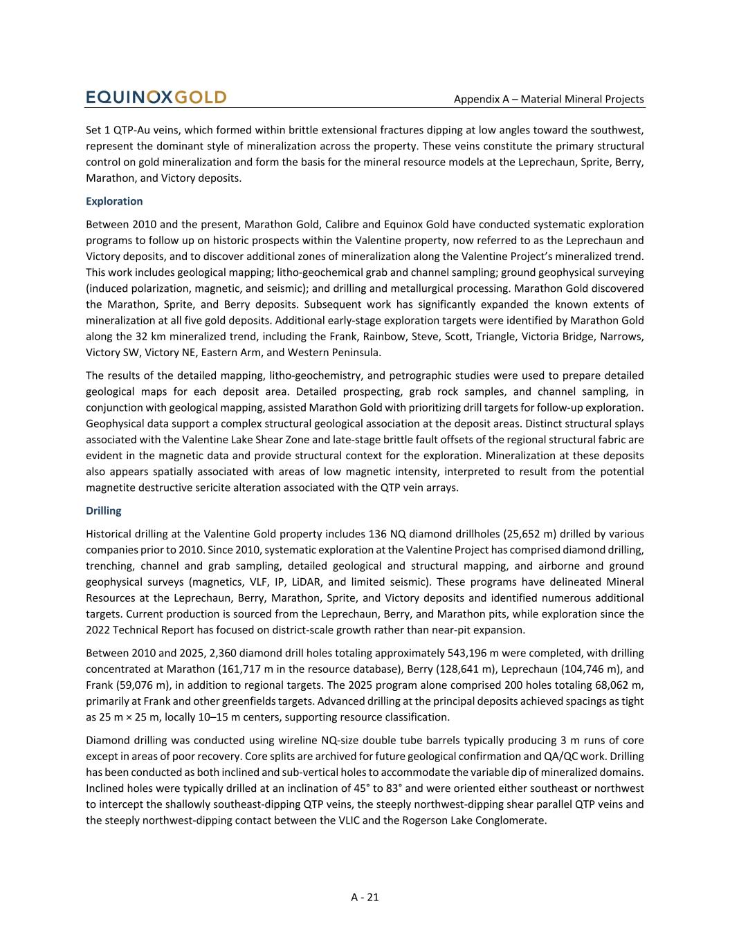 Appendix A – Material Mineral Projects A - 21 Set 1 QTP-Au veins, which formed within brittle extensional fractures dipping at low angles toward the southwest, represent the dominant style of mineralization across the property. These veins constitute the primary structural control on gold mineralization and form the basis for the mineral resource models at the Leprechaun, Sprite, Berry, Marathon, and Victory deposits. Exploration Between 2010 and the present, Marathon Gold, Calibre and Equinox Gold have conducted systematic exploration programs to follow up on historic prospects within the Valentine property, now referred to as the Leprechaun and Victory deposits, and to discover additional zones of mineralization along the Valentine Project’s mineralized trend. This work includes geological mapping; litho-geochemical grab and channel sampling; ground geophysical surveying (induced polarization, magnetic, and seismic); and drilling and metallurgical processing. Marathon Gold discovered the Marathon, Sprite, and Berry deposits. Subsequent work has significantly expanded the known extents of mineralization at all five gold deposits. Additional early-stage exploration targets were identified by Marathon Gold along the 32 km mineralized trend, including the Frank, Rainbow, Steve, Scott, Triangle, Victoria Bridge, Narrows, Victory SW, Victory NE, Eastern Arm, and Western Peninsula. The results of the detailed mapping, litho-geochemistry, and petrographic studies were used to prepare detailed geological maps for each deposit area. Detailed prospecting, grab rock samples, and channel sampling, in conjunction with geological mapping, assisted Marathon Gold with prioritizing drill targets for follow-up exploration. Geophysical data support a complex structural geological association at the deposit areas. Distinct structural splays associated with the Valentine Lake Shear Zone and late-stage brittle fault offsets of the regional structural fabric are evident in the magnetic data and provide structural context for the exploration. Mineralization at these deposits also appears spatially associated with areas of low magnetic intensity, interpreted to result from the potential magnetite destructive sericite alteration associated with the QTP vein arrays. Drilling Historical drilling at the Valentine Gold property includes 136 NQ diamond drillholes (25,652 m) drilled by various companies prior to 2010. Since 2010, systematic exploration at the Valentine Project has comprised diamond drilling, trenching, channel and grab sampling, detailed geological and structural mapping, and airborne and ground geophysical surveys (magnetics, VLF, IP, LiDAR, and limited seismic). These programs have delineated Mineral Resources at the Leprechaun, Berry, Marathon, Sprite, and Victory deposits and identified numerous additional targets. Current production is sourced from the Leprechaun, Berry, and Marathon pits, while exploration since the 2022 Technical Report has focused on district-scale growth rather than near-pit expansion. Between 2010 and 2025, 2,360 diamond drill holes totaling approximately 543,196 m were completed, with drilling concentrated at Marathon (161,717 m in the resource database), Berry (128,641 m), Leprechaun (104,746 m), and Frank (59,076 m), in addition to regional targets. The 2025 program alone comprised 200 holes totaling 68,062 m, primarily at Frank and other greenfields targets. Advanced drilling at the principal deposits achieved spacings as tight as 25 m × 25 m, locally 10–15 m centers, supporting resource classification. Diamond drilling was conducted using wireline NQ-size double tube barrels typically producing 3 m runs of core except in areas of poor recovery. Core splits are archived for future geological confirmation and QA/QC work. Drilling has been conducted as both inclined and sub-vertical holes to accommodate the variable dip of mineralized domains. Inclined holes were typically drilled at an inclination of 45° to 83° and were oriented either southeast or northwest to intercept the shallowly southeast-dipping QTP veins, the steeply northwest-dipping shear parallel QTP veins and the steeply northwest-dipping contact between the VLIC and the Rogerson Lake Conglomerate.