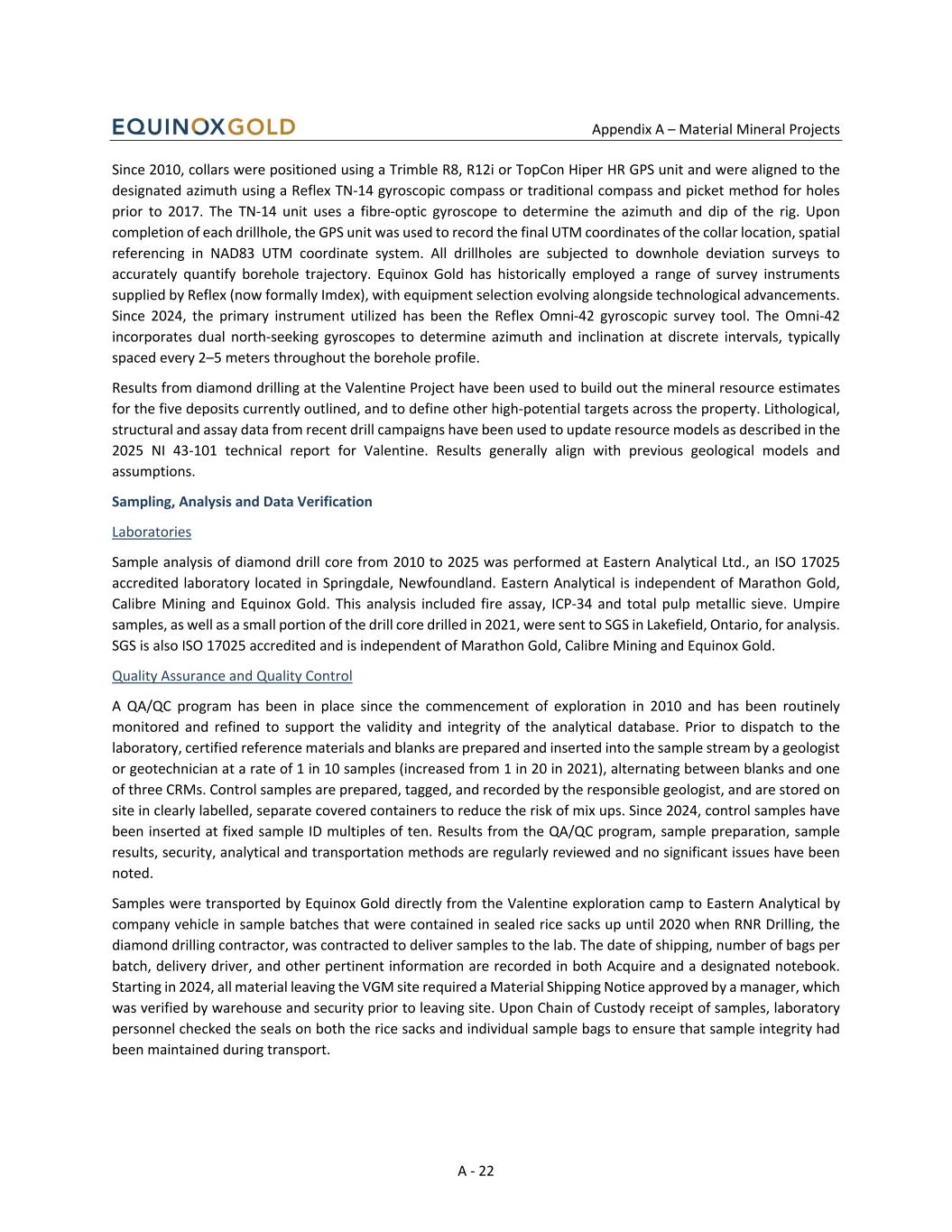 Appendix A – Material Mineral Projects A - 22 Since 2010, collars were positioned using a Trimble R8, R12i or TopCon Hiper HR GPS unit and were aligned to the designated azimuth using a Reflex TN-14 gyroscopic compass or traditional compass and picket method for holes prior to 2017. The TN-14 unit uses a fibre-optic gyroscope to determine the azimuth and dip of the rig. Upon completion of each drillhole, the GPS unit was used to record the final UTM coordinates of the collar location, spatial referencing in NAD83 UTM coordinate system. All drillholes are subjected to downhole deviation surveys to accurately quantify borehole trajectory. Equinox Gold has historically employed a range of survey instruments supplied by Reflex (now formally Imdex), with equipment selection evolving alongside technological advancements. Since 2024, the primary instrument utilized has been the Reflex Omni-42 gyroscopic survey tool. The Omni-42 incorporates dual north-seeking gyroscopes to determine azimuth and inclination at discrete intervals, typically spaced every 2–5 meters throughout the borehole profile. Results from diamond drilling at the Valentine Project have been used to build out the mineral resource estimates for the five deposits currently outlined, and to define other high-potential targets across the property. Lithological, structural and assay data from recent drill campaigns have been used to update resource models as described in the 2025 NI 43-101 technical report for Valentine. Results generally align with previous geological models and assumptions. Sampling, Analysis and Data Verification Laboratories Sample analysis of diamond drill core from 2010 to 2025 was performed at Eastern Analytical Ltd., an ISO 17025 accredited laboratory located in Springdale, Newfoundland. Eastern Analytical is independent of Marathon Gold, Calibre Mining and Equinox Gold. This analysis included fire assay, ICP-34 and total pulp metallic sieve. Umpire samples, as well as a small portion of the drill core drilled in 2021, were sent to SGS in Lakefield, Ontario, for analysis. SGS is also ISO 17025 accredited and is independent of Marathon Gold, Calibre Mining and Equinox Gold. Quality Assurance and Quality Control A QA/QC program has been in place since the commencement of exploration in 2010 and has been routinely monitored and refined to support the validity and integrity of the analytical database. Prior to dispatch to the laboratory, certified reference materials and blanks are prepared and inserted into the sample stream by a geologist or geotechnician at a rate of 1 in 10 samples (increased from 1 in 20 in 2021), alternating between blanks and one of three CRMs. Control samples are prepared, tagged, and recorded by the responsible geologist, and are stored on site in clearly labelled, separate covered containers to reduce the risk of mix ups. Since 2024, control samples have been inserted at fixed sample ID multiples of ten. Results from the QA/QC program, sample preparation, sample results, security, analytical and transportation methods are regularly reviewed and no significant issues have been noted. Samples were transported by Equinox Gold directly from the Valentine exploration camp to Eastern Analytical by company vehicle in sample batches that were contained in sealed rice sacks up until 2020 when RNR Drilling, the diamond drilling contractor, was contracted to deliver samples to the lab. The date of shipping, number of bags per batch, delivery driver, and other pertinent information are recorded in both Acquire and a designated notebook. Starting in 2024, all material leaving the VGM site required a Material Shipping Notice approved by a manager, which was verified by warehouse and security prior to leaving site. Upon Chain of Custody receipt of samples, laboratory personnel checked the seals on both the rice sacks and individual sample bags to ensure that sample integrity had been maintained during transport.