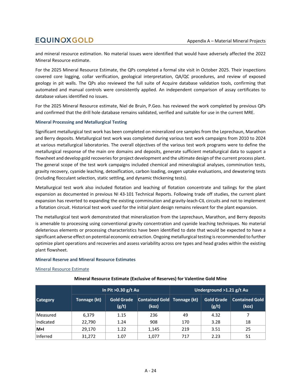 Appendix A – Material Mineral Projects A - 24 and mineral resource estimation. No material issues were identified that would have adversely affected the 2022 Mineral Resource estimate. For the 2025 Mineral Resource Estimate, the QPs completed a formal site visit in October 2025. Their inspections covered core logging, collar verification, geological interpretation, QA/QC procedures, and review of exposed geology in pit walls. The QPs also reviewed the full suite of Acquire database validation tools, confirming that automated and manual controls were consistently applied. An independent comparison of assay certificates to database values identified no issues. For the 2025 Mineral Resource estimate, Niel de Bruin, P.Geo. has reviewed the work completed by previous QPs and confirmed that the drill hole database remains validated, verified and suitable for use in the current MRE. Mineral Processing and Metallurgical Testing Significant metallurgical test work has been completed on mineralized ore samples from the Leprechaun, Marathon and Berry deposits. Metallurgical test work was completed during various test work campaigns from 2010 to 2024 at various metallurgical laboratories. The overall objectives of the various test work programs were to define the metallurgical response of the main ore domains and deposits, generate sufficient metallurgical data to support a flowsheet and develop gold recoveries for project development and the ultimate design of the current process plant. The general scope of the test work campaigns included chemical and mineralogical analyses, comminution tests, gravity recovery, cyanide leaching, detoxification, carbon loading, oxygen uptake evaluations, and dewatering tests (including flocculant selection, static settling, and dynamic thickening tests). Metallurgical test work also included flotation and leaching of flotation concentrate and tailings for the plant expansion as documented in previous NI 43-101 Technical Reports. Following trade off studies, the current plant expansion has reverted to expanding the existing comminution and gravity-leach-CIL circuits and not to implement a flotation circuit. Historical test work used for the initial plant design remains relevant for the plant expansion. The metallurgical test work demonstrated that mineralization from the Leprechaun, Marathon, and Berry deposits is amenable to processing using conventional gravity concentration and cyanide leaching techniques. No material deleterious elements or processing characteristics have been identified to date that would be expected to have a significant adverse effect on potential economic extraction. Ongoing metallurgical testing is recommended to further optimize plant operations and recoveries and assess variability across ore types and head grades within the existing plant flowsheet. Mineral Reserve and Mineral Resource Estimates Mineral Resource Estimate Mineral Resource Estimate (Exclusive of Reserves) for Valentine Gold Mine Category In Pit >0.30 g/t Au Underground >1.21 g/t Au Tonnage (kt) Gold Grade (g/t) Contained Gold (koz) Tonnage (kt) Gold Grade (g/t) Contained Gold (koz) Measured 6,379 1.15 236 49 4.32 7 Indicated 22,790 1.24 908 170 3.28 18 M+I 29,170 1.22 1,145 219 3.51 25 Inferred 31,272 1.07 1,077 717 2.23 51