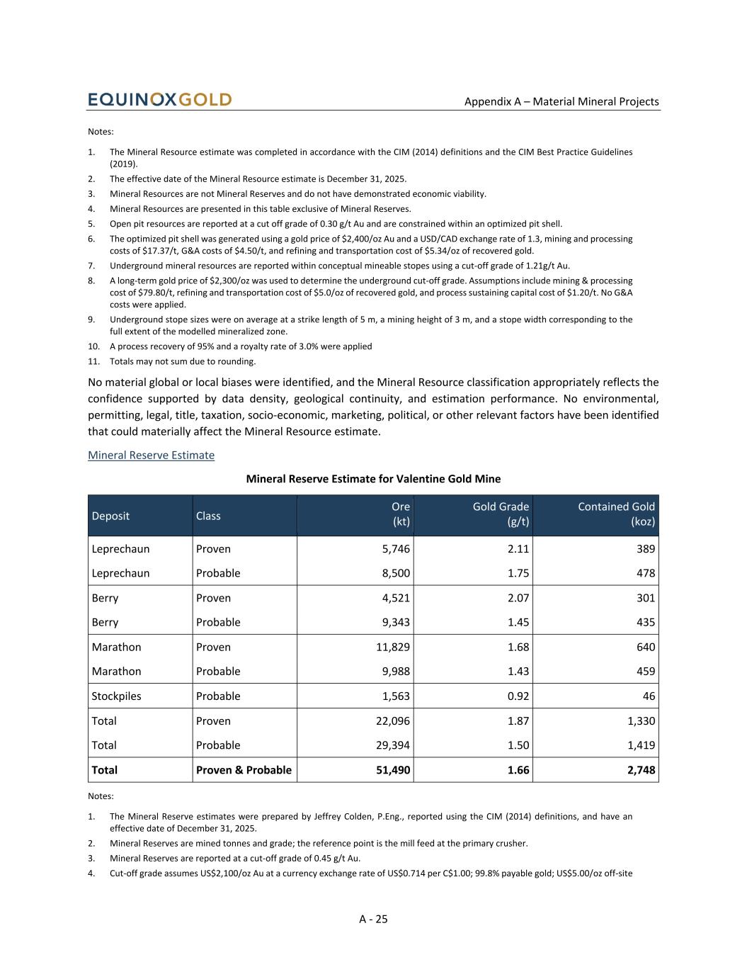 Appendix A – Material Mineral Projects A - 25 Notes: 1. The Mineral Resource estimate was completed in accordance with the CIM (2014) definitions and the CIM Best Practice Guidelines (2019). 2. The effective date of the Mineral Resource estimate is December 31, 2025. 3. Mineral Resources are not Mineral Reserves and do not have demonstrated economic viability. 4. Mineral Resources are presented in this table exclusive of Mineral Reserves. 5. Open pit resources are reported at a cut off grade of 0.30 g/t Au and are constrained within an optimized pit shell. 6. The optimized pit shell was generated using a gold price of $2,400/oz Au and a USD/CAD exchange rate of 1.3, mining and processing costs of $17.37/t, G&A costs of $4.50/t, and refining and transportation cost of $5.34/oz of recovered gold. 7. Underground mineral resources are reported within conceptual mineable stopes using a cut-off grade of 1.21g/t Au. 8. A long-term gold price of $2,300/oz was used to determine the underground cut-off grade. Assumptions include mining & processing cost of $79.80/t, refining and transportation cost of $5.0/oz of recovered gold, and process sustaining capital cost of $1.20/t. No G&A costs were applied. 9. Underground stope sizes were on average at a strike length of 5 m, a mining height of 3 m, and a stope width corresponding to the full extent of the modelled mineralized zone. 10. A process recovery of 95% and a royalty rate of 3.0% were applied 11. Totals may not sum due to rounding. No material global or local biases were identified, and the Mineral Resource classification appropriately reflects the confidence supported by data density, geological continuity, and estimation performance. No environmental, permitting, legal, title, taxation, socio-economic, marketing, political, or other relevant factors have been identified that could materially affect the Mineral Resource estimate. Mineral Reserve Estimate Mineral Reserve Estimate for Valentine Gold Mine Deposit Class Ore (kt) Gold Grade (g/t) Contained Gold (koz) Leprechaun Proven 5,746 2.11 389 Leprechaun Probable 8,500 1.75 478 Berry Proven 4,521 2.07 301 Berry Probable 9,343 1.45 435 Marathon Proven 11,829 1.68 640 Marathon Probable 9,988 1.43 459 Stockpiles Probable 1,563 0.92 46 Total Proven 22,096 1.87 1,330 Total Probable 29,394 1.50 1,419 Total Proven & Probable 51,490 1.66 2,748 Notes: 1. The Mineral Reserve estimates were prepared by Jeffrey Colden, P.Eng., reported using the CIM (2014) definitions, and have an effective date of December 31, 2025. 2. Mineral Reserves are mined tonnes and grade; the reference point is the mill feed at the primary crusher. 3. Mineral Reserves are reported at a cut-off grade of 0.45 g/t Au. 4. Cut-off grade assumes US$2,100/oz Au at a currency exchange rate of US$0.714 per C$1.00; 99.8% payable gold; US$5.00/oz off-site