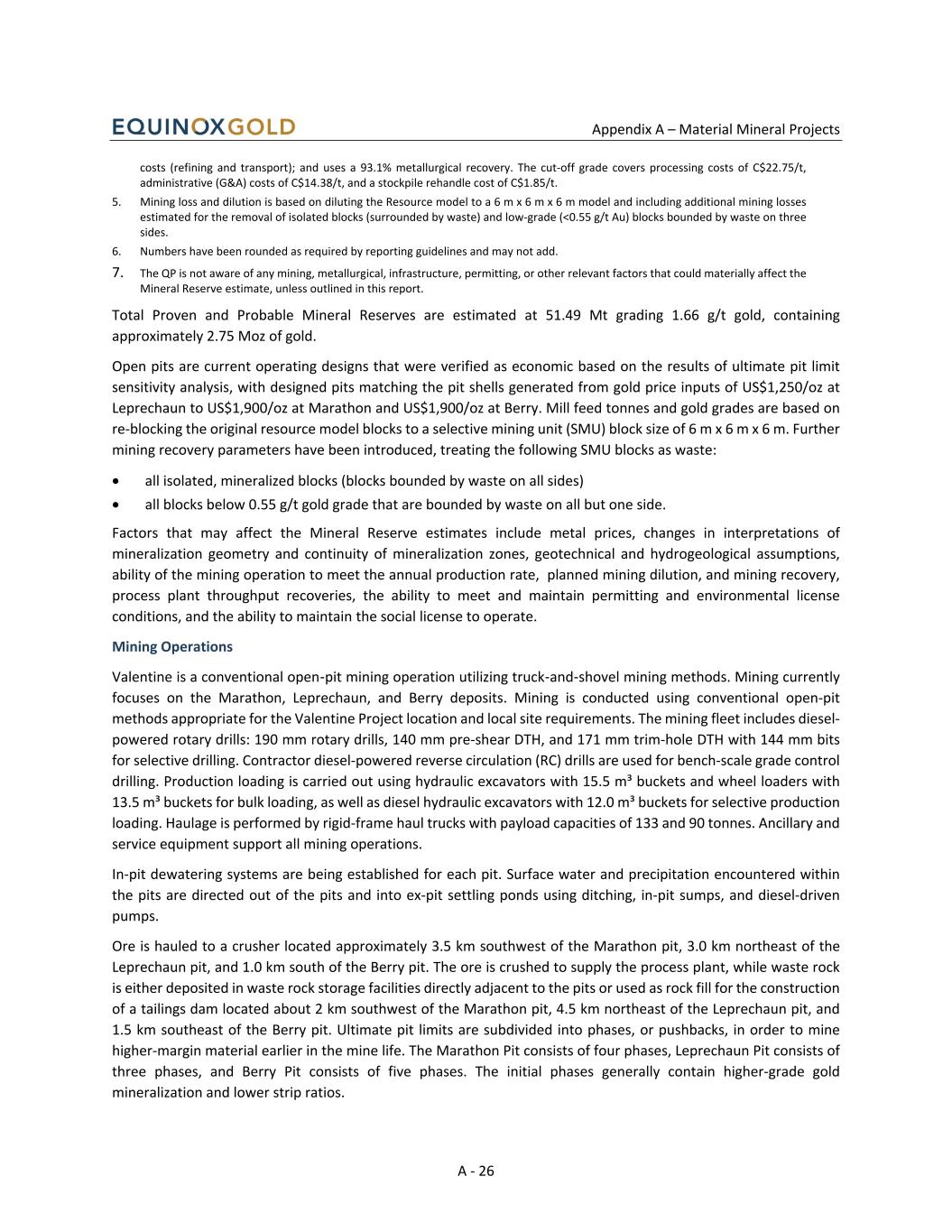 Appendix A – Material Mineral Projects A - 26 costs (refining and transport); and uses a 93.1% metallurgical recovery. The cut-off grade covers processing costs of C$22.75/t, administrative (G&A) costs of C$14.38/t, and a stockpile rehandle cost of C$1.85/t. 5. Mining loss and dilution is based on diluting the Resource model to a 6 m x 6 m x 6 m model and including additional mining losses estimated for the removal of isolated blocks (surrounded by waste) and low-grade (<0.55 g/t Au) blocks bounded by waste on three sides. 6. Numbers have been rounded as required by reporting guidelines and may not add. 7. The QP is not aware of any mining, metallurgical, infrastructure, permitting, or other relevant factors that could materially affect the Mineral Reserve estimate, unless outlined in this report. Total Proven and Probable Mineral Reserves are estimated at 51.49 Mt grading 1.66 g/t gold, containing approximately 2.75 Moz of gold. Open pits are current operating designs that were verified as economic based on the results of ultimate pit limit sensitivity analysis, with designed pits matching the pit shells generated from gold price inputs of US$1,250/oz at Leprechaun to US$1,900/oz at Marathon and US$1,900/oz at Berry. Mill feed tonnes and gold grades are based on re-blocking the original resource model blocks to a selective mining unit (SMU) block size of 6 m x 6 m x 6 m. Further mining recovery parameters have been introduced, treating the following SMU blocks as waste: • all isolated, mineralized blocks (blocks bounded by waste on all sides) • all blocks below 0.55 g/t gold grade that are bounded by waste on all but one side. Factors that may affect the Mineral Reserve estimates include metal prices, changes in interpretations of mineralization geometry and continuity of mineralization zones, geotechnical and hydrogeological assumptions, ability of the mining operation to meet the annual production rate, planned mining dilution, and mining recovery, process plant throughput recoveries, the ability to meet and maintain permitting and environmental license conditions, and the ability to maintain the social license to operate. Mining Operations Valentine is a conventional open‑pit mining operation utilizing truck‑and‑shovel mining methods. Mining currently focuses on the Marathon, Leprechaun, and Berry deposits. Mining is conducted using conventional open-pit methods appropriate for the Valentine Project location and local site requirements. The mining fleet includes diesel- powered rotary drills: 190 mm rotary drills, 140 mm pre-shear DTH, and 171 mm trim-hole DTH with 144 mm bits for selective drilling. Contractor diesel-powered reverse circulation (RC) drills are used for bench-scale grade control drilling. Production loading is carried out using hydraulic excavators with 15.5 m³ buckets and wheel loaders with 13.5 m³ buckets for bulk loading, as well as diesel hydraulic excavators with 12.0 m³ buckets for selective production loading. Haulage is performed by rigid-frame haul trucks with payload capacities of 133 and 90 tonnes. Ancillary and service equipment support all mining operations. In-pit dewatering systems are being established for each pit. Surface water and precipitation encountered within the pits are directed out of the pits and into ex-pit settling ponds using ditching, in-pit sumps, and diesel-driven pumps. Ore is hauled to a crusher located approximately 3.5 km southwest of the Marathon pit, 3.0 km northeast of the Leprechaun pit, and 1.0 km south of the Berry pit. The ore is crushed to supply the process plant, while waste rock is either deposited in waste rock storage facilities directly adjacent to the pits or used as rock fill for the construction of a tailings dam located about 2 km southwest of the Marathon pit, 4.5 km northeast of the Leprechaun pit, and 1.5 km southeast of the Berry pit. Ultimate pit limits are subdivided into phases, or pushbacks, in order to mine higher-margin material earlier in the mine life. The Marathon Pit consists of four phases, Leprechaun Pit consists of three phases, and Berry Pit consists of five phases. The initial phases generally contain higher-grade gold mineralization and lower strip ratios.