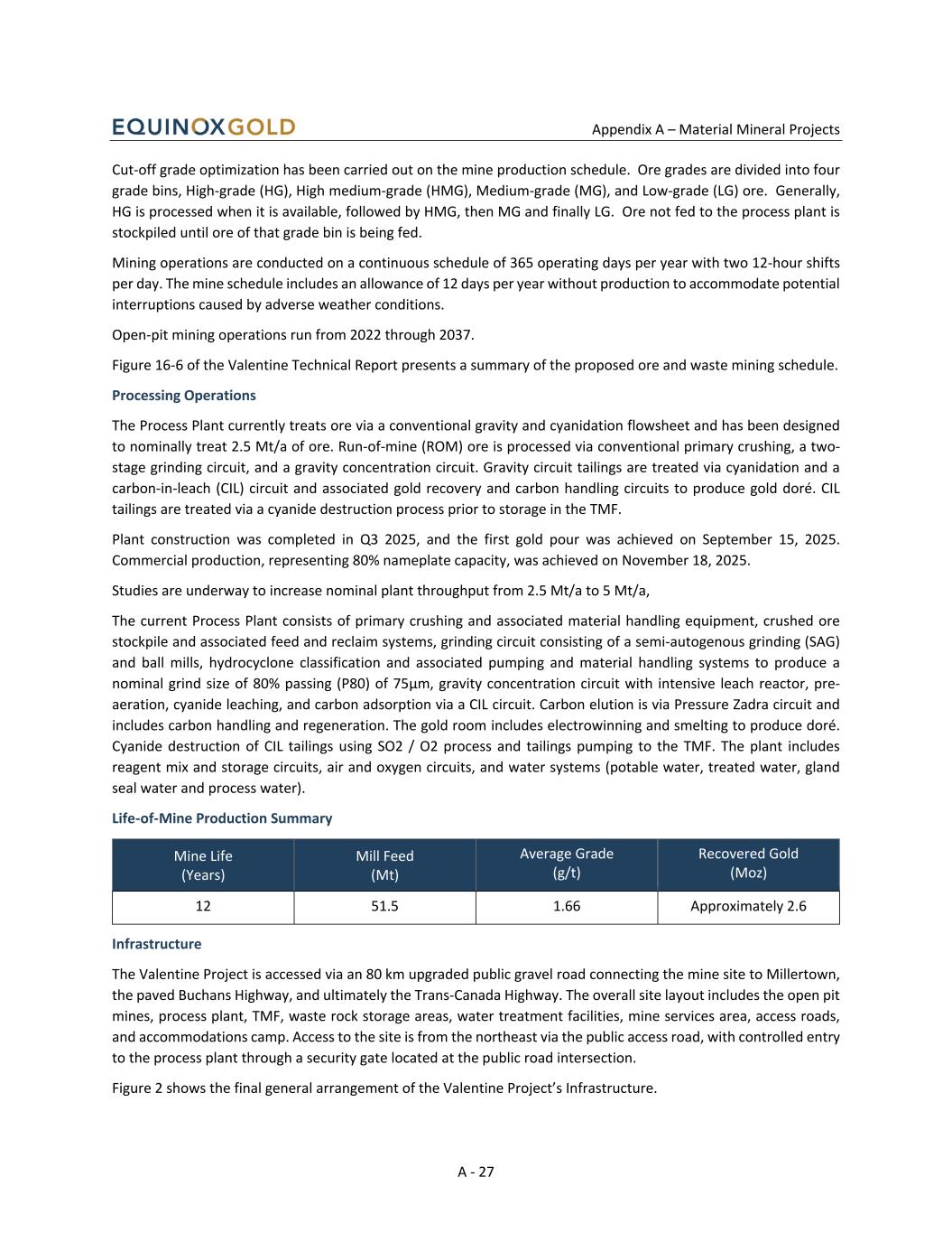 Appendix A – Material Mineral Projects A - 27 Cut-off grade optimization has been carried out on the mine production schedule. Ore grades are divided into four grade bins, High-grade (HG), High medium-grade (HMG), Medium-grade (MG), and Low-grade (LG) ore. Generally, HG is processed when it is available, followed by HMG, then MG and finally LG. Ore not fed to the process plant is stockpiled until ore of that grade bin is being fed. Mining operations are conducted on a continuous schedule of 365 operating days per year with two 12-hour shifts per day. The mine schedule includes an allowance of 12 days per year without production to accommodate potential interruptions caused by adverse weather conditions. Open-pit mining operations run from 2022 through 2037. Figure 16-6 of the Valentine Technical Report presents a summary of the proposed ore and waste mining schedule. Processing Operations The Process Plant currently treats ore via a conventional gravity and cyanidation flowsheet and has been designed to nominally treat 2.5 Mt/a of ore. Run-of-mine (ROM) ore is processed via conventional primary crushing, a two- stage grinding circuit, and a gravity concentration circuit. Gravity circuit tailings are treated via cyanidation and a carbon-in-leach (CIL) circuit and associated gold recovery and carbon handling circuits to produce gold doré. CIL tailings are treated via a cyanide destruction process prior to storage in the TMF. Plant construction was completed in Q3 2025, and the first gold pour was achieved on September 15, 2025. Commercial production, representing 80% nameplate capacity, was achieved on November 18, 2025. Studies are underway to increase nominal plant throughput from 2.5 Mt/a to 5 Mt/a, The current Process Plant consists of primary crushing and associated material handling equipment, crushed ore stockpile and associated feed and reclaim systems, grinding circuit consisting of a semi-autogenous grinding (SAG) and ball mills, hydrocyclone classification and associated pumping and material handling systems to produce a nominal grind size of 80% passing (P80) of 75μm, gravity concentration circuit with intensive leach reactor, pre- aeration, cyanide leaching, and carbon adsorption via a CIL circuit. Carbon elution is via Pressure Zadra circuit and includes carbon handling and regeneration. The gold room includes electrowinning and smelting to produce doré. Cyanide destruction of CIL tailings using SO2 / O2 process and tailings pumping to the TMF. The plant includes reagent mix and storage circuits, air and oxygen circuits, and water systems (potable water, treated water, gland seal water and process water). Life‑of‑Mine Production Summary Mine Life (Years) Mill Feed (Mt) Average Grade (g/t) Recovered Gold (Moz) 12 51.5 1.66 Approximately 2.6 Infrastructure The Valentine Project is accessed via an 80 km upgraded public gravel road connecting the mine site to Millertown, the paved Buchans Highway, and ultimately the Trans-Canada Highway. The overall site layout includes the open pit mines, process plant, TMF, waste rock storage areas, water treatment facilities, mine services area, access roads, and accommodations camp. Access to the site is from the northeast via the public access road, with controlled entry to the process plant through a security gate located at the public road intersection. Figure 2 shows the final general arrangement of the Valentine Project’s Infrastructure.