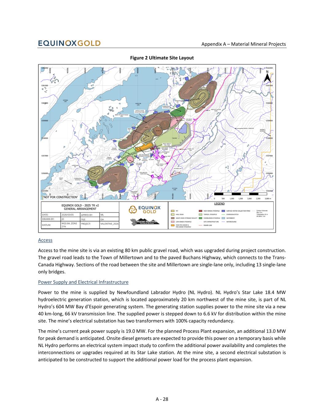 Appendix A – Material Mineral Projects A - 28 Figure 2 Ultimate Site Layout Access Access to the mine site is via an existing 80 km public gravel road, which was upgraded during project construction. The gravel road leads to the Town of Millertown and to the paved Buchans Highway, which connects to the Trans- Canada Highway. Sections of the road between the site and Millertown are single-lane only, including 13 single-lane only bridges. Power Supply and Electrical Infrastructure Power to the mine is supplied by Newfoundland Labrador Hydro (NL Hydro). NL Hydro’s Star Lake 18.4 MW hydroelectric generation station, which is located approximately 20 km northwest of the mine site, is part of NL Hydro’s 604 MW Bay d’Espoir generating system. The generating station supplies power to the mine site via a new 40 km-long, 66 kV transmission line. The supplied power is stepped down to 6.6 kV for distribution within the mine site. The mine’s electrical substation has two transformers with 100% capacity redundancy. The mine’s current peak power supply is 19.0 MW. For the planned Process Plant expansion, an additional 13.0 MW for peak demand is anticipated. Onsite diesel gensets are expected to provide this power on a temporary basis while NL Hydro performs an electrical system impact study to confirm the additional power availability and completes the interconnections or upgrades required at its Star Lake station. At the mine site, a second electrical substation is anticipated to be constructed to support the additional power load for the process plant expansion.