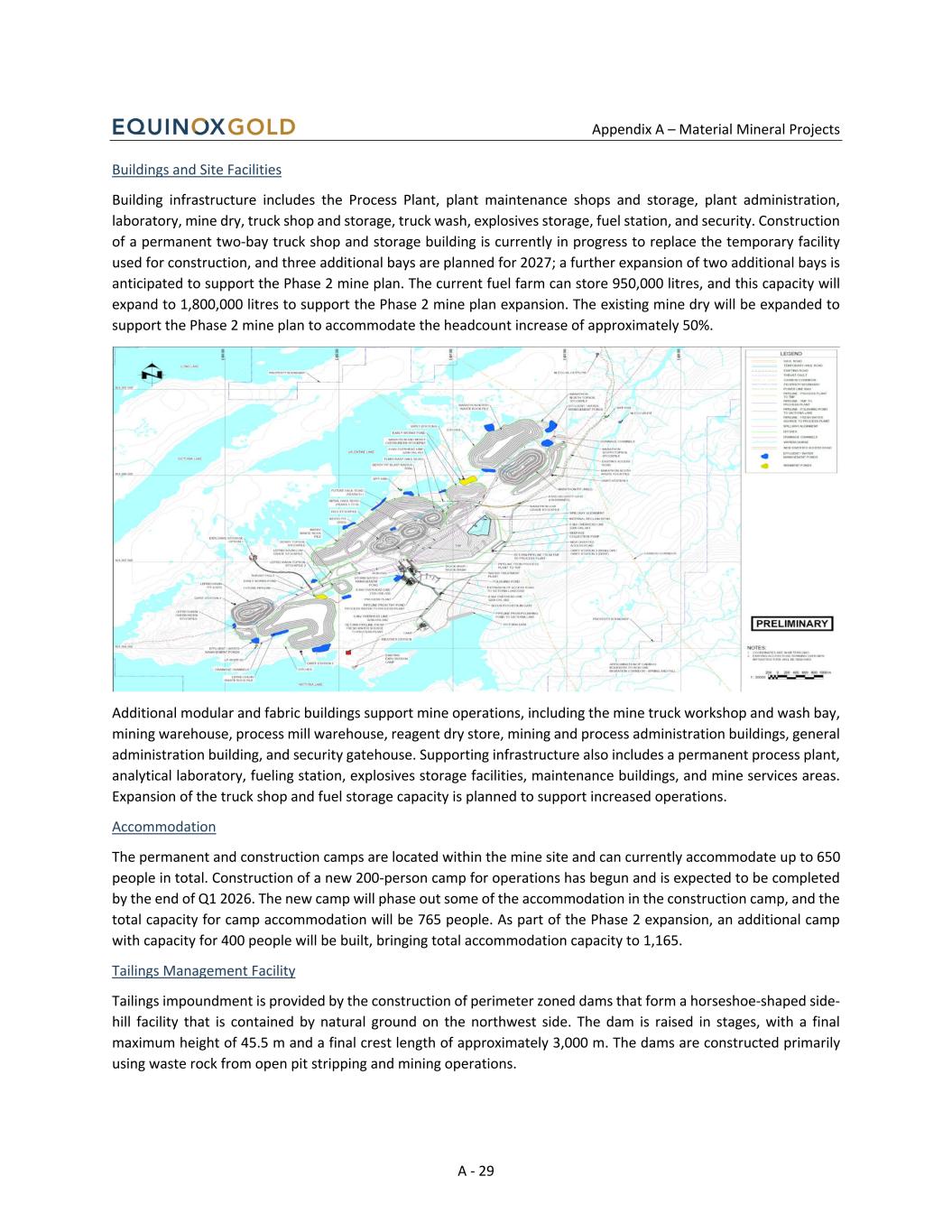 Appendix A – Material Mineral Projects A - 29 Buildings and Site Facilities Building infrastructure includes the Process Plant, plant maintenance shops and storage, plant administration, laboratory, mine dry, truck shop and storage, truck wash, explosives storage, fuel station, and security. Construction of a permanent two-bay truck shop and storage building is currently in progress to replace the temporary facility used for construction, and three additional bays are planned for 2027; a further expansion of two additional bays is anticipated to support the Phase 2 mine plan. The current fuel farm can store 950,000 litres, and this capacity will expand to 1,800,000 litres to support the Phase 2 mine plan expansion. The existing mine dry will be expanded to support the Phase 2 mine plan to accommodate the headcount increase of approximately 50%. Additional modular and fabric buildings support mine operations, including the mine truck workshop and wash bay, mining warehouse, process mill warehouse, reagent dry store, mining and process administration buildings, general administration building, and security gatehouse. Supporting infrastructure also includes a permanent process plant, analytical laboratory, fueling station, explosives storage facilities, maintenance buildings, and mine services areas. Expansion of the truck shop and fuel storage capacity is planned to support increased operations. Accommodation The permanent and construction camps are located within the mine site and can currently accommodate up to 650 people in total. Construction of a new 200-person camp for operations has begun and is expected to be completed by the end of Q1 2026. The new camp will phase out some of the accommodation in the construction camp, and the total capacity for camp accommodation will be 765 people. As part of the Phase 2 expansion, an additional camp with capacity for 400 people will be built, bringing total accommodation capacity to 1,165. Tailings Management Facility Tailings impoundment is provided by the construction of perimeter zoned dams that form a horseshoe-shaped side- hill facility that is contained by natural ground on the northwest side. The dam is raised in stages, with a final maximum height of 45.5 m and a final crest length of approximately 3,000 m. The dams are constructed primarily using waste rock from open pit stripping and mining operations.