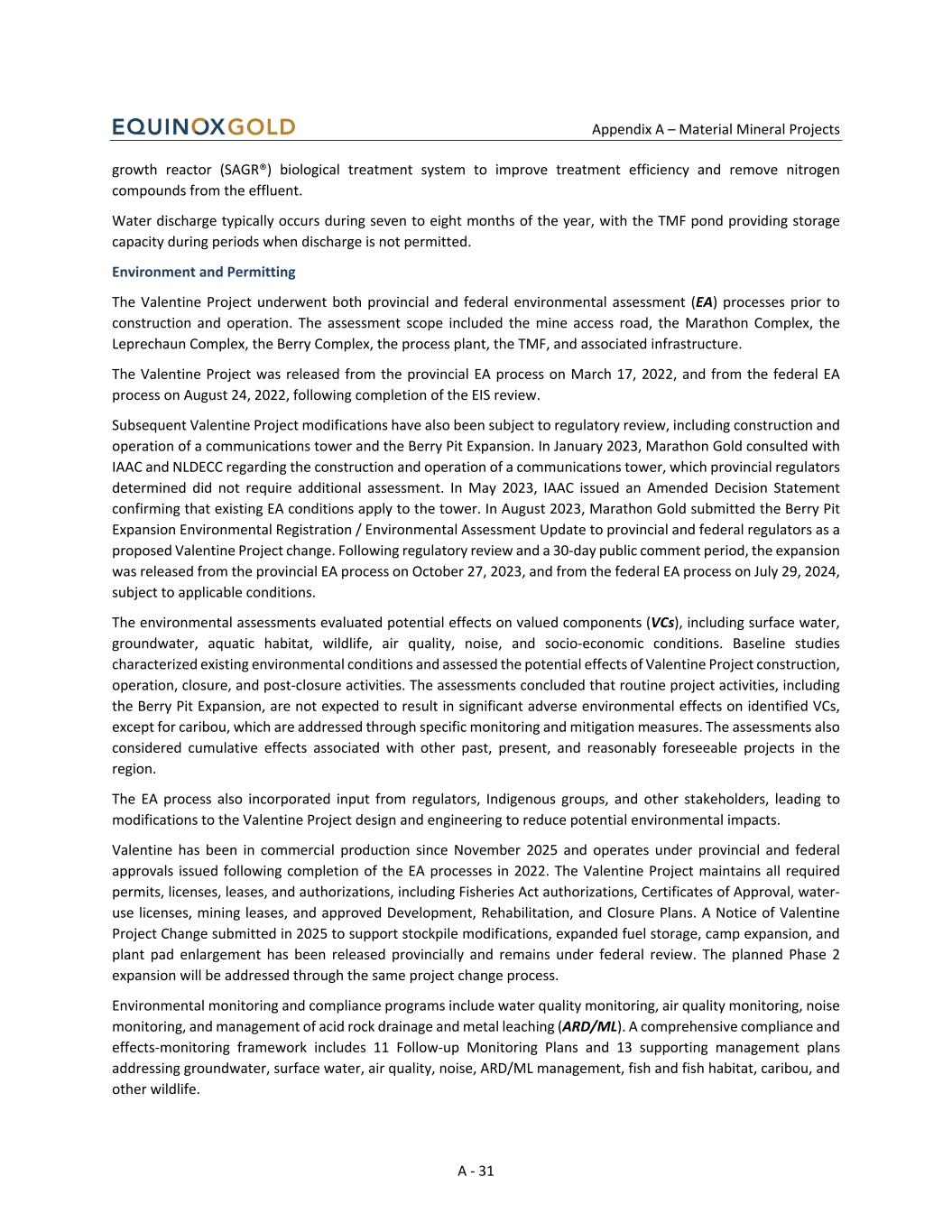 Appendix A – Material Mineral Projects A - 31 growth reactor (SAGR®) biological treatment system to improve treatment efficiency and remove nitrogen compounds from the effluent. Water discharge typically occurs during seven to eight months of the year, with the TMF pond providing storage capacity during periods when discharge is not permitted. Environment and Permitting The Valentine Project underwent both provincial and federal environmental assessment (EA) processes prior to construction and operation. The assessment scope included the mine access road, the Marathon Complex, the Leprechaun Complex, the Berry Complex, the process plant, the TMF, and associated infrastructure. The Valentine Project was released from the provincial EA process on March 17, 2022, and from the federal EA process on August 24, 2022, following completion of the EIS review. Subsequent Valentine Project modifications have also been subject to regulatory review, including construction and operation of a communications tower and the Berry Pit Expansion. In January 2023, Marathon Gold consulted with IAAC and NLDECC regarding the construction and operation of a communications tower, which provincial regulators determined did not require additional assessment. In May 2023, IAAC issued an Amended Decision Statement confirming that existing EA conditions apply to the tower. In August 2023, Marathon Gold submitted the Berry Pit Expansion Environmental Registration / Environmental Assessment Update to provincial and federal regulators as a proposed Valentine Project change. Following regulatory review and a 30-day public comment period, the expansion was released from the provincial EA process on October 27, 2023, and from the federal EA process on July 29, 2024, subject to applicable conditions. The environmental assessments evaluated potential effects on valued components (VCs), including surface water, groundwater, aquatic habitat, wildlife, air quality, noise, and socio-economic conditions. Baseline studies characterized existing environmental conditions and assessed the potential effects of Valentine Project construction, operation, closure, and post-closure activities. The assessments concluded that routine project activities, including the Berry Pit Expansion, are not expected to result in significant adverse environmental effects on identified VCs, except for caribou, which are addressed through specific monitoring and mitigation measures. The assessments also considered cumulative effects associated with other past, present, and reasonably foreseeable projects in the region. The EA process also incorporated input from regulators, Indigenous groups, and other stakeholders, leading to modifications to the Valentine Project design and engineering to reduce potential environmental impacts. Valentine has been in commercial production since November 2025 and operates under provincial and federal approvals issued following completion of the EA processes in 2022. The Valentine Project maintains all required permits, licenses, leases, and authorizations, including Fisheries Act authorizations, Certificates of Approval, water- use licenses, mining leases, and approved Development, Rehabilitation, and Closure Plans. A Notice of Valentine Project Change submitted in 2025 to support stockpile modifications, expanded fuel storage, camp expansion, and plant pad enlargement has been released provincially and remains under federal review. The planned Phase 2 expansion will be addressed through the same project change process. Environmental monitoring and compliance programs include water quality monitoring, air quality monitoring, noise monitoring, and management of acid rock drainage and metal leaching (ARD/ML). A comprehensive compliance and effects-monitoring framework includes 11 Follow-up Monitoring Plans and 13 supporting management plans addressing groundwater, surface water, air quality, noise, ARD/ML management, fish and fish habitat, caribou, and other wildlife.