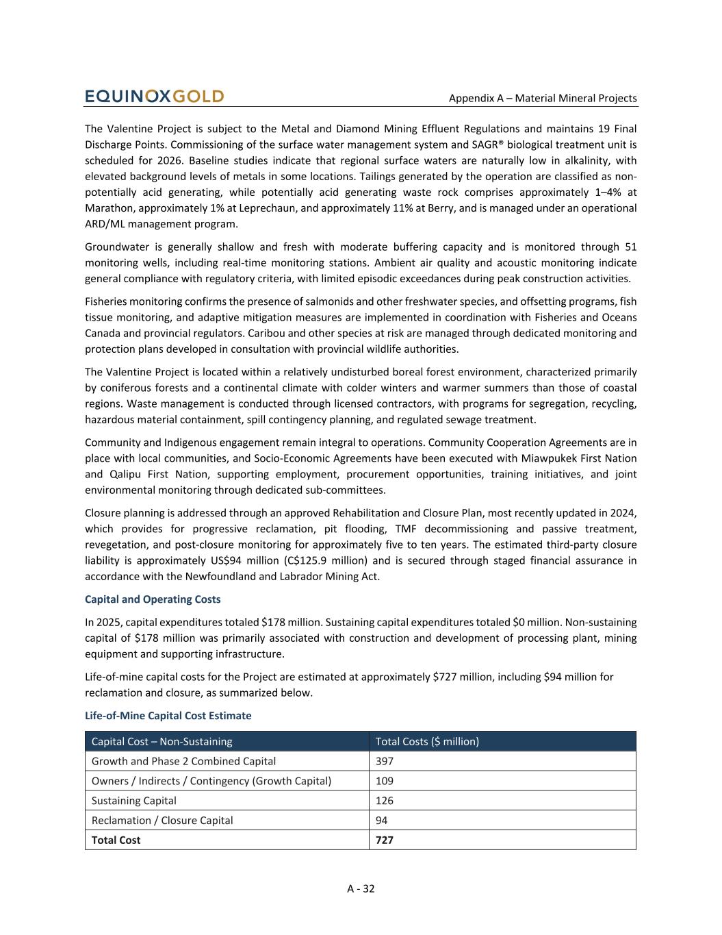Appendix A – Material Mineral Projects A - 32 The Valentine Project is subject to the Metal and Diamond Mining Effluent Regulations and maintains 19 Final Discharge Points. Commissioning of the surface water management system and SAGR® biological treatment unit is scheduled for 2026. Baseline studies indicate that regional surface waters are naturally low in alkalinity, with elevated background levels of metals in some locations. Tailings generated by the operation are classified as non- potentially acid generating, while potentially acid generating waste rock comprises approximately 1–4% at Marathon, approximately 1% at Leprechaun, and approximately 11% at Berry, and is managed under an operational ARD/ML management program. Groundwater is generally shallow and fresh with moderate buffering capacity and is monitored through 51 monitoring wells, including real-time monitoring stations. Ambient air quality and acoustic monitoring indicate general compliance with regulatory criteria, with limited episodic exceedances during peak construction activities. Fisheries monitoring confirms the presence of salmonids and other freshwater species, and offsetting programs, fish tissue monitoring, and adaptive mitigation measures are implemented in coordination with Fisheries and Oceans Canada and provincial regulators. Caribou and other species at risk are managed through dedicated monitoring and protection plans developed in consultation with provincial wildlife authorities. The Valentine Project is located within a relatively undisturbed boreal forest environment, characterized primarily by coniferous forests and a continental climate with colder winters and warmer summers than those of coastal regions. Waste management is conducted through licensed contractors, with programs for segregation, recycling, hazardous material containment, spill contingency planning, and regulated sewage treatment. Community and Indigenous engagement remain integral to operations. Community Cooperation Agreements are in place with local communities, and Socio-Economic Agreements have been executed with Miawpukek First Nation and Qalipu First Nation, supporting employment, procurement opportunities, training initiatives, and joint environmental monitoring through dedicated sub-committees. Closure planning is addressed through an approved Rehabilitation and Closure Plan, most recently updated in 2024, which provides for progressive reclamation, pit flooding, TMF decommissioning and passive treatment, revegetation, and post-closure monitoring for approximately five to ten years. The estimated third-party closure liability is approximately US$94 million (C$125.9 million) and is secured through staged financial assurance in accordance with the Newfoundland and Labrador Mining Act. Capital and Operating Costs In 2025, capital expenditures totaled $178 million. Sustaining capital expenditures totaled $0 million. Non-sustaining capital of $178 million was primarily associated with construction and development of processing plant, mining equipment and supporting infrastructure. Life-of-mine capital costs for the Project are estimated at approximately $727 million, including $94 million for reclamation and closure, as summarized below. Life-of-Mine Capital Cost Estimate Capital Cost – Non-Sustaining Total Costs ($ million) Growth and Phase 2 Combined Capital 397 Owners / Indirects / Contingency (Growth Capital) 109 Sustaining Capital 126 Reclamation / Closure Capital 94 Total Cost 727